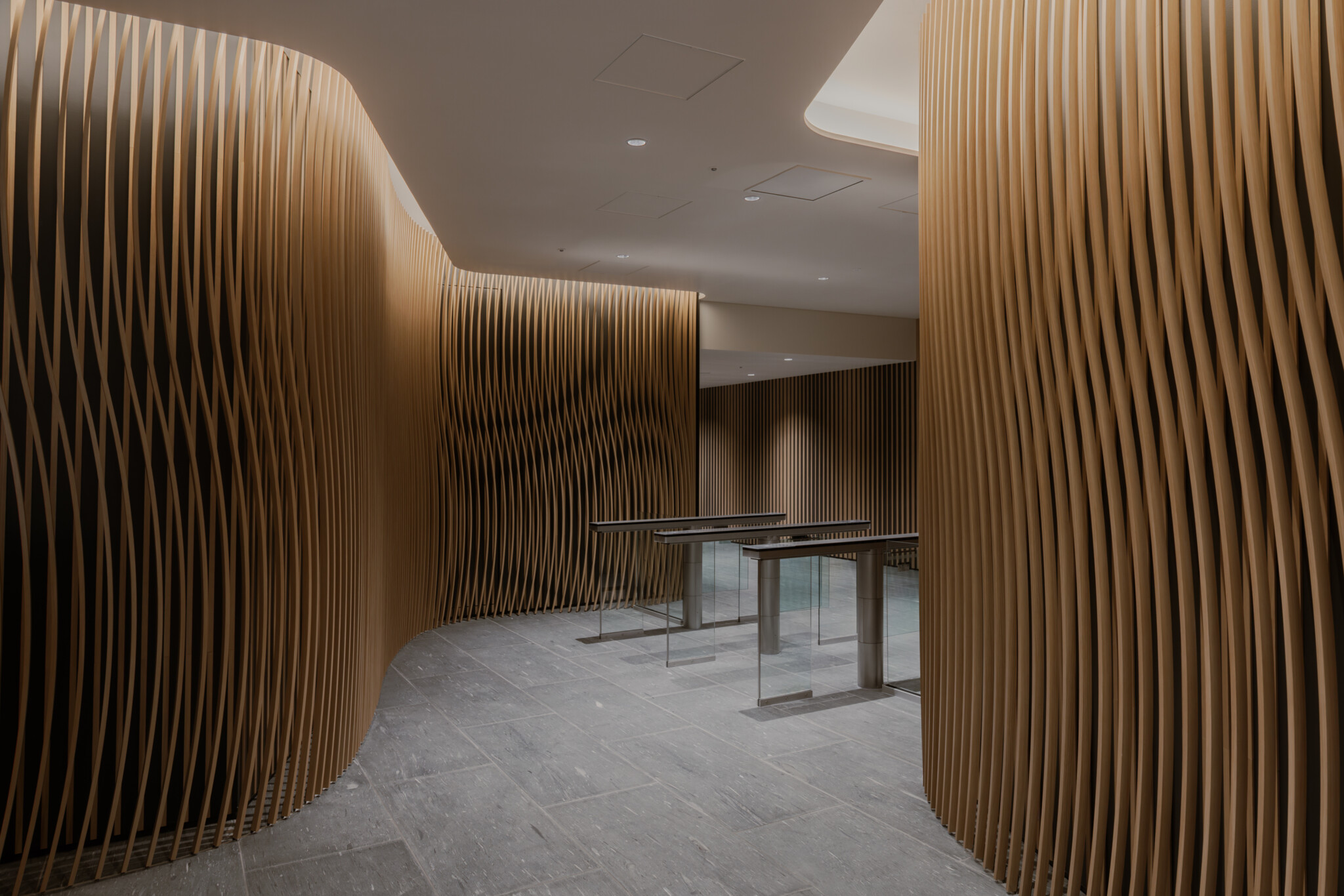 The headquarters of Tokyo MX Television, standing in front of the greenery of the Imperial Palace, was redesigned as a tunnel space of “green moiré.” I envisioned the broadcasting station as a tunnel that connects the ordinary world with another, alternate realm. The inner surface of the tunnel is composed of a two-layer system: floating S-shaped louvers and vertical louvers behind them. As one progresses deeper into the tunnel, these two layers interfere with each other to generate moiré patterns, evoking the sensation of moving through a forest cave or traveling through the inner core of tree trunks. Using the vocabulary of louvers, I aimed to create a dynamic, organic, and ecological experience.