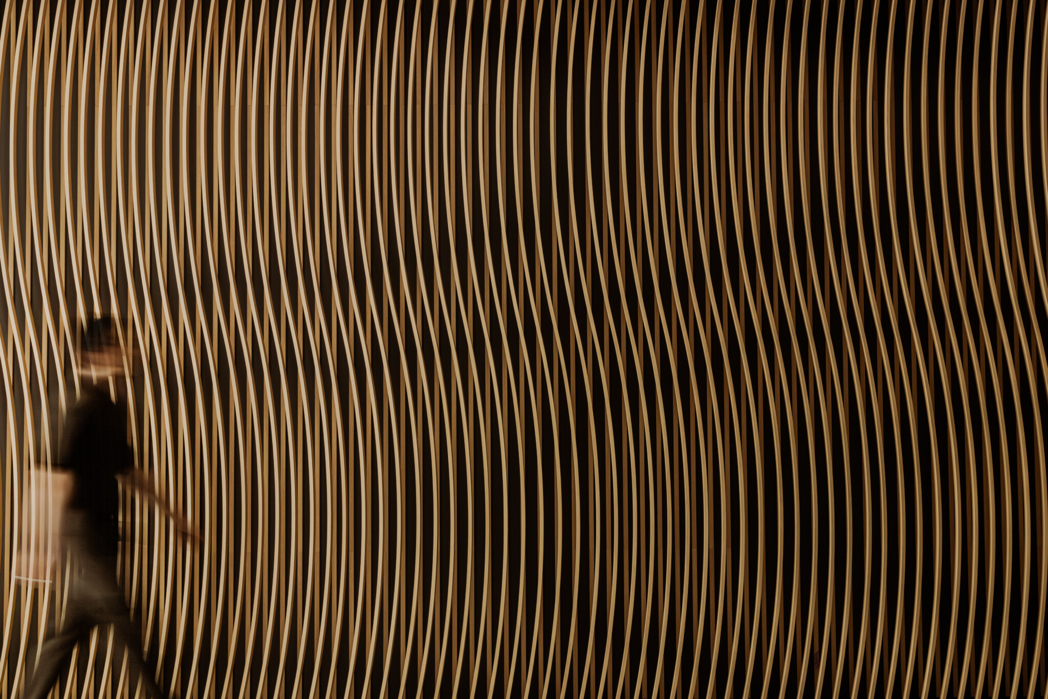 This was a challenge to express “depth” and “movement” within a limited space and with a limited budget. While moiré effects using glass or thin screens are common, achieving a three-dimensional moiré with real materials is a rare accomplishment.