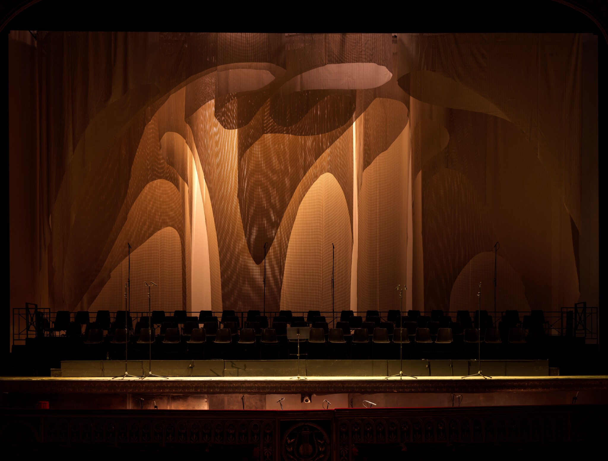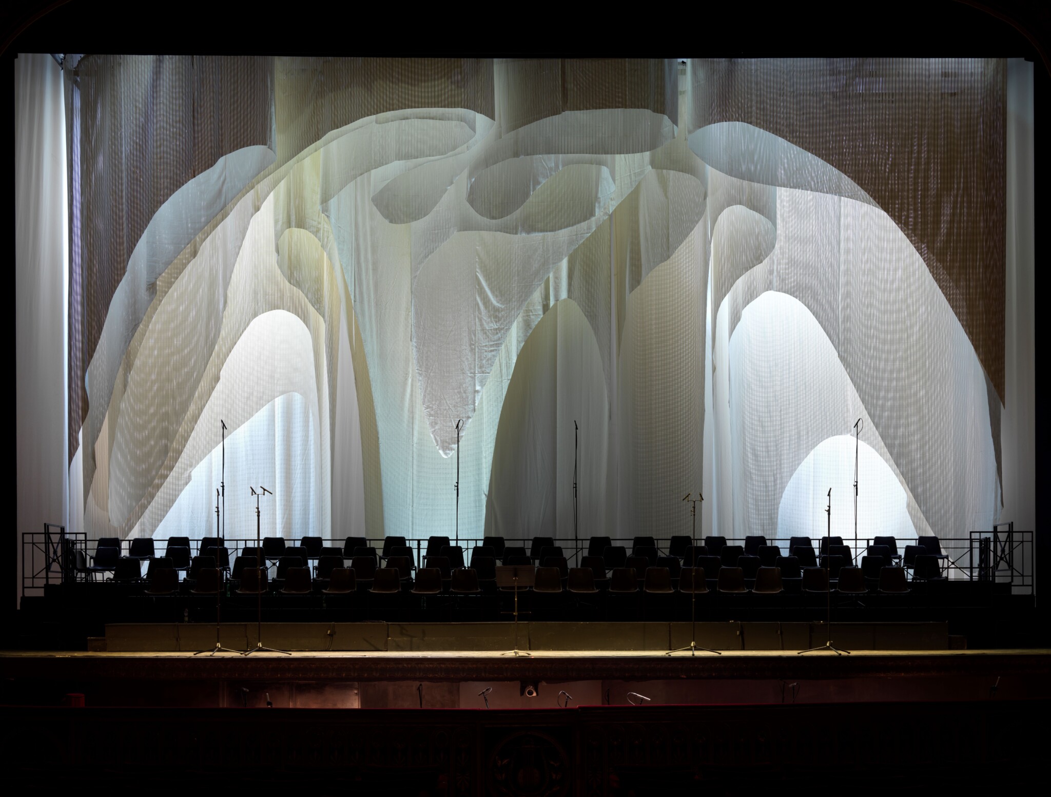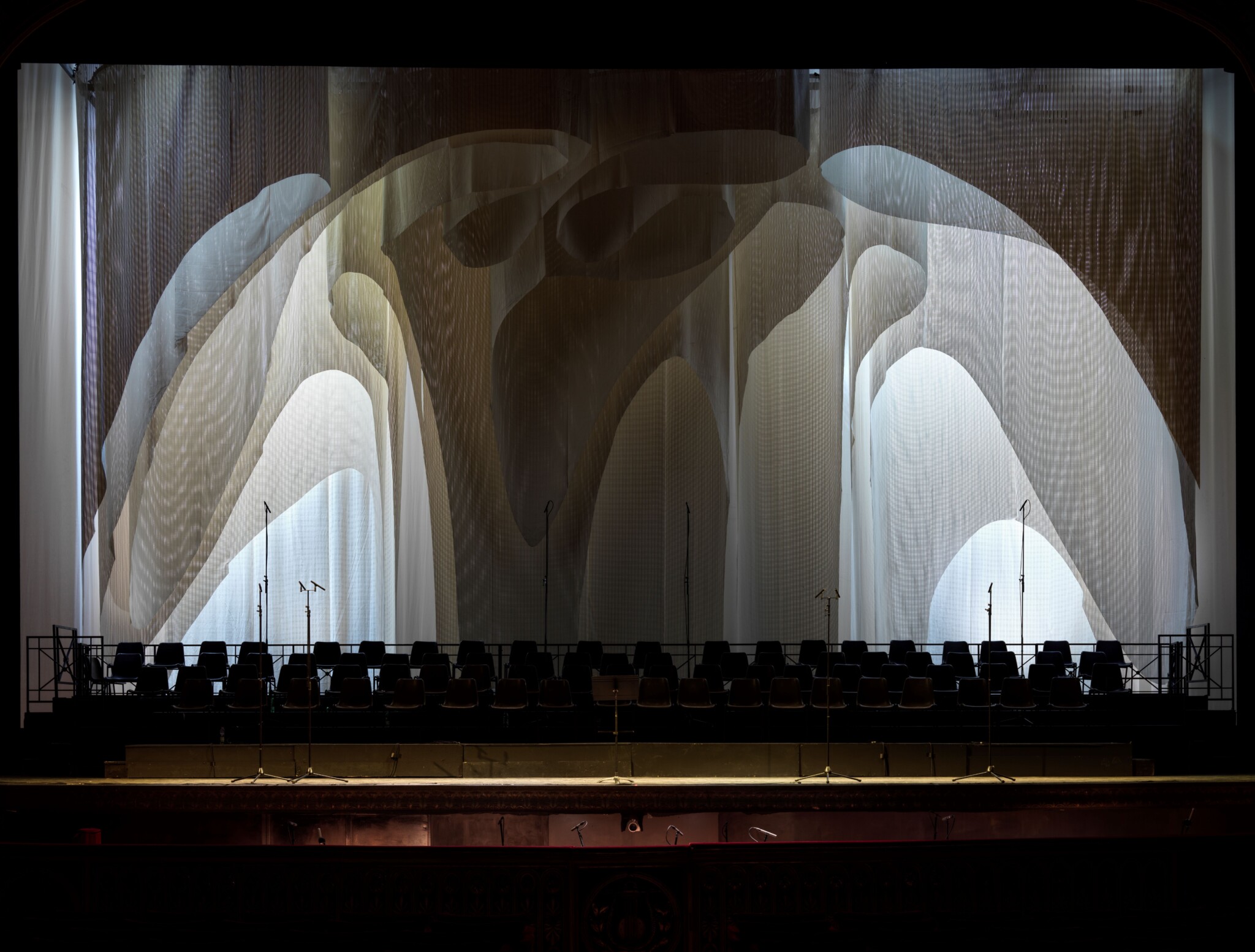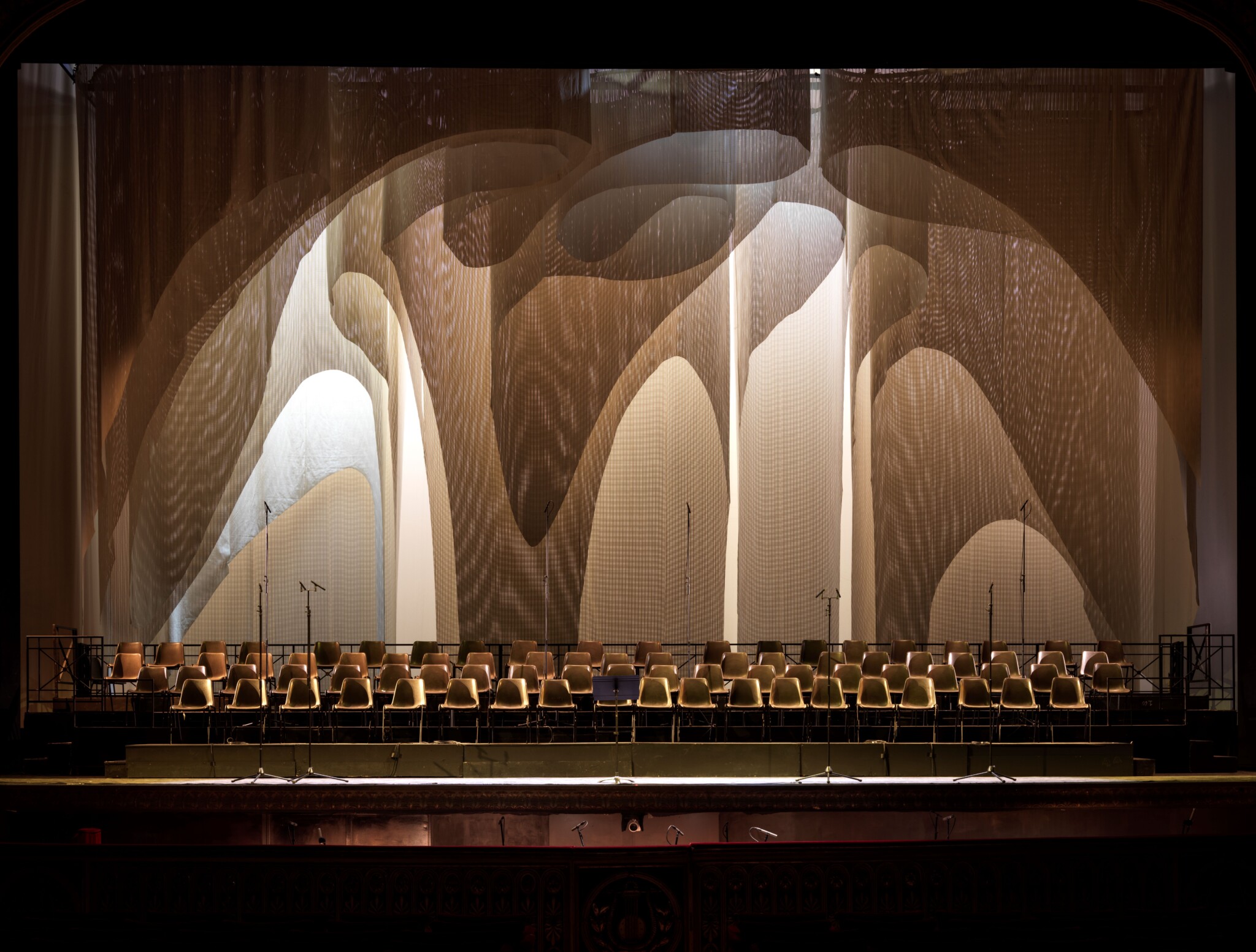 The cloth set is composed of special fabric with countless holes made of recycled polyester developed by ALCANTARA. This unique material has a transparency and matte texture that dynamically changes its expression depending on the lighting, and even has the effect of changing the depth of the space. The pattern of the fabric hanging was based on an algorithm called “Differential Growth,” which is common in nature. Our design intent was to pair history with the contemporary: The opera, first performed in 1857 in a theater built in 1737, has been brought back to life with the abstract beauty of modern materials and technology.