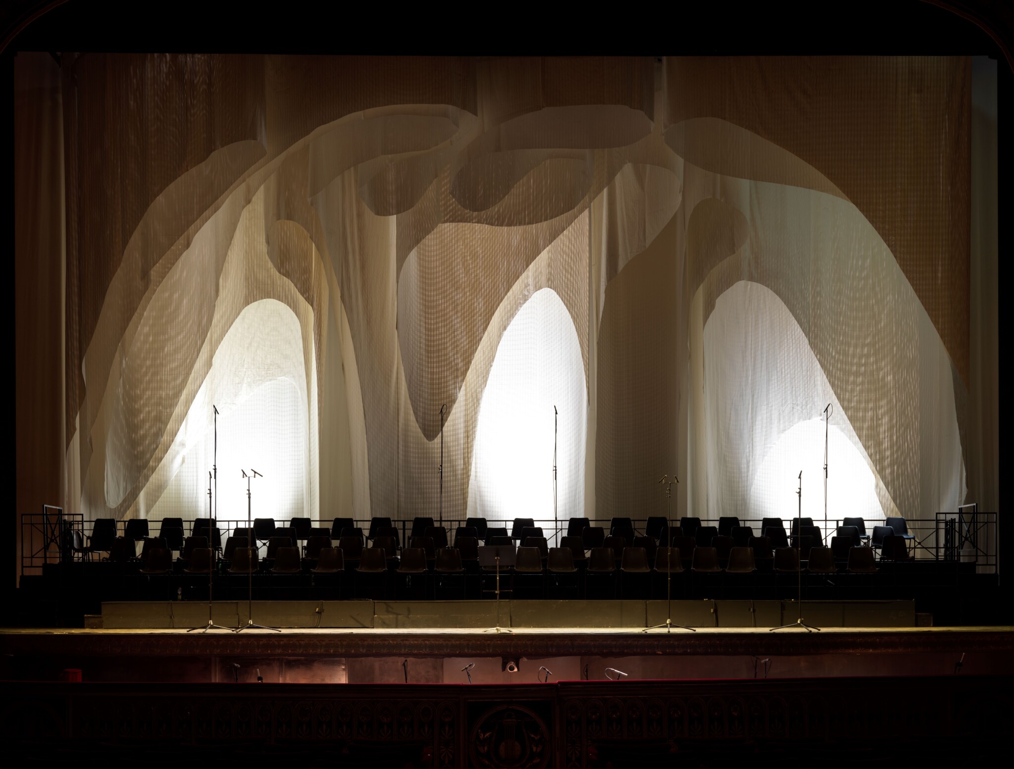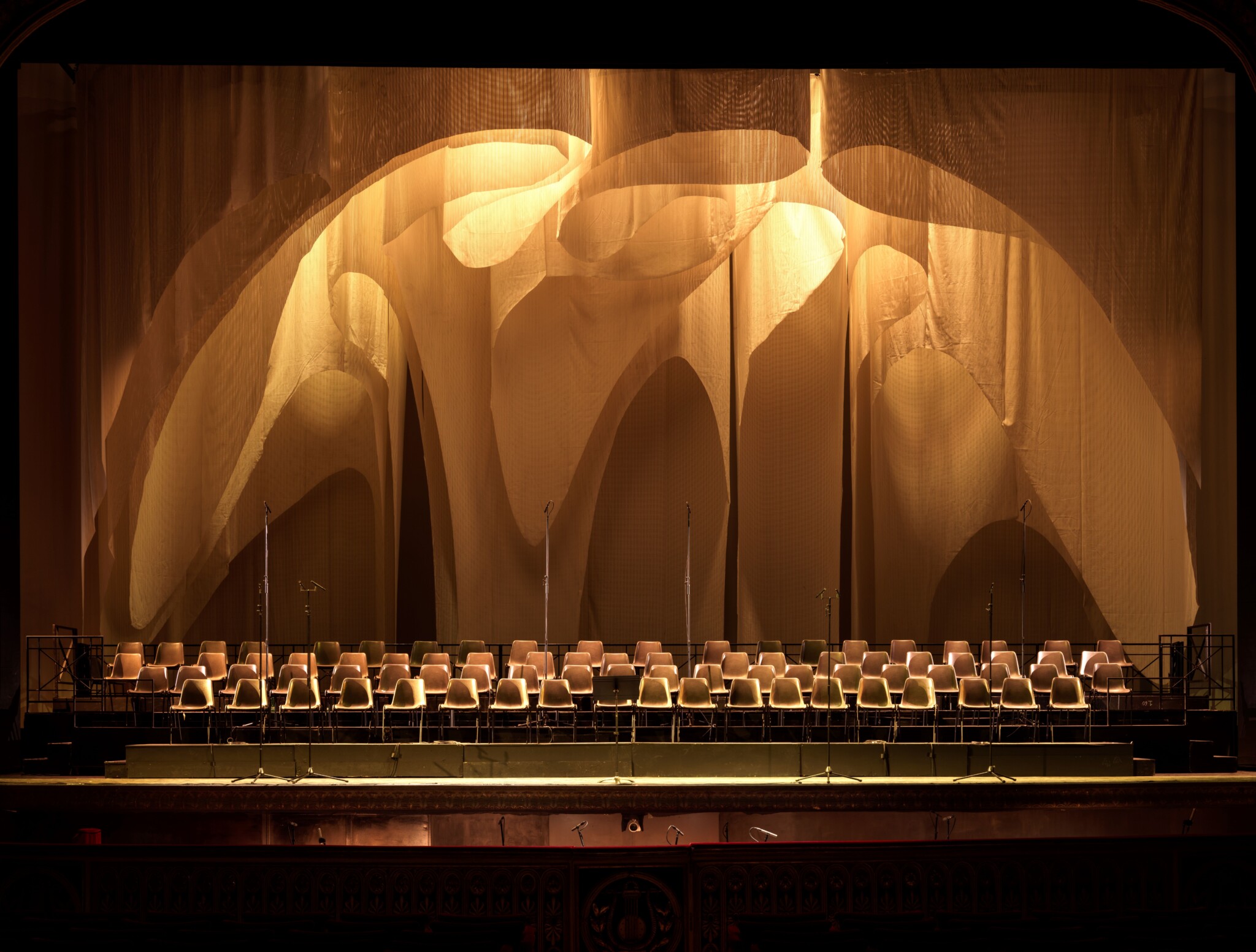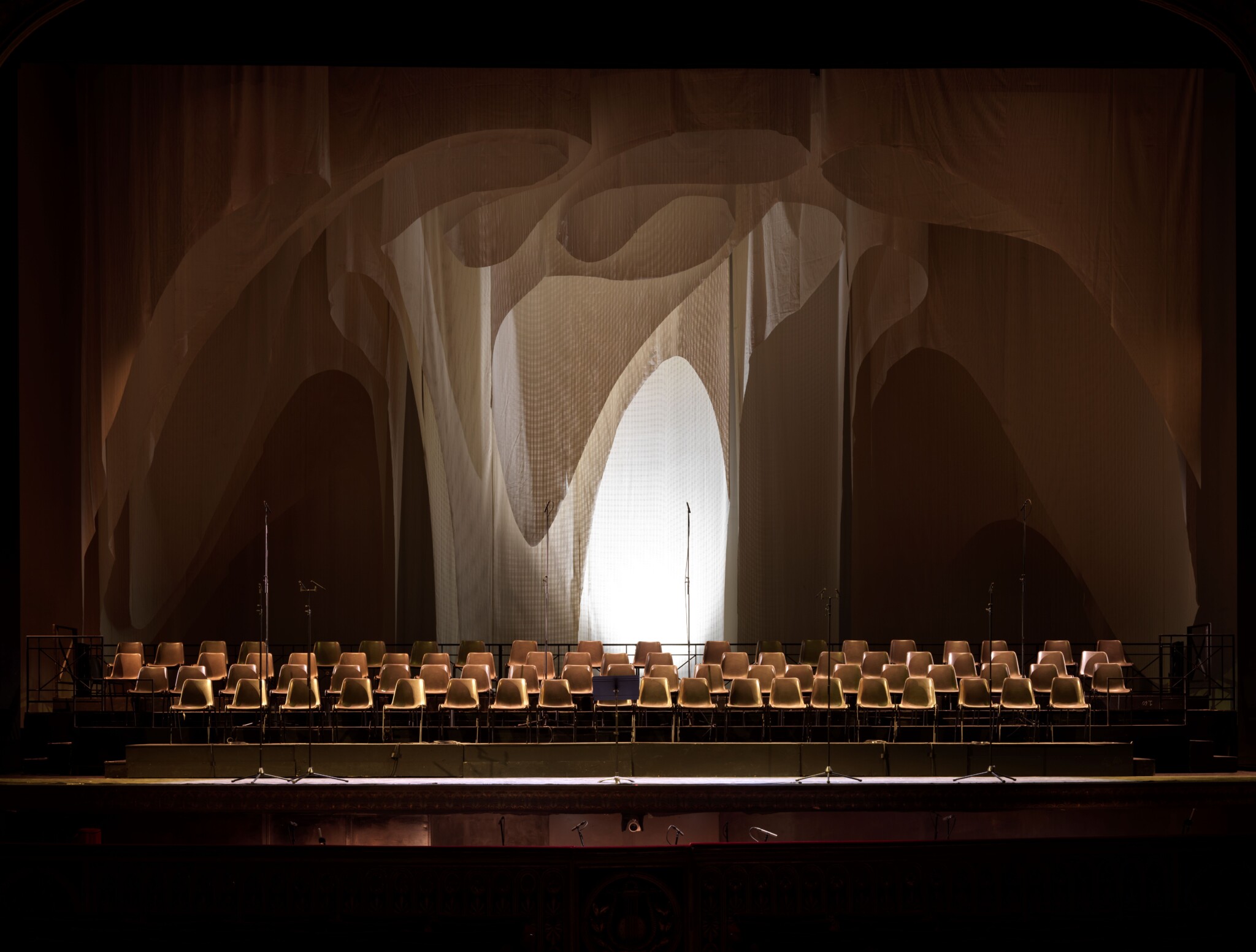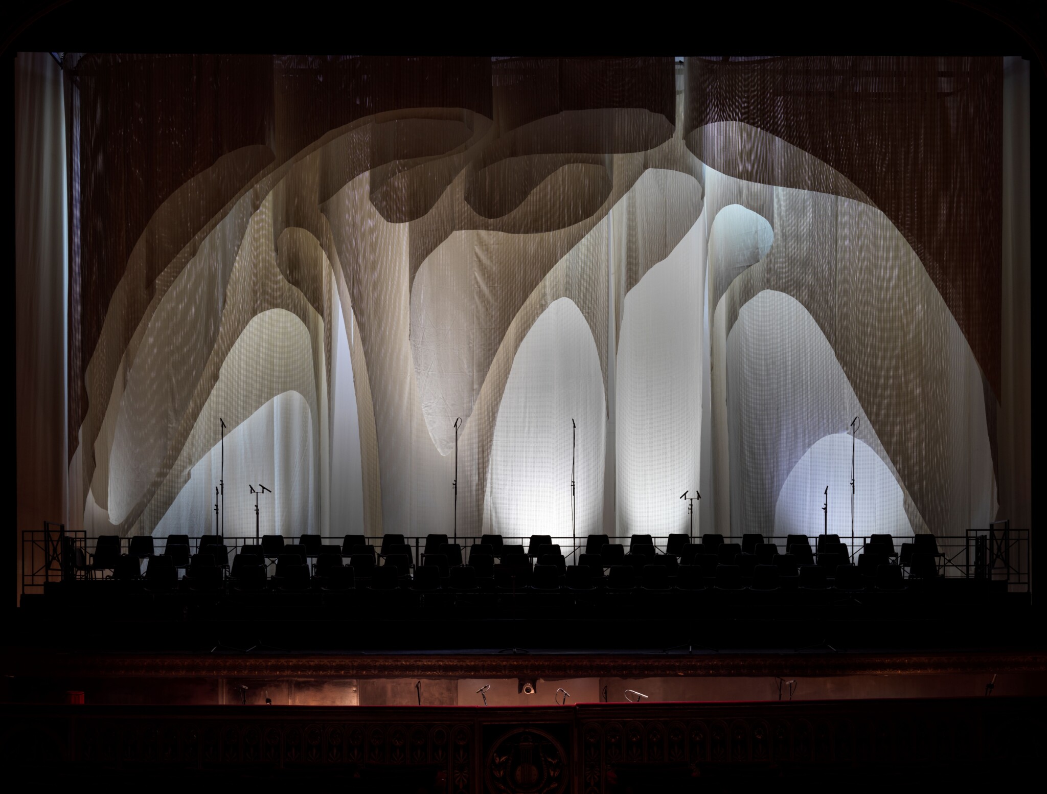 The cloth set is composed of special fabric with countless holes made of recycled polyester developed by ALCANTARA. This unique material has a transparency and matte texture that dynamically changes its expression depending on the lighting, and even has the effect of changing the depth of the space. The pattern of the fabric hanging was based on an algorithm called “Differential Growth,” which is common in nature. Our design intent was to pair history with the contemporary: The opera, first performed in 1857 in a theater built in 1737, has been brought back to life with the abstract beauty of modern materials and technology.