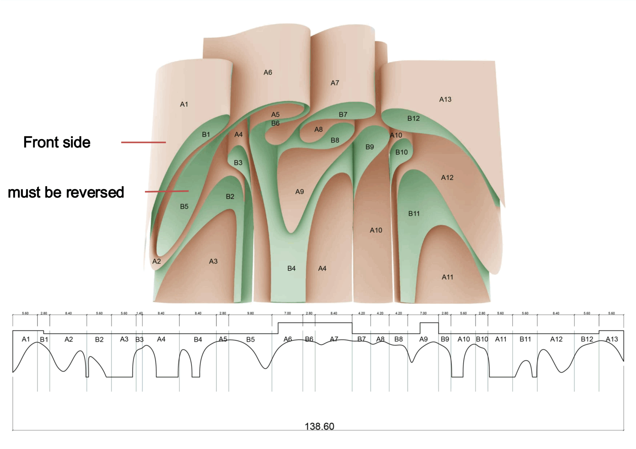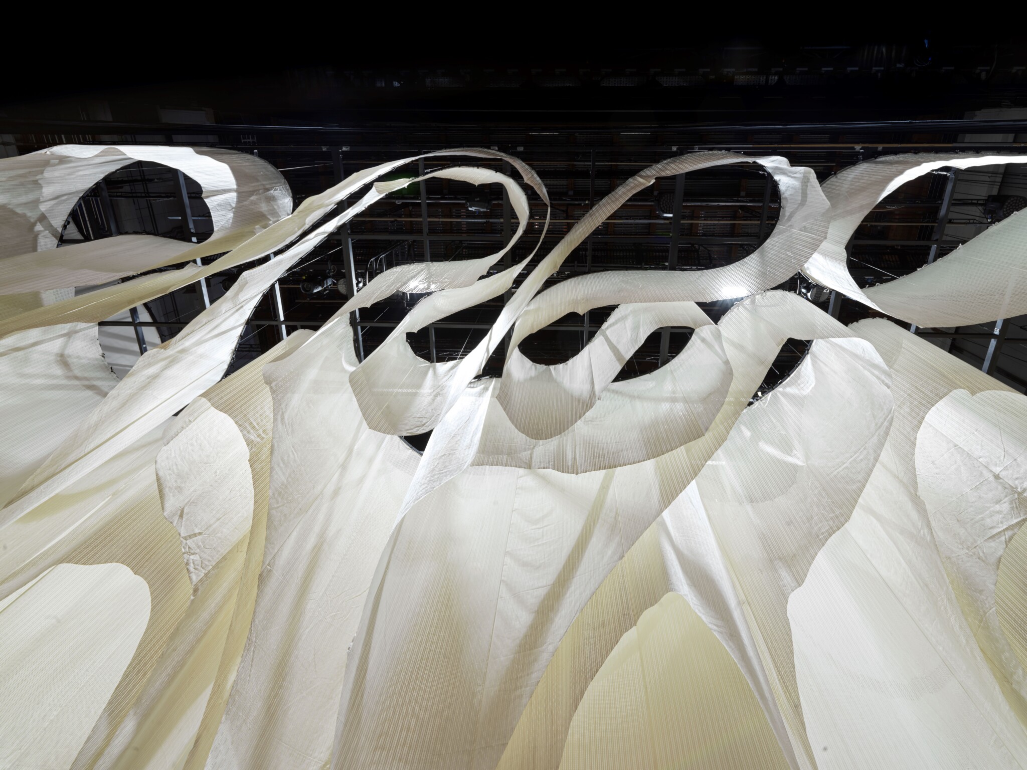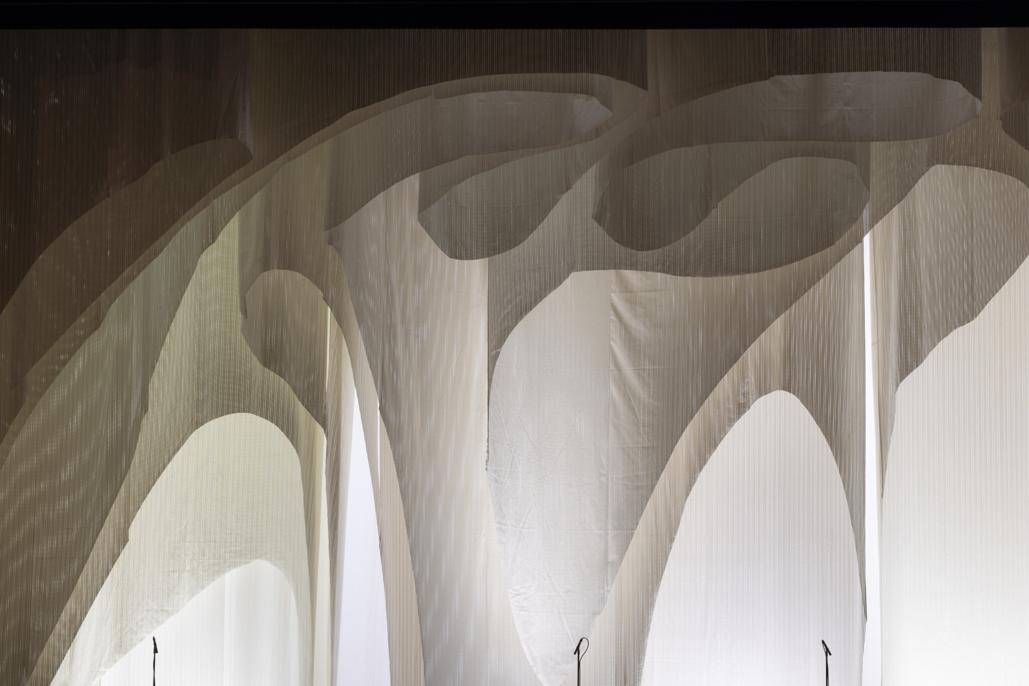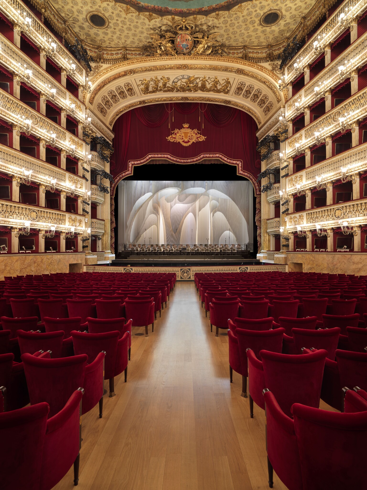 The cloth set is composed of special fabric with countless holes made of recycled polyester developed by ALCANTARA. This unique material has a transparency and matte texture that dynamically changes its expression depending on the lighting, and even has the effect of changing the depth of the space. The pattern of the fabric hanging was based on an algorithm called “Differential Growth,” which is common in nature. Our design intent was to pair history with the contemporary: The opera, first performed in 1857 in a theater built in 1737, has been brought back to life with the abstract beauty of modern materials and technology.