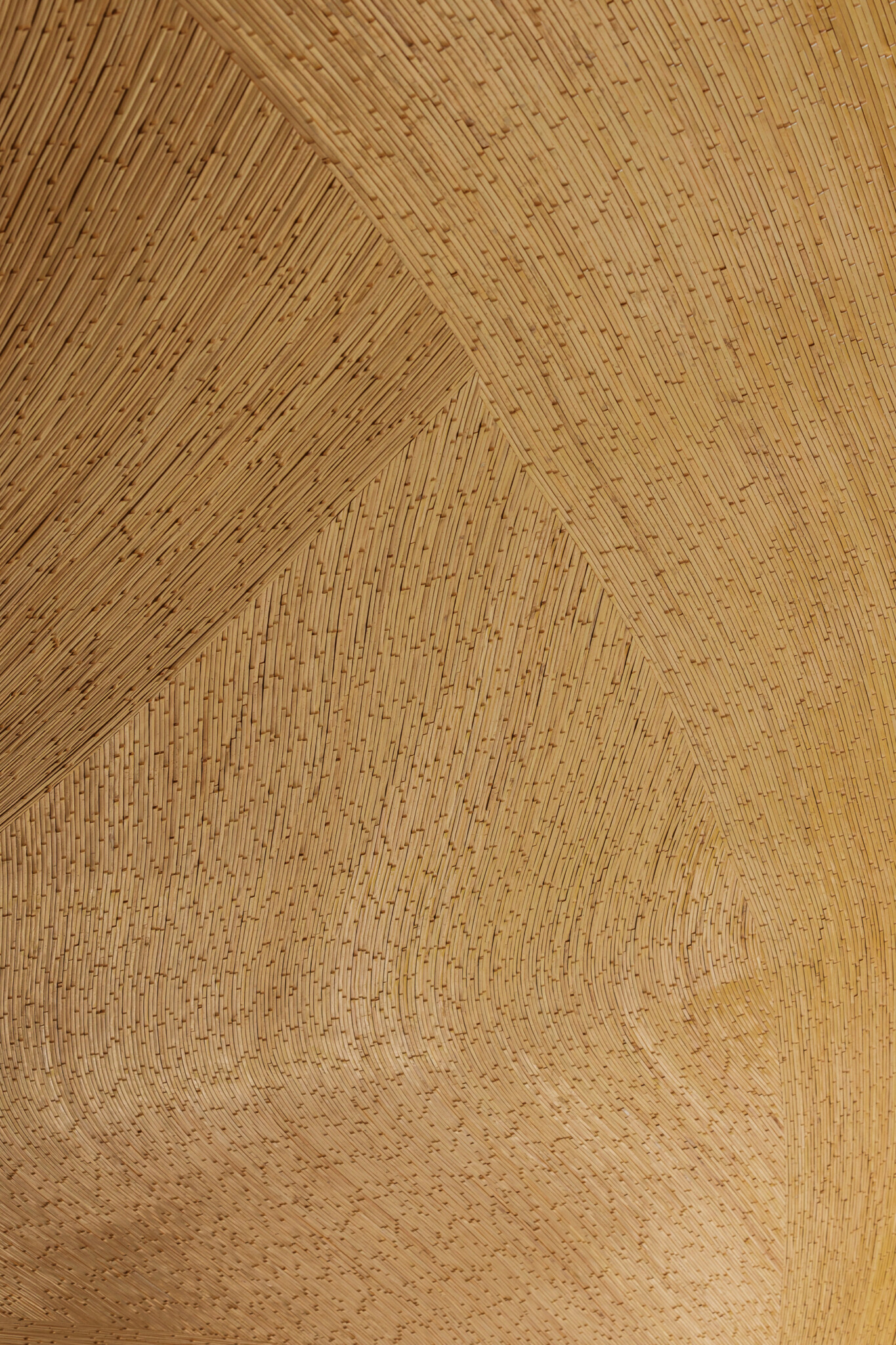 The two volumes that make up the “Bamboo Gate” are the community facility and the emergency storage warehouse which are connected hand in hand by large cross sectional wooden beams that radiate outward.