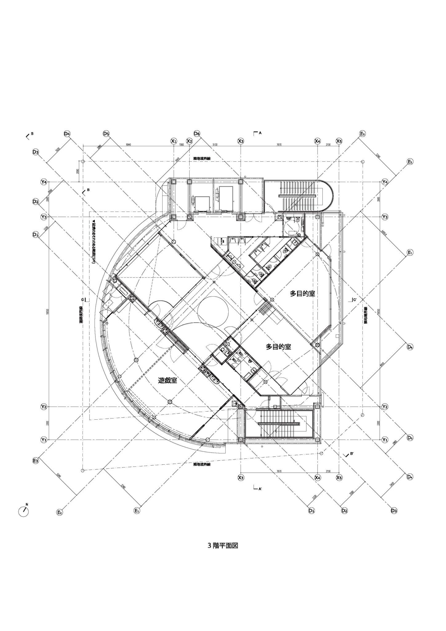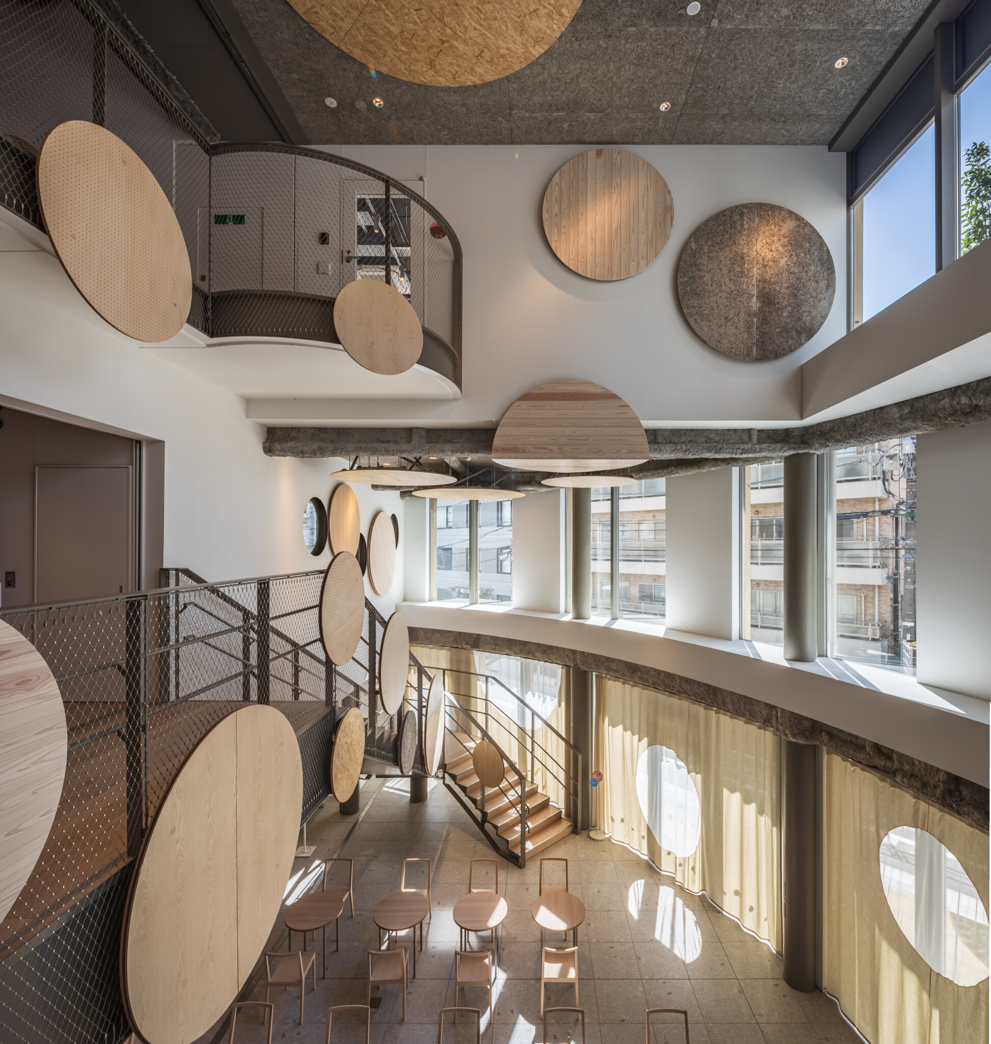 In the densely built-up area of Jingumae where workers and residences are intermingled, we designed a complex facility open to the public with a series of marble floors. The circular slabs create a generous gap between the building and the adjacent properties, allowing maximum light and wind to enter from the outside. The atrium, which runs from the first floor to the rooftop serves as a pathway for the light and wind to enter the building, additionally serving a communal connection between the mixed functions on separate floors. The interior and flooring is covered with a variety of circular panels which are used as windows, furniture, curtains, and signage, all of which vary in material and scale, maximizing the power of the circle to create a softer space. This is a proposal for a “malleable” public building that replaces the rigid and closed public building.