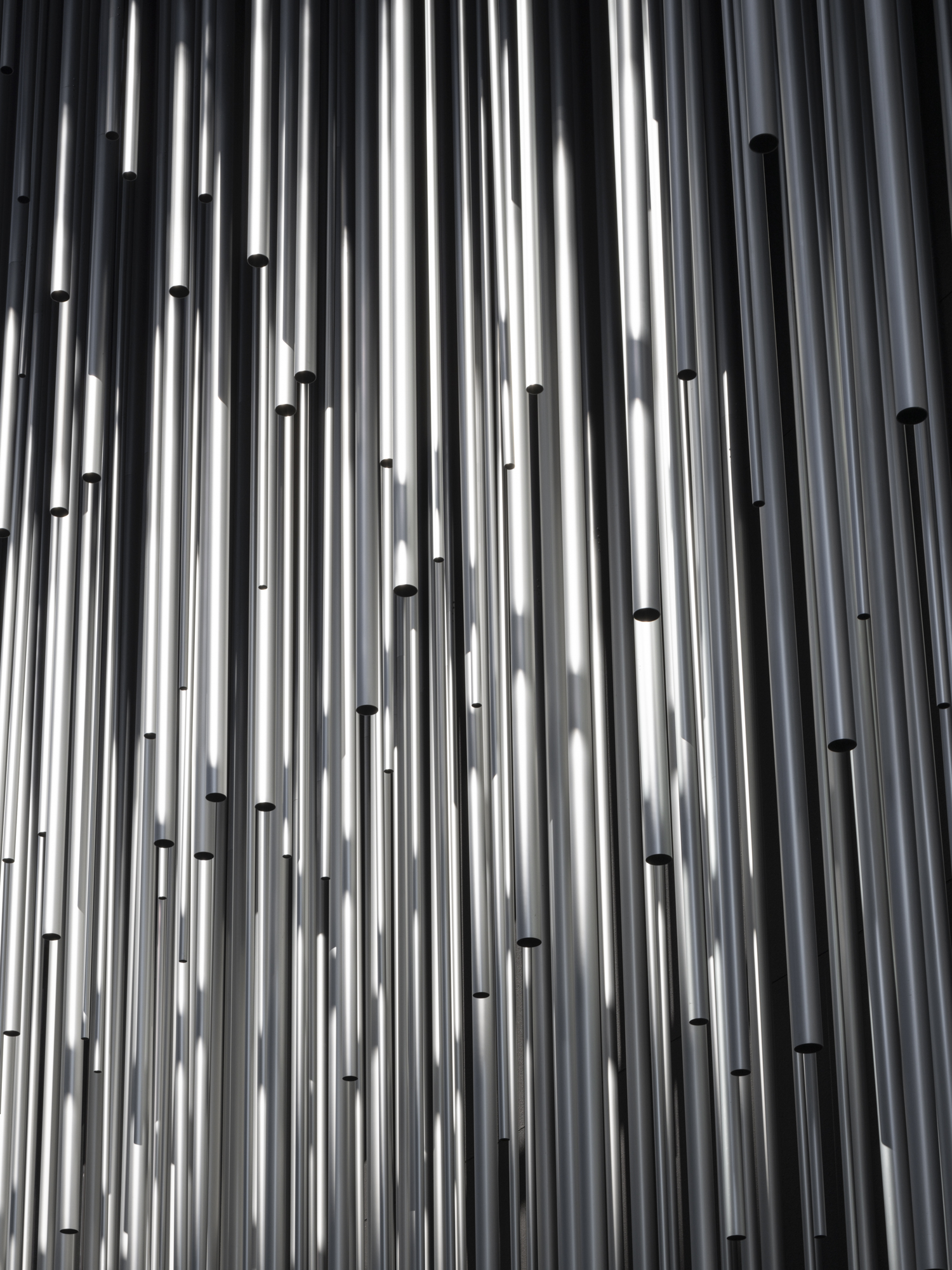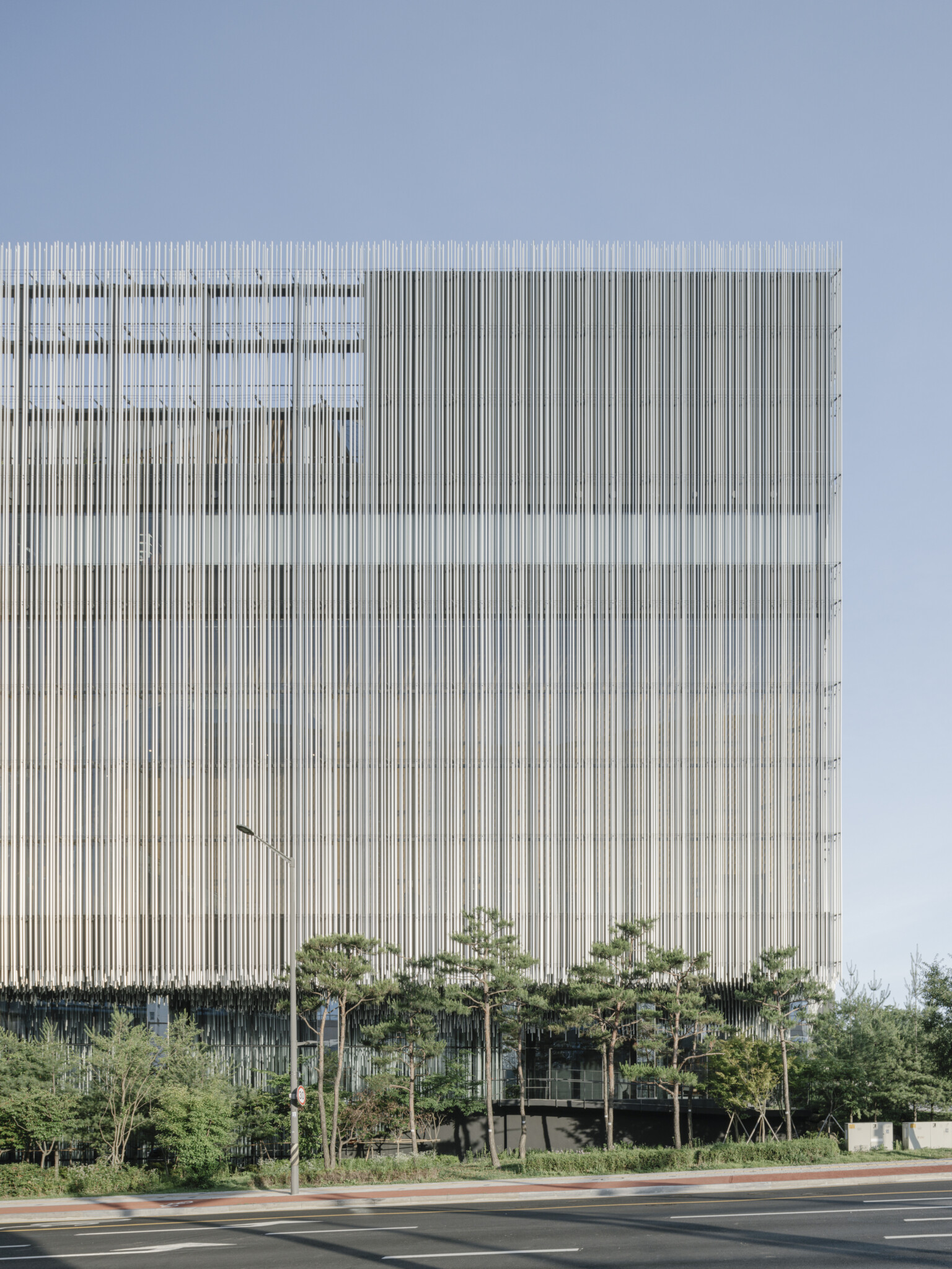The exterior design uses vertically overlapping aluminum louvers to create changing shadows, where light and shadow meet between the louvers, producing a beautiful effect like sunlight in a forest. The use of aluminum pipes mimics the changes in natural light, randomly arranging the pipes to harmonize natural disorder and order, emphasizing the beauty of light that changes according to weather, time, and season. Additionally, the bright aluminum pipes envelop the entire building, allowing the exterior to show new expressions according to the seasons, incorporating the random characteristics of the urban environment and nature into the architecture.