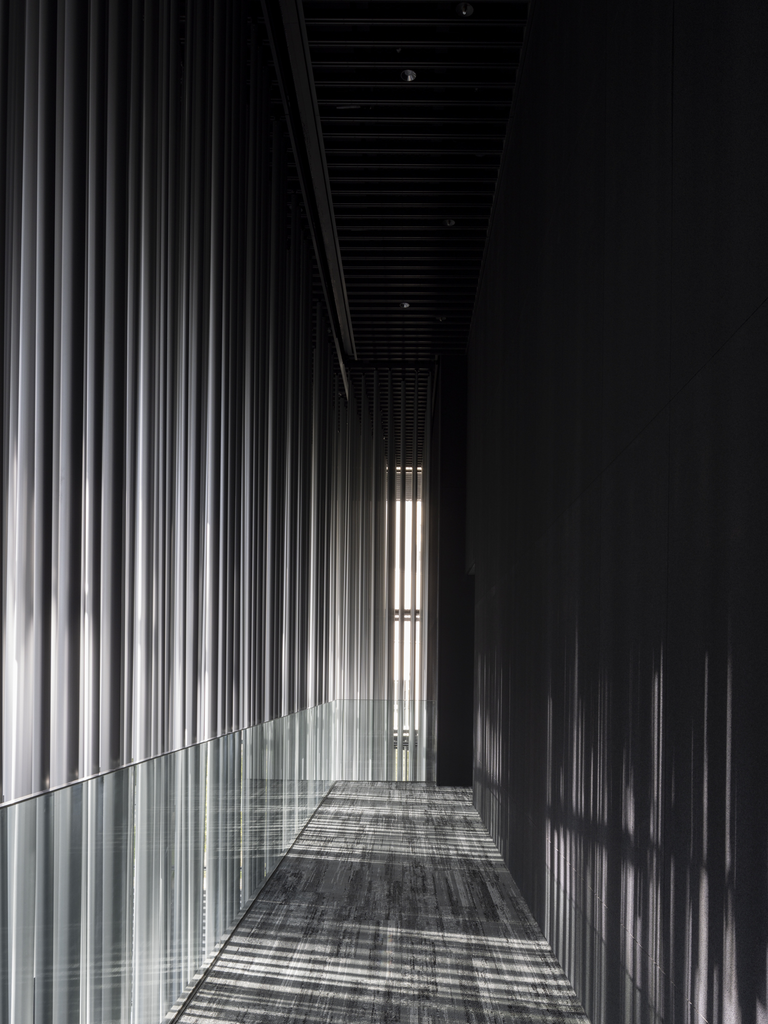 The interior of the exhibition rooms uses wood, adopting a detail we call ‘wood drape,’ which differs from typical wood finishes, emphasizing the softness and naturalness of the wood. The exterior, with its hard aluminum, transitions to the soft material of the wood inside, creating a gradual shift from the exterior to the interior. The wood finish is designed with acoustics in mind, creating a space that stimulates human senses and fosters a sense of closeness to nature.