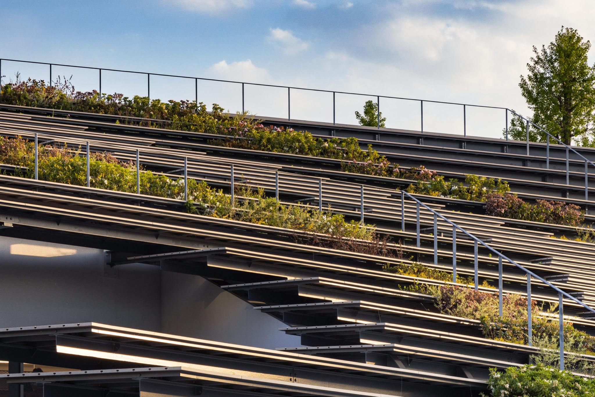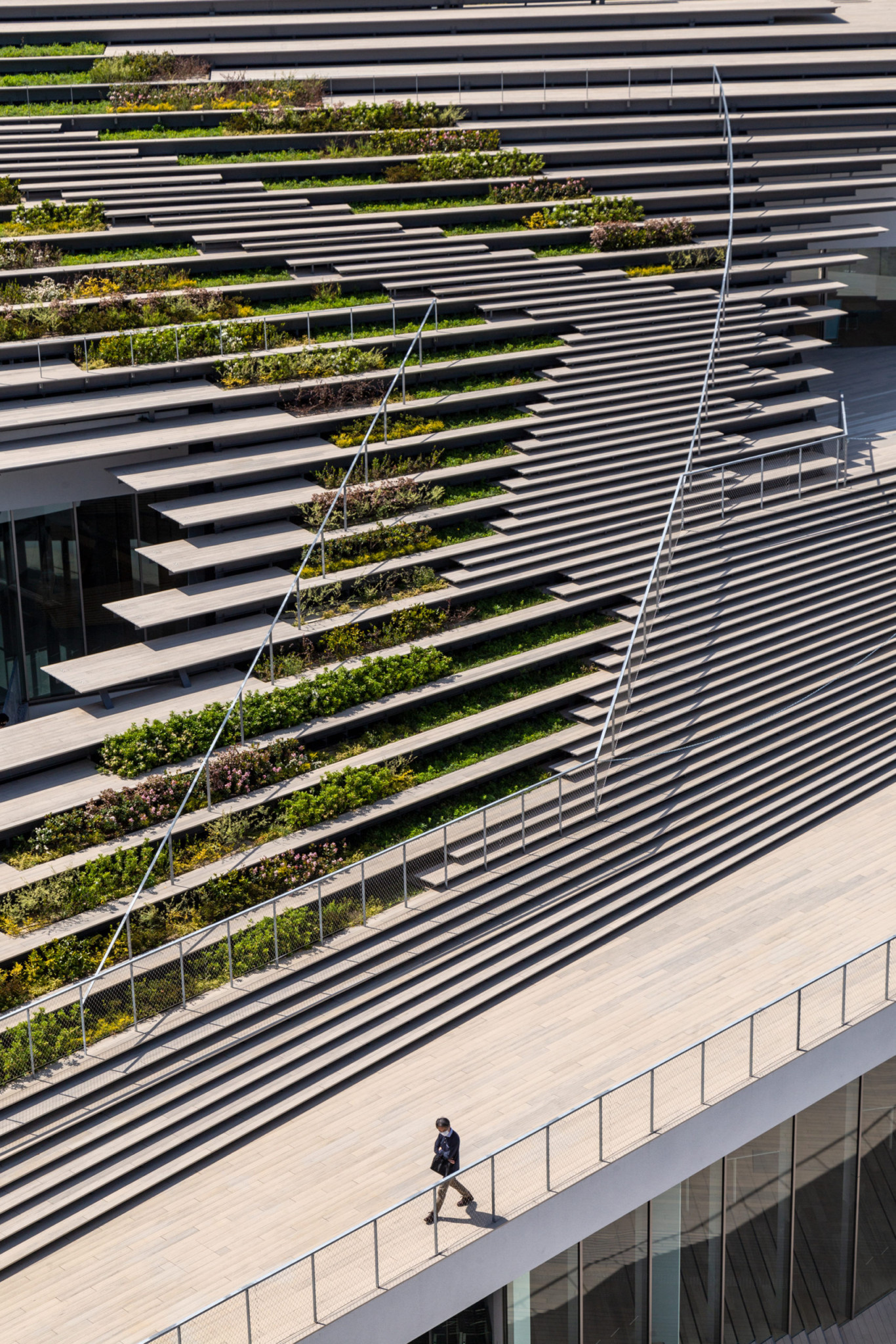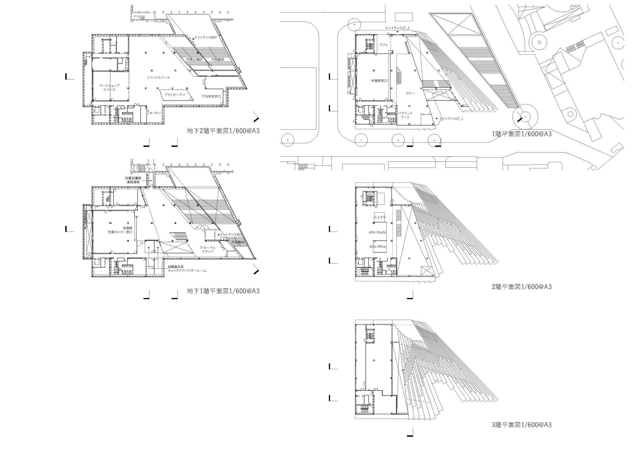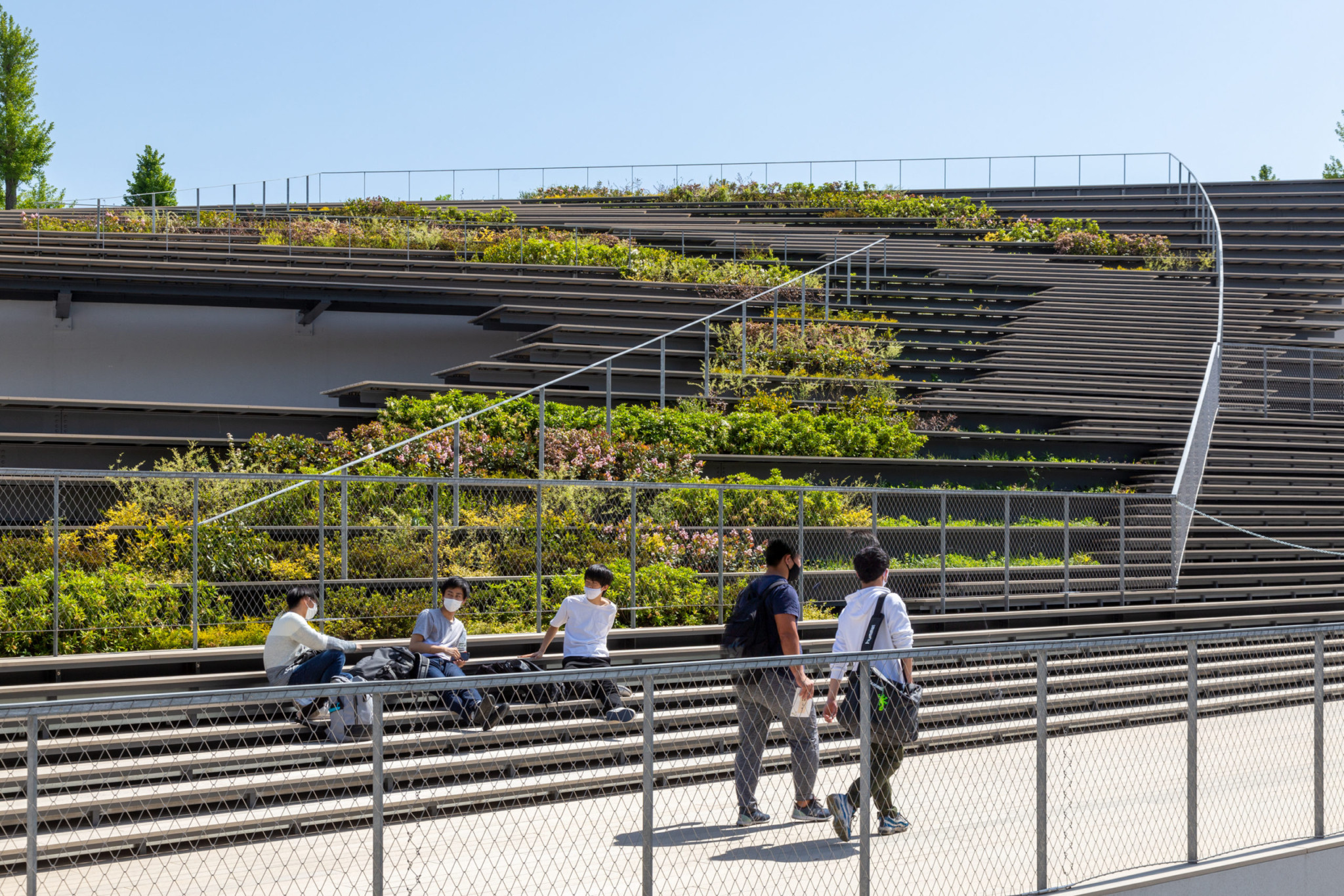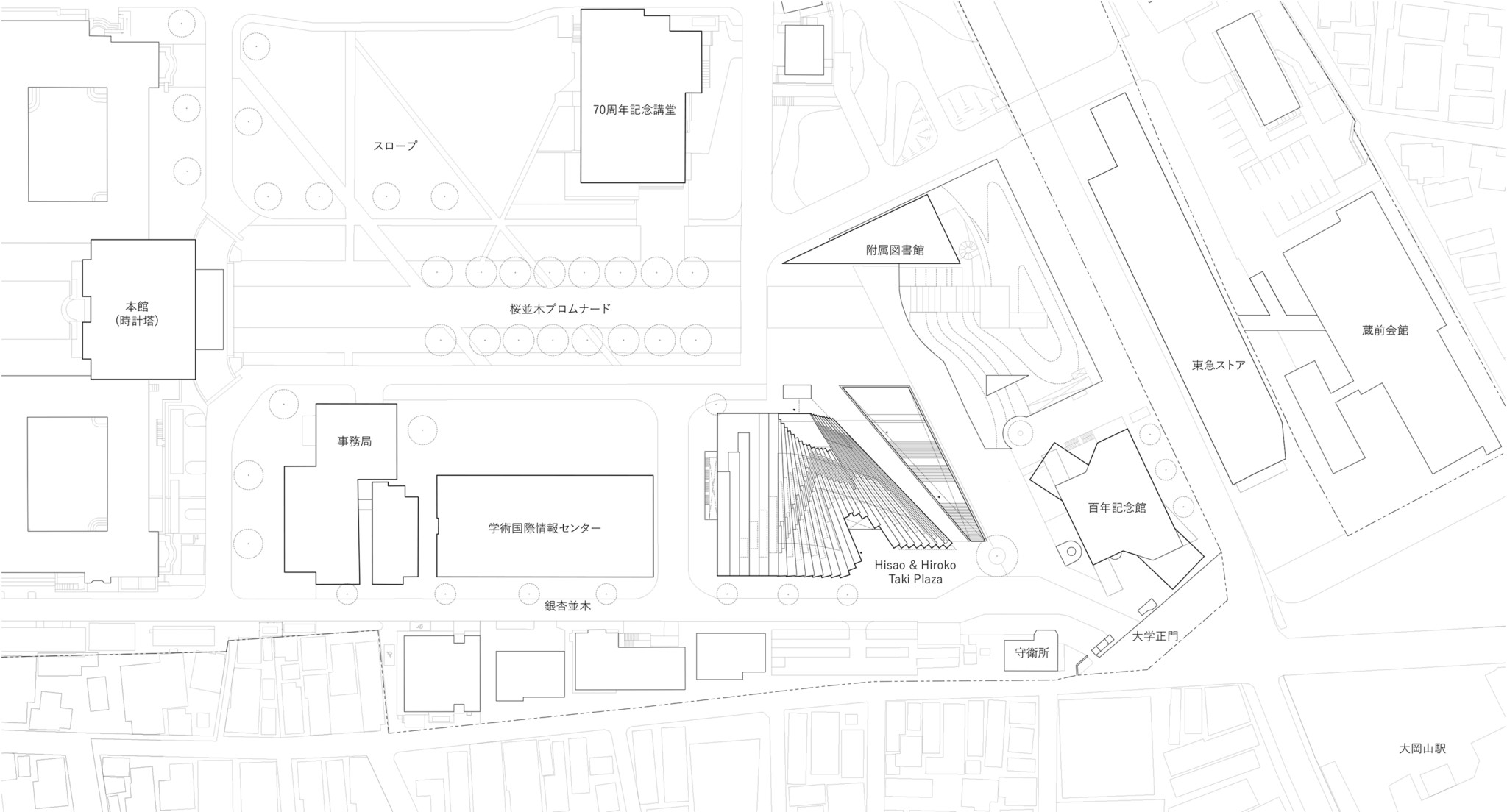 Located at the entrance of the Tokyo Institute of Technology (current Institute of Science Tokyo) Ookayama Campus, we designed a “platform” to house student activity. To maintain a clear vista of the clocktower, a prominent landmark for the campus, most of the building sits underground. Above ground, the building takes on a lush mound-like form, seamlessly integrating with the surrounding landscape. The “roof” which is composed of stepped greenery and bleachers, resonates with the green slanted wall of the adjacent library, collectively creating a green valley. The green valley serves as a new green space to invite life and activity for the students.