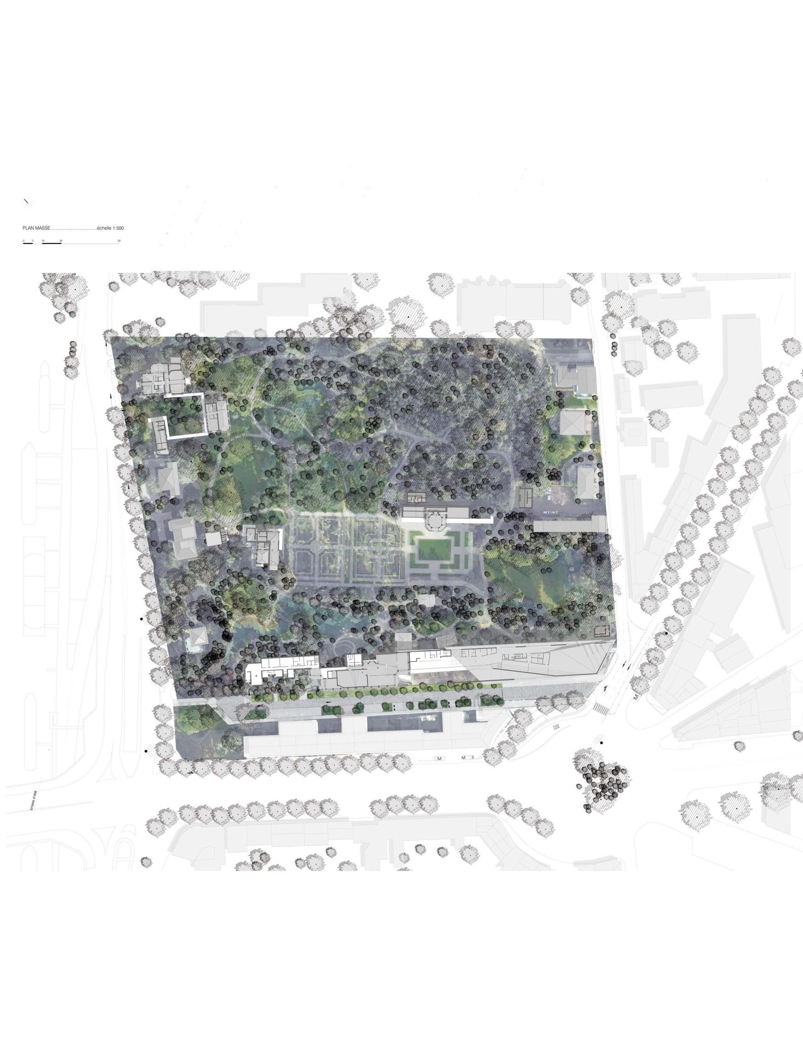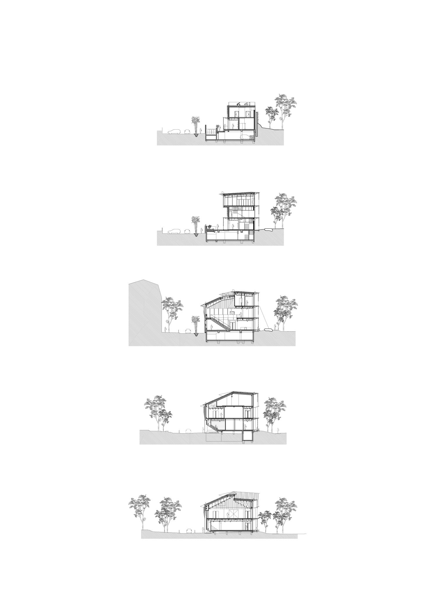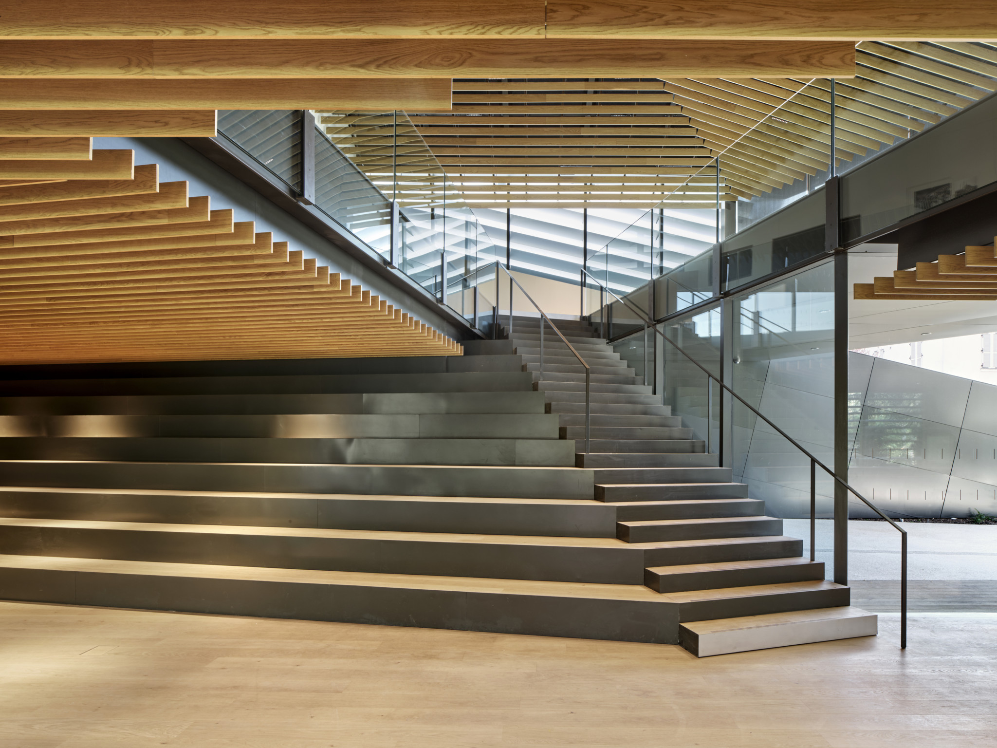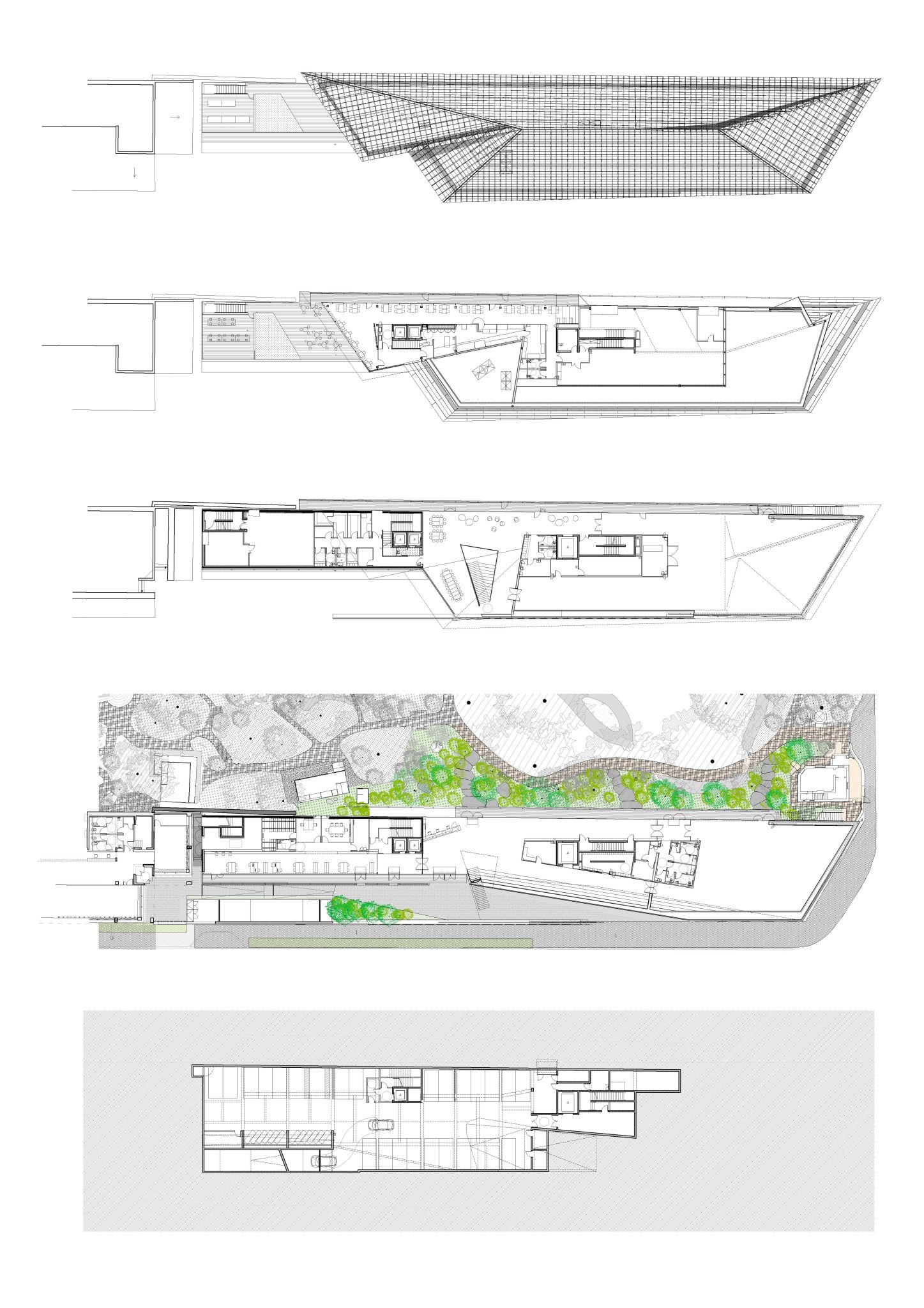 The envelope on the city side is mainly made from aluminium, and the envelope on the garden side is mainly made from wood, and at times these two materials are mixed in a gradational manner. This gives the building a biological skin that gently adapts to different environments while interacting with them.
