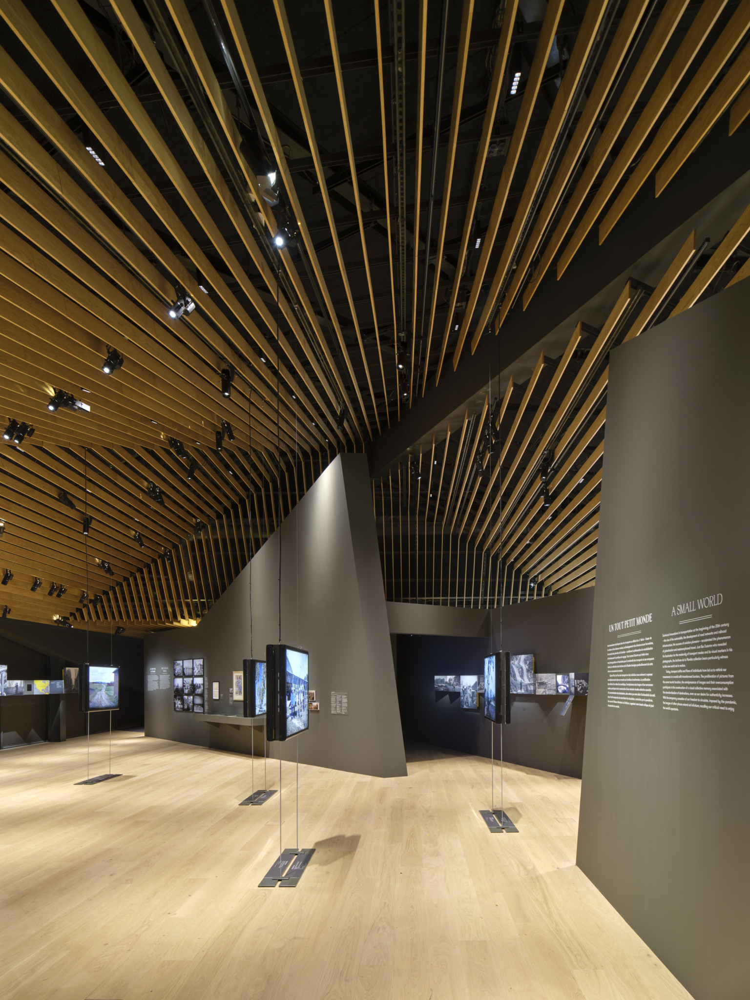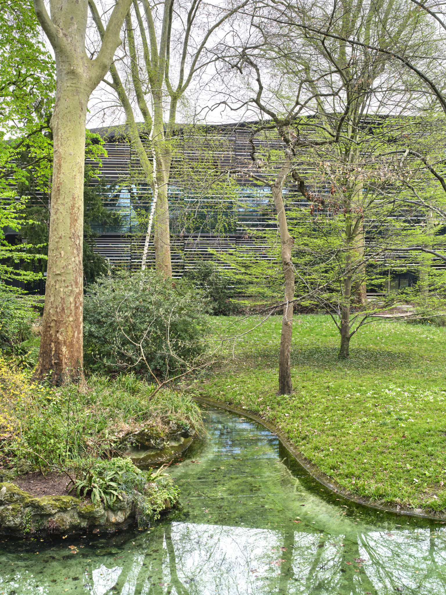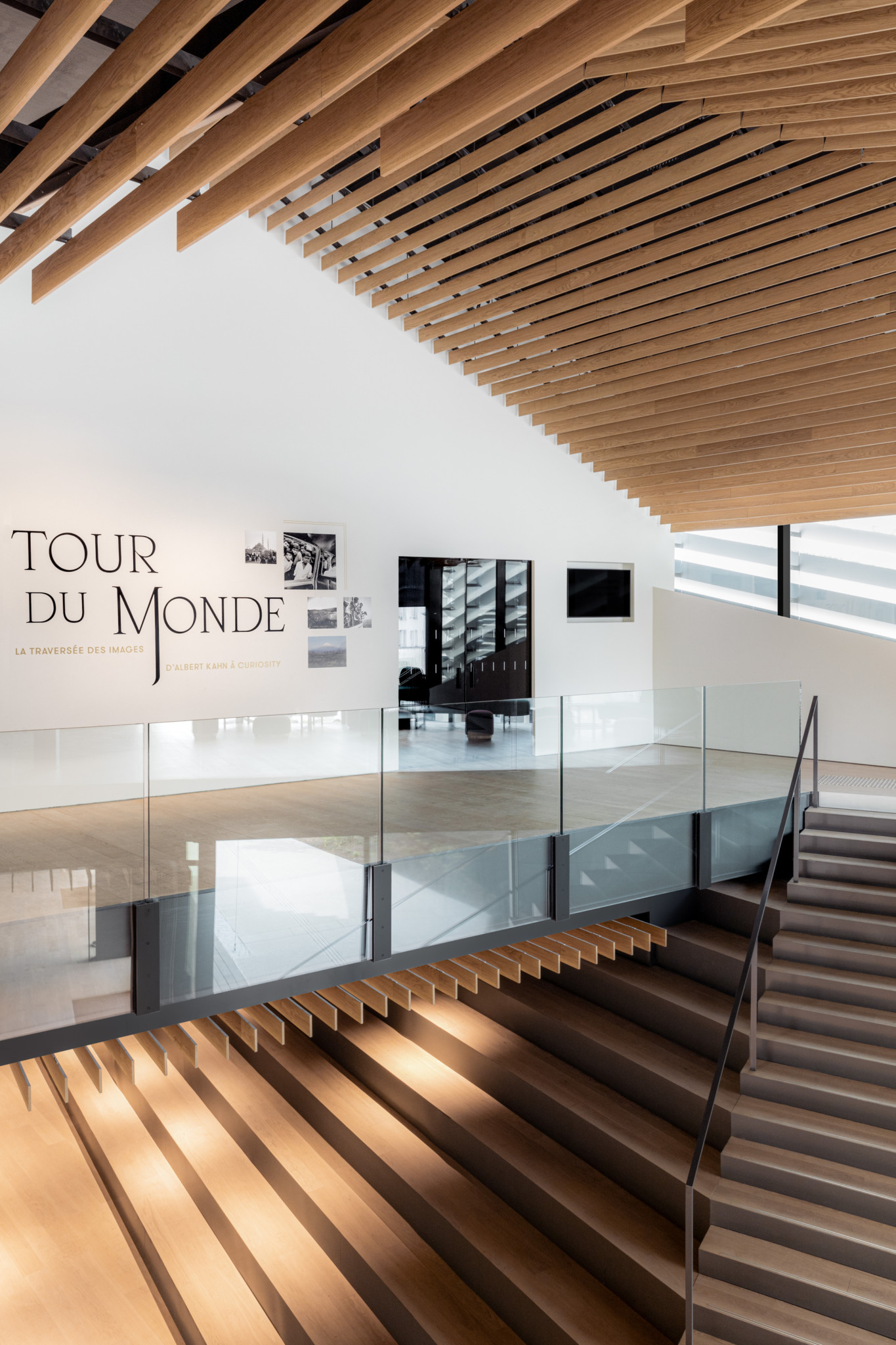 The display space was designed in an extended linear sequence from the paths through this garden. A screen made from aluminum and wood is inserted between the path and exterior environment while it continues to meander horizontally and vertically, controlling the relationship between the two. The dream of Albert Kahn of blending the garden and display space was achieved by blending the environment and architecture.