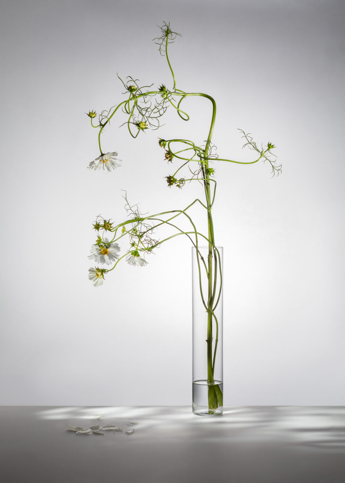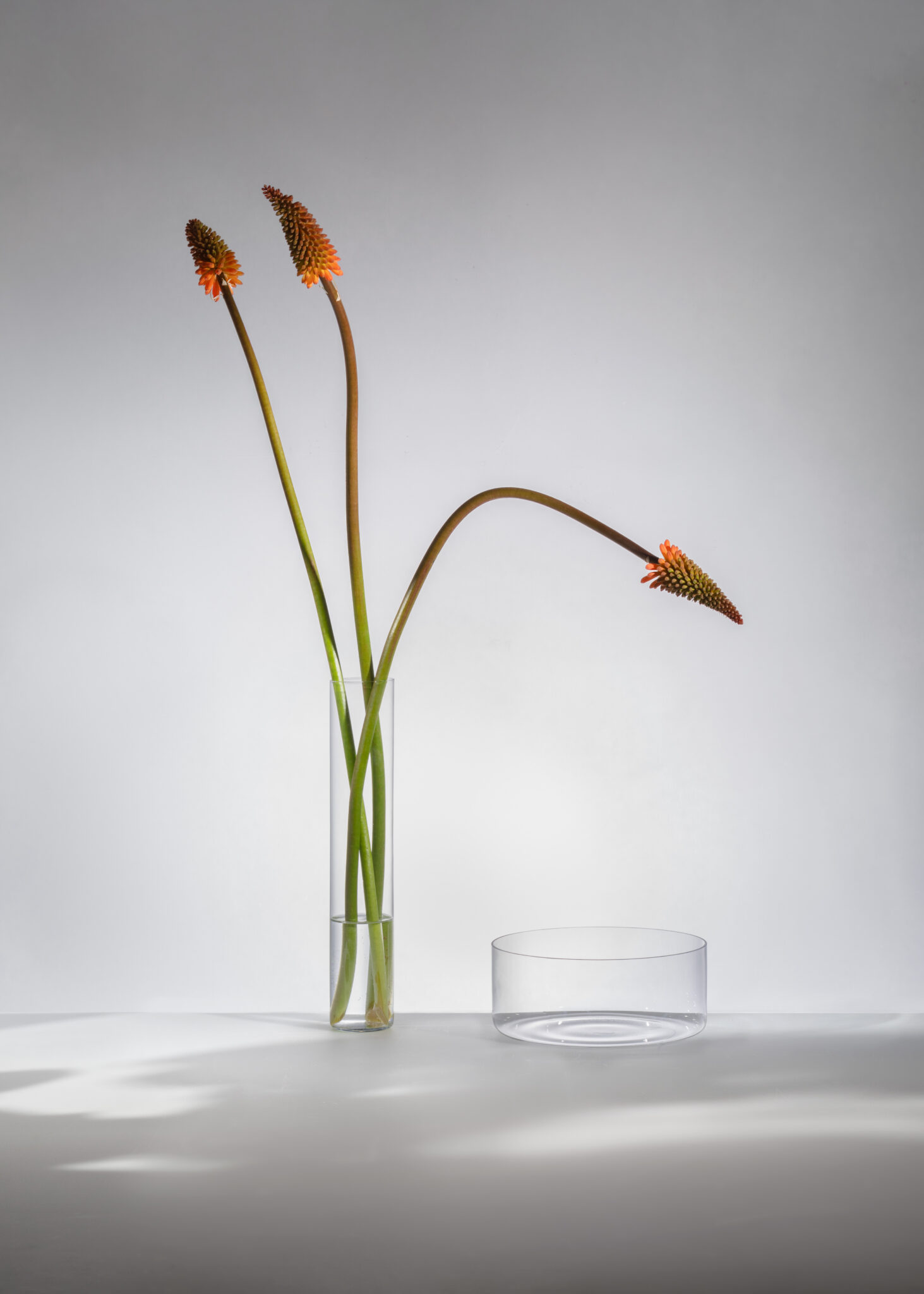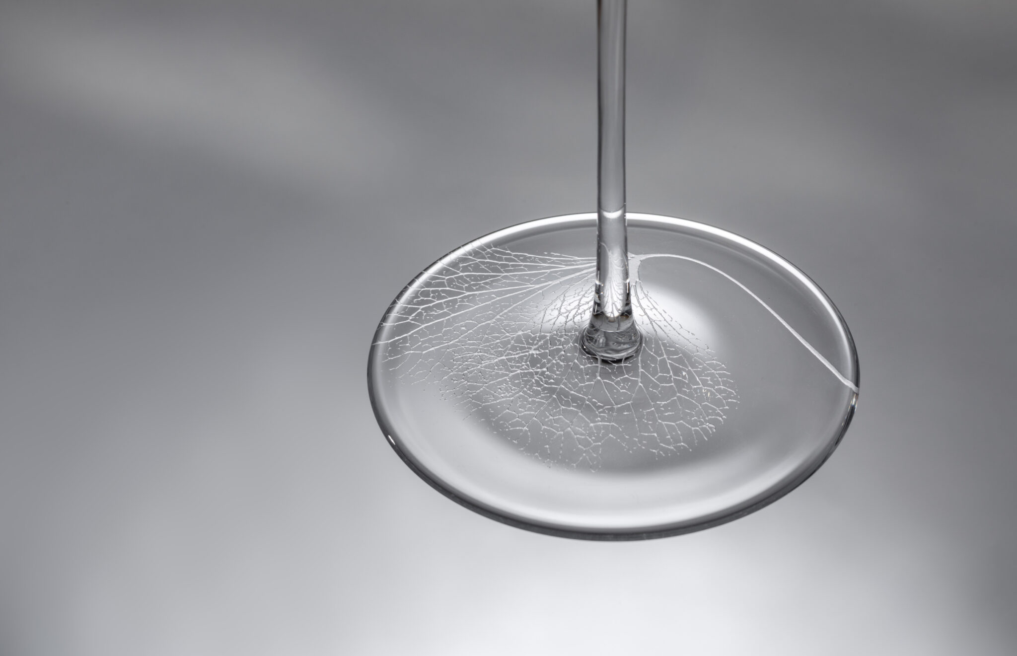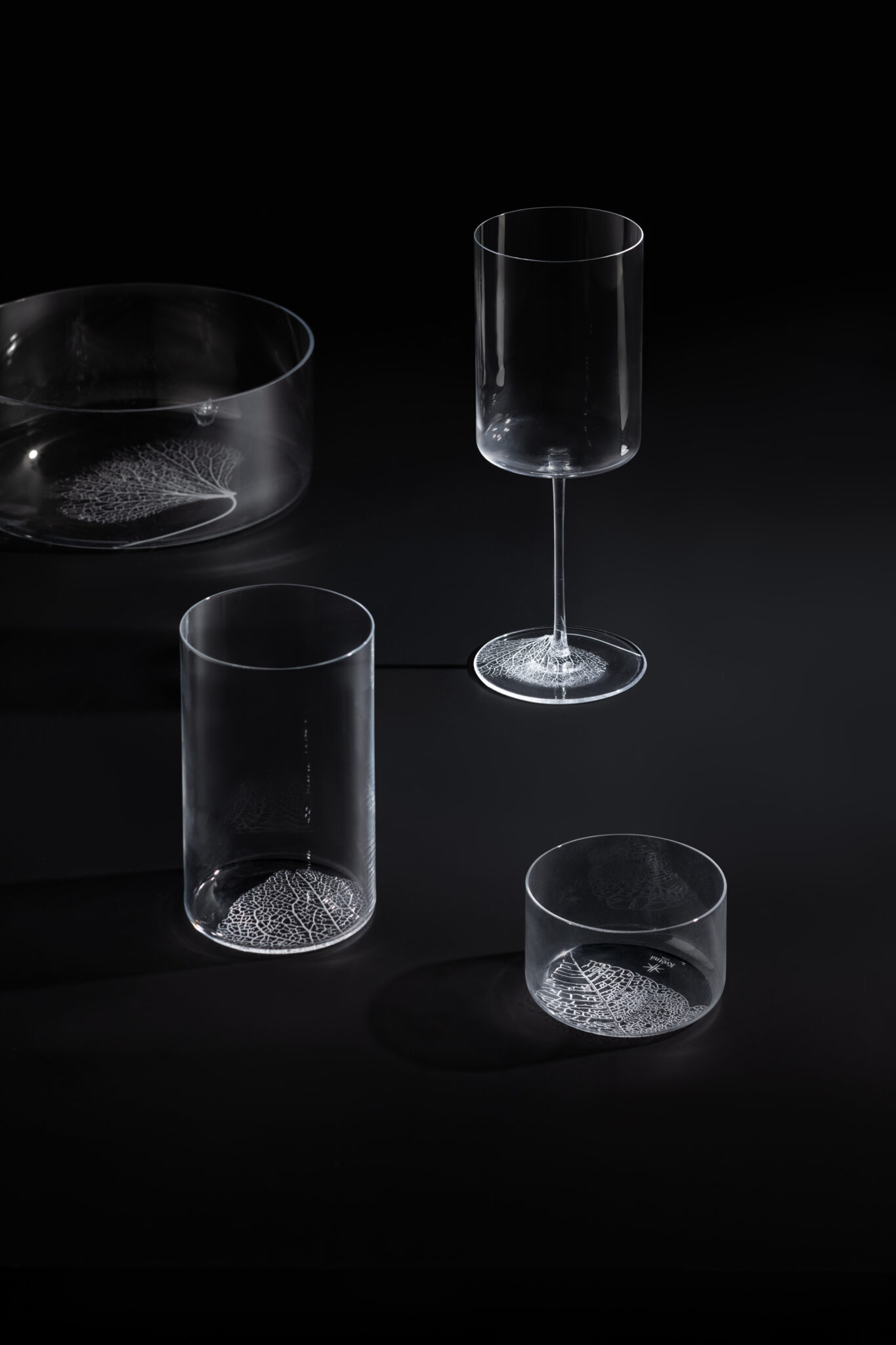 Each piece is shaped by a simple cylindrical form, carrying a quiet detail at its base — the delicate imprint of a leaf’s veins. When touched by light, this hidden motif comes alive, turning glass into a vessel not only for use, but for reflection.