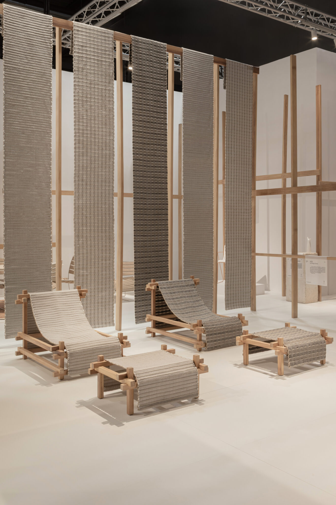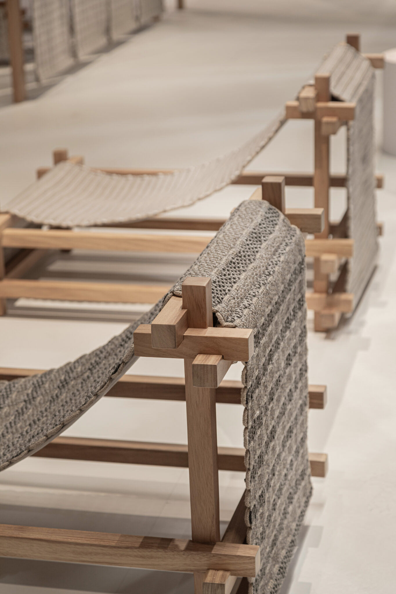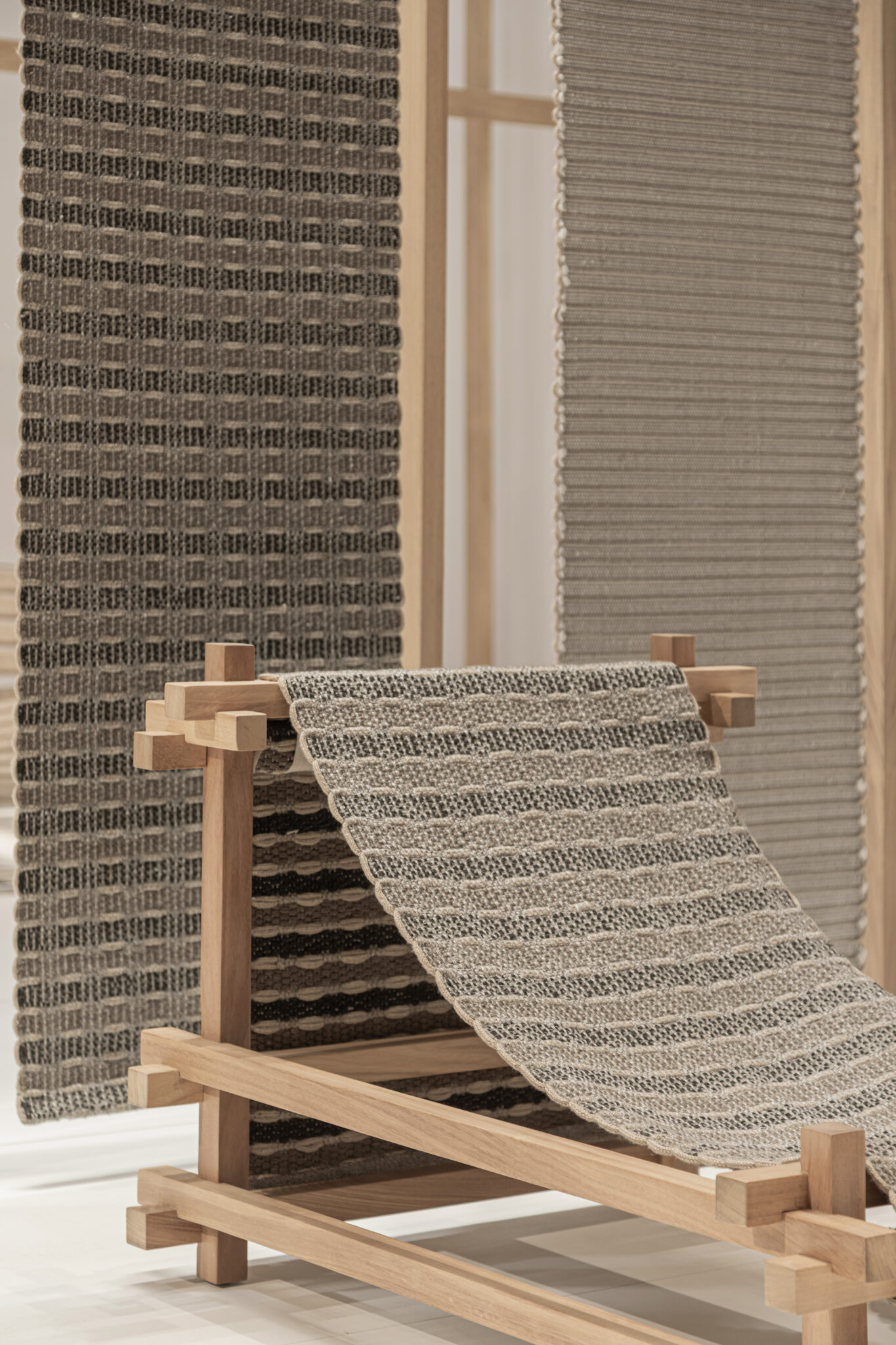 Building upon the GOZ collection, which weaves wool and wood together, we designed a universal system that integrates furniture and space based on the act of “weaving,” using recycled PET material as the primary component.