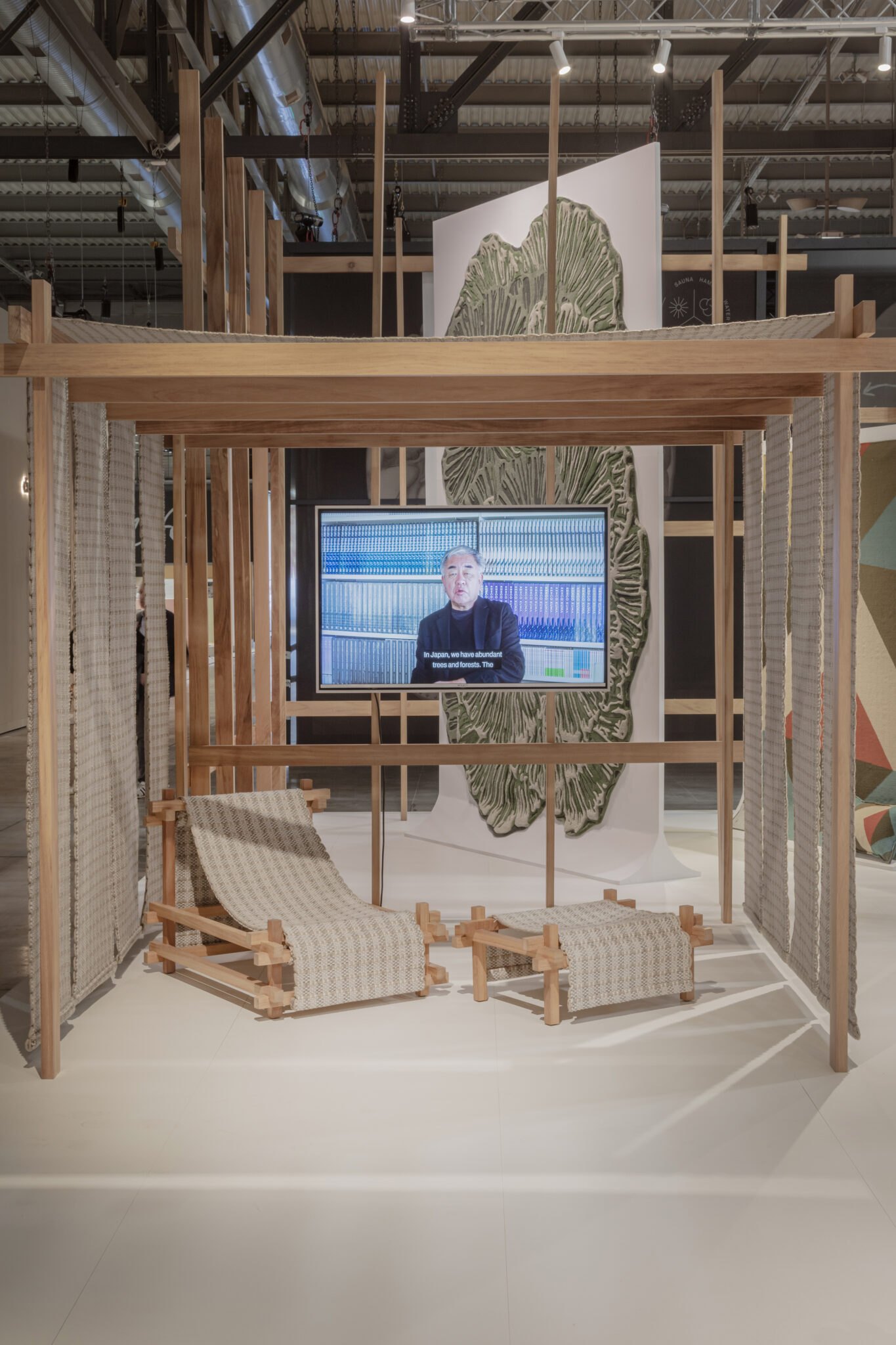 By weaving together slender wooden frames reminiscent of traditional Japanese architecture and recycled materials, the design encompasses all essential elements for living, from chairs to partitions.