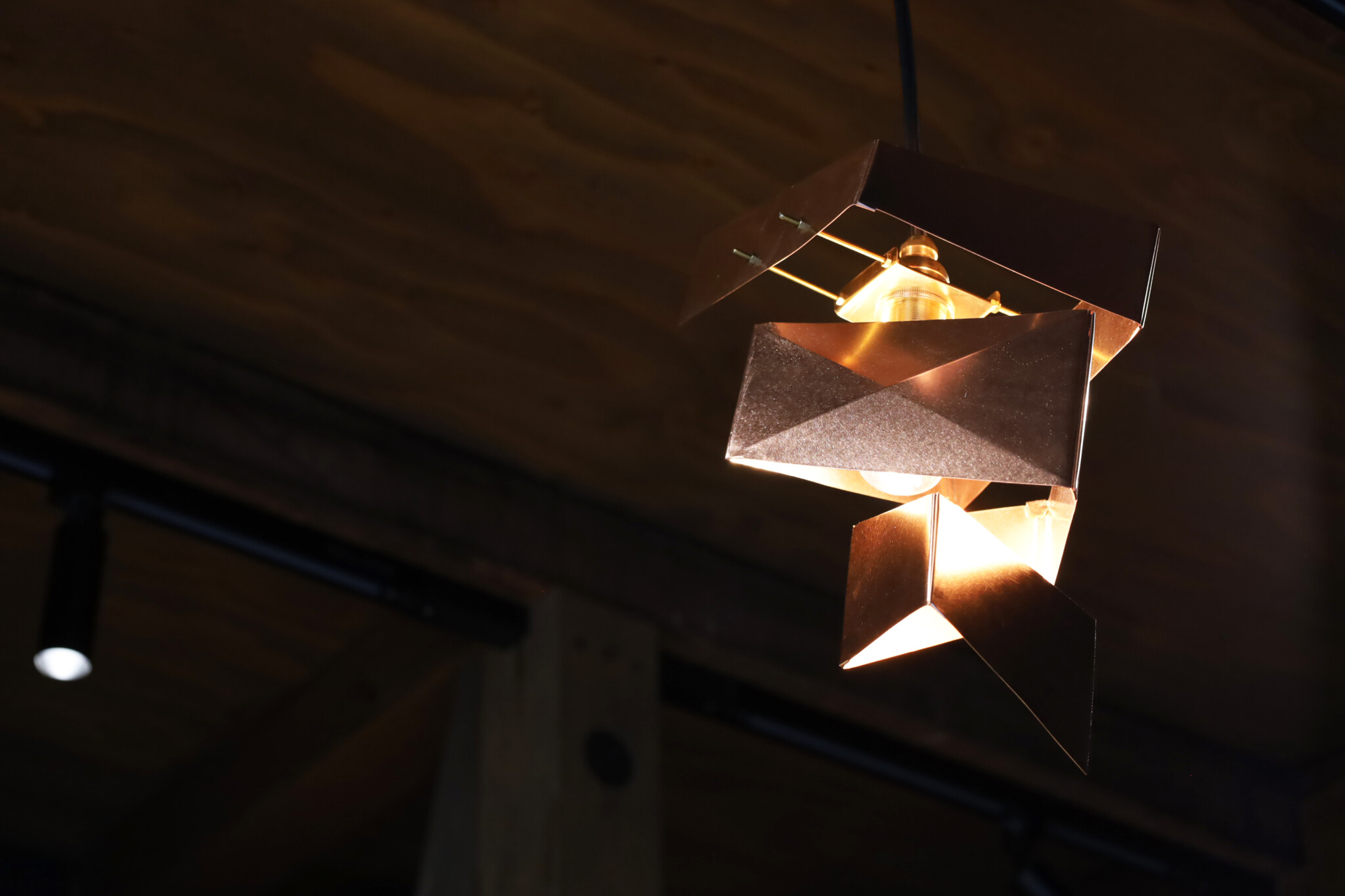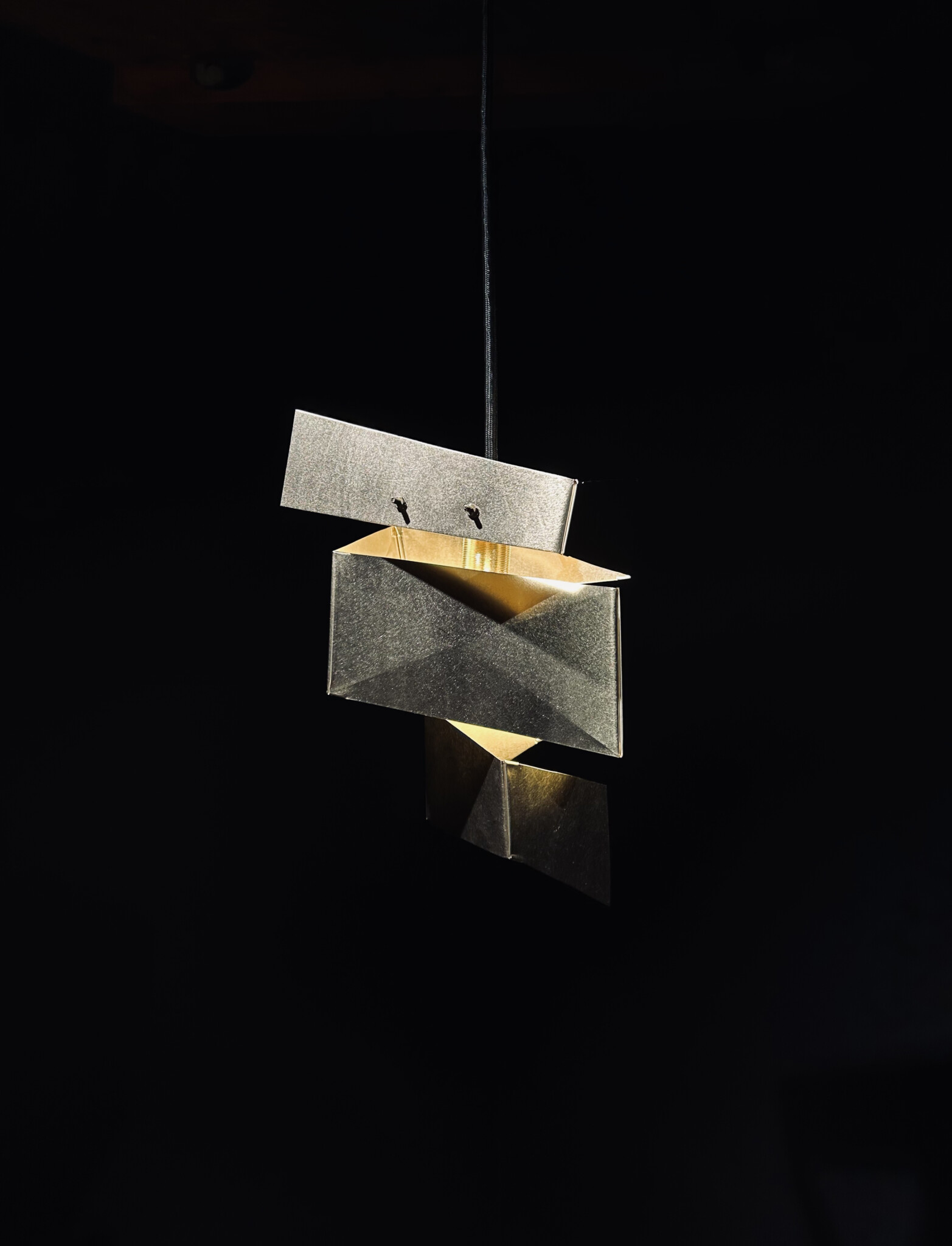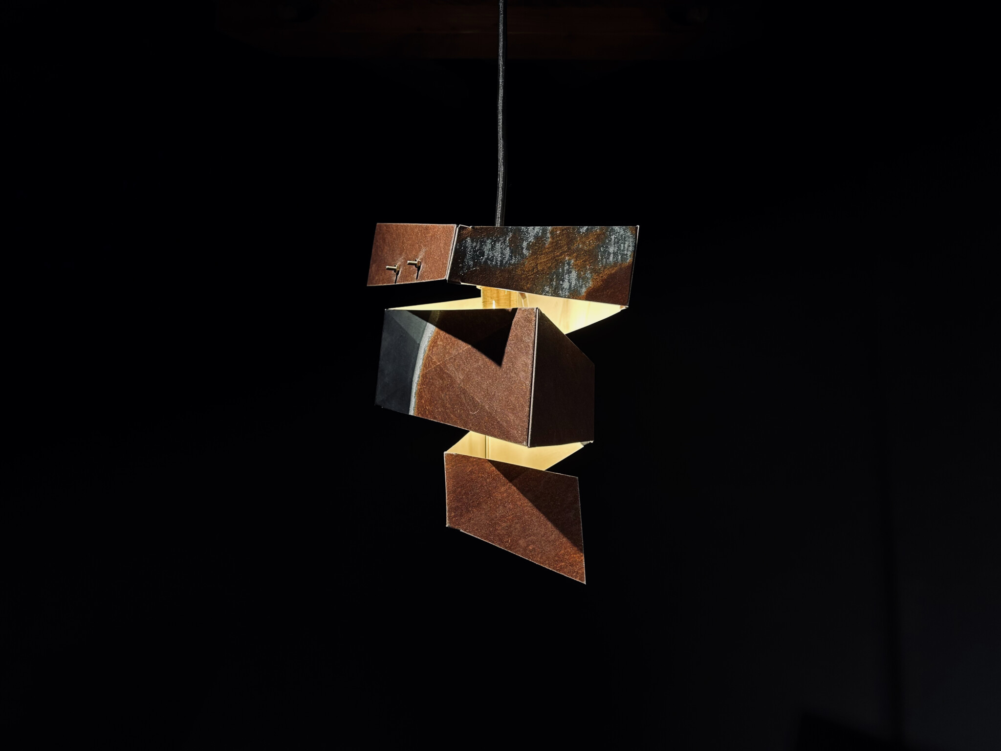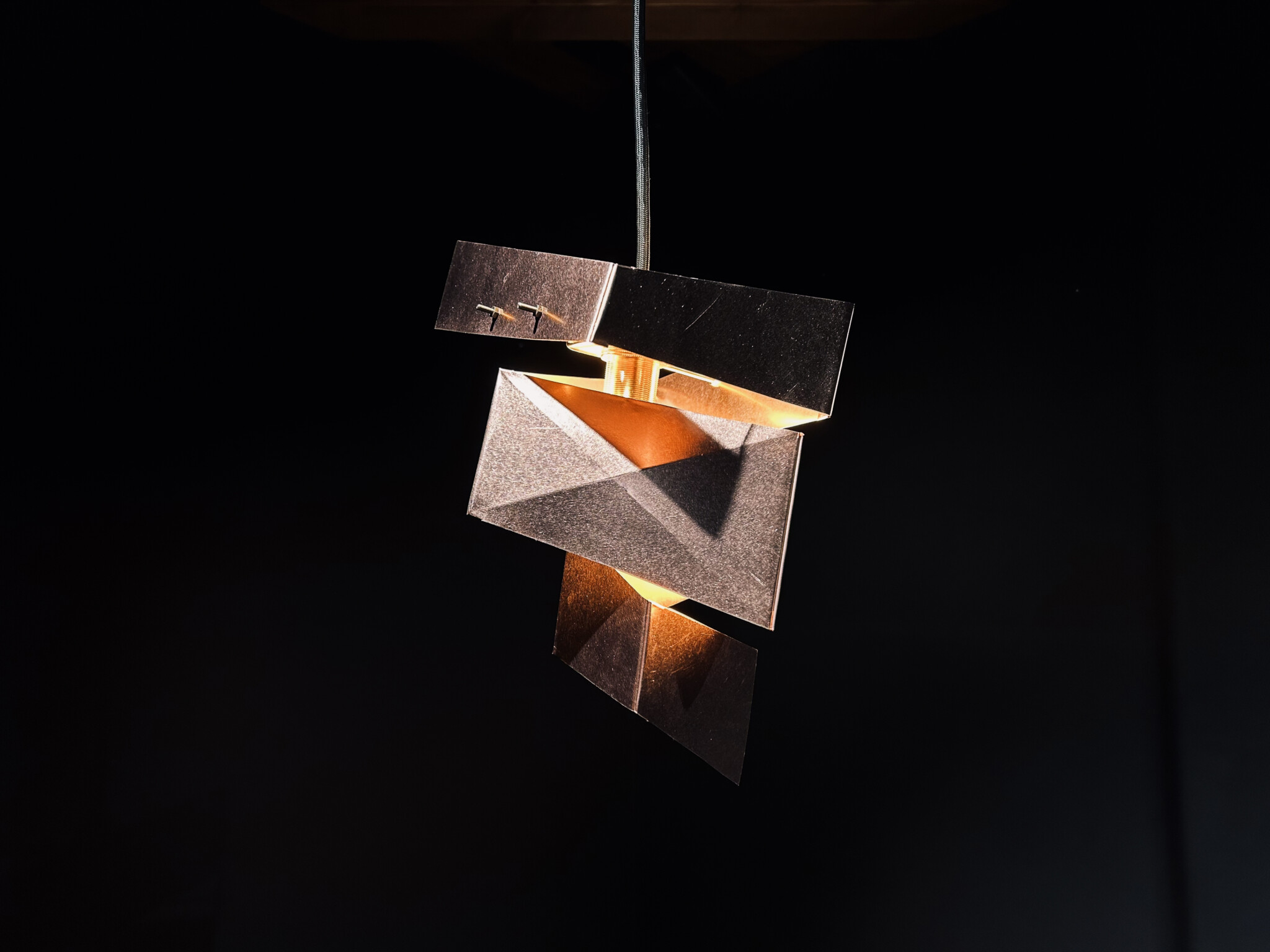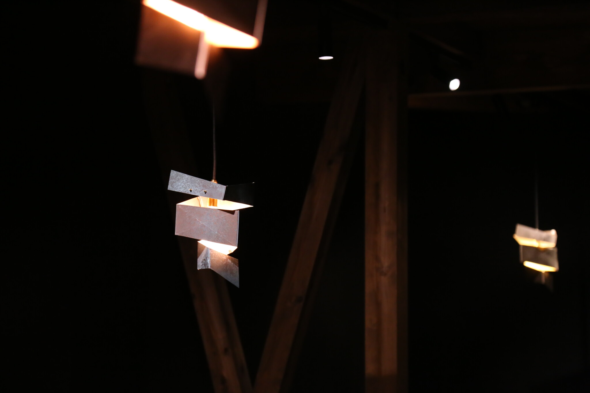 In Japan where rainfall is abundant, the technique of “bankin” meaning “sheet metal” was developed to create seamless roofs to keep the rain out. The process involves hammering and folding thin, ductile metal to make a leak-proof roof. Using this sheet metal technique, we designed a lampshade that looks like a whirlpool. The design is composed of several panels of varying in widths that join together at a seam, connecting with each other to form a swirl of light. The lampshade is composed of multiple materials: not only thick sheet metal such as brass, but also thin and soft metals such as copper. Thick and thin metals alike are folded and sculpted to add strength through geometry. Various recycled metals, including oxidized green-blue copper plates, can be reused, resulting in a light and sustainable product despite its metal nature.