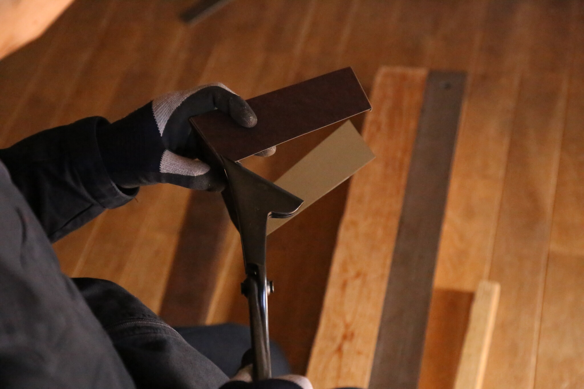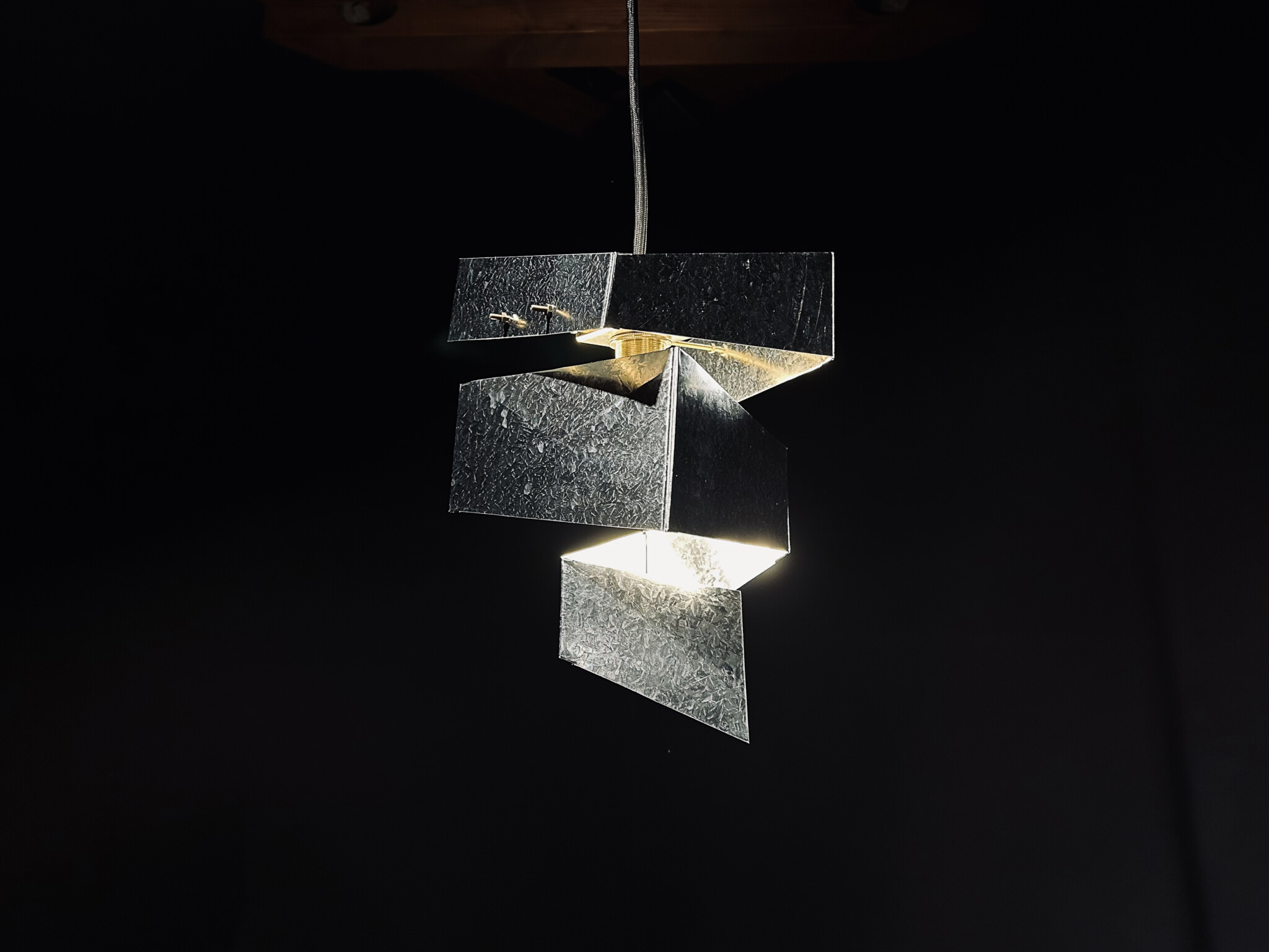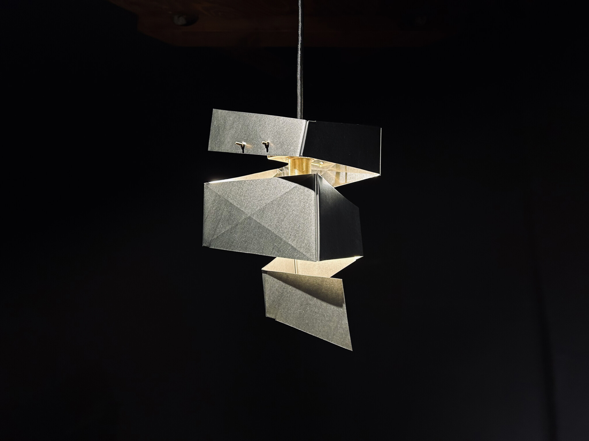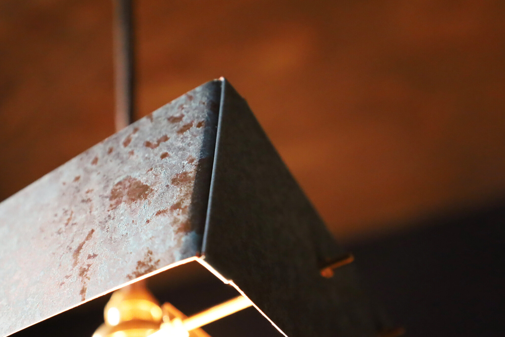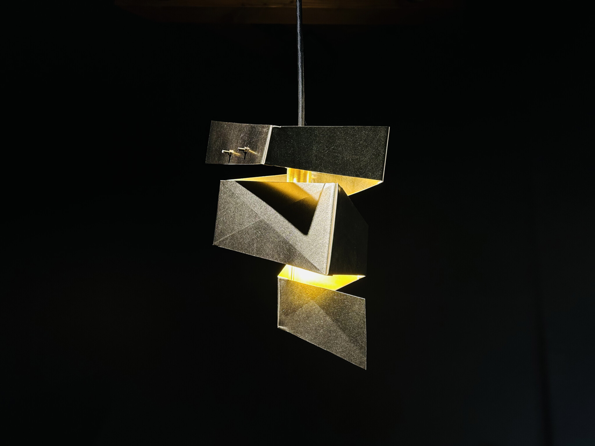 In Japan where rainfall is abundant, the technique of “bankin” meaning “sheet metal” was developed to create seamless roofs to keep the rain out. The process involves hammering and folding thin, ductile metal to make a leak-proof roof. Using this sheet metal technique, we designed a lampshade that looks like a whirlpool. The design is composed of several panels of varying in widths that join together at a seam, connecting with each other to form a swirl of light. The lampshade is composed of multiple materials: not only thick sheet metal such as brass, but also thin and soft metals such as copper. Thick and thin metals alike are folded and sculpted to add strength through geometry. Various recycled metals, including oxidized green-blue copper plates, can be reused, resulting in a light and sustainable product despite its metal nature.