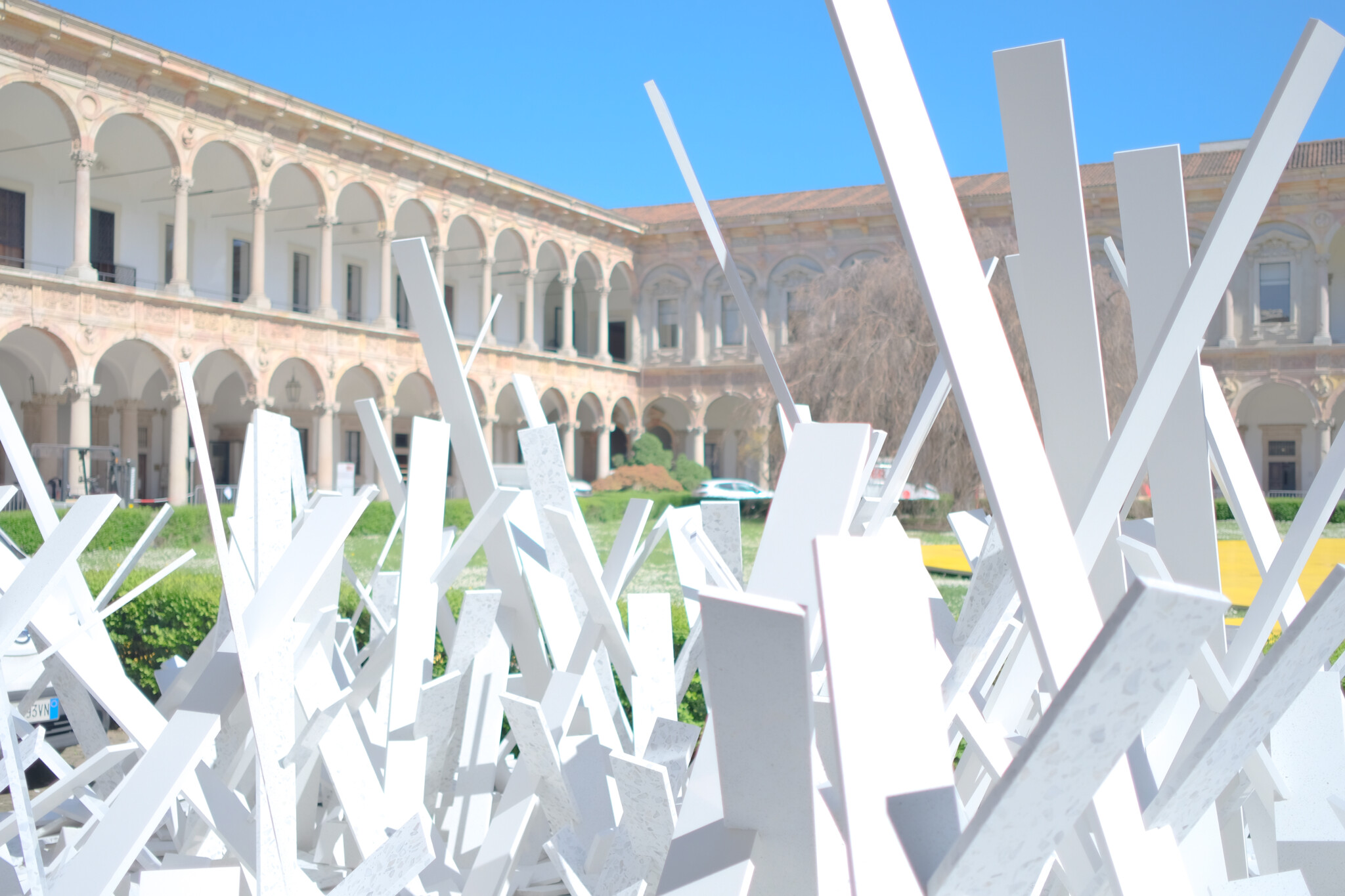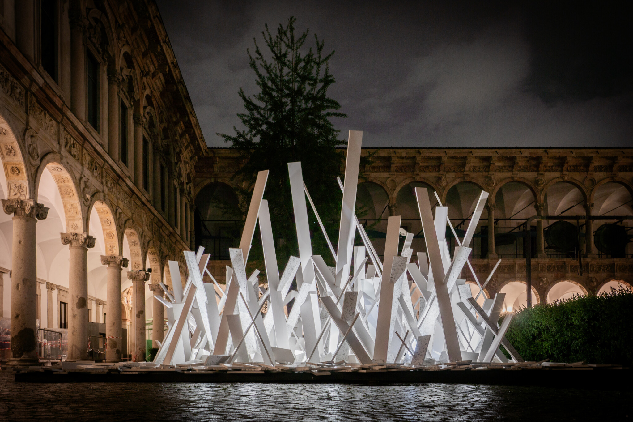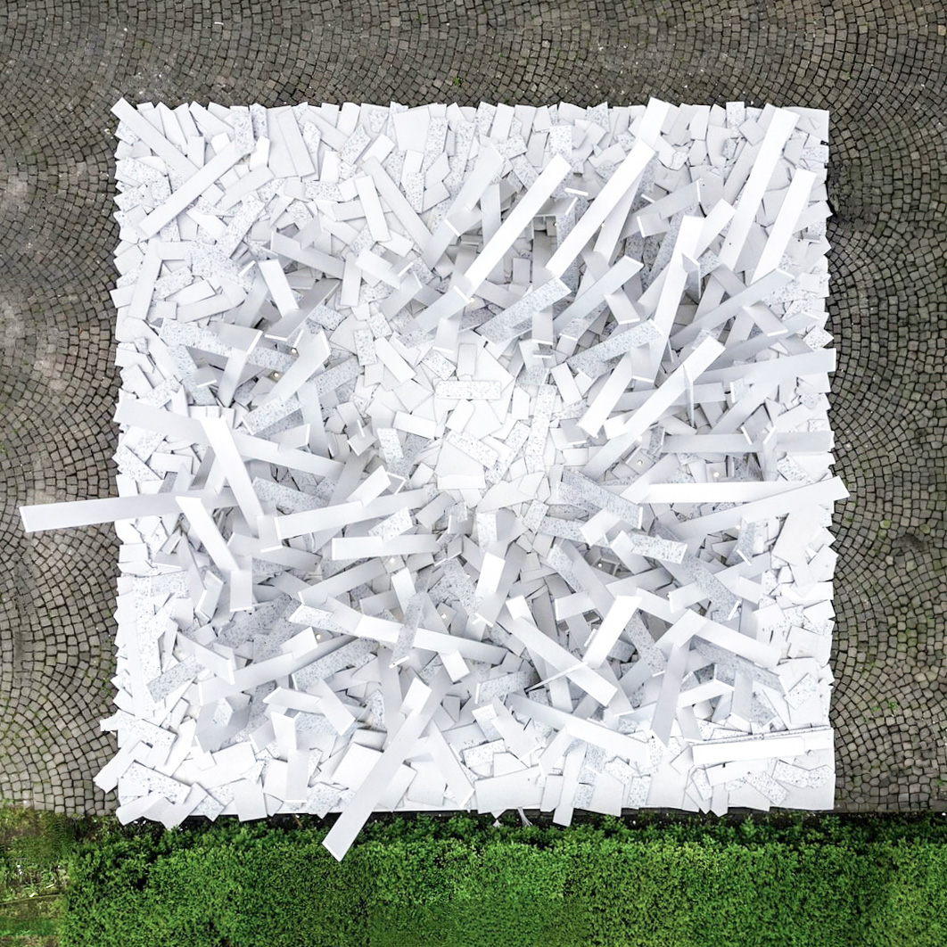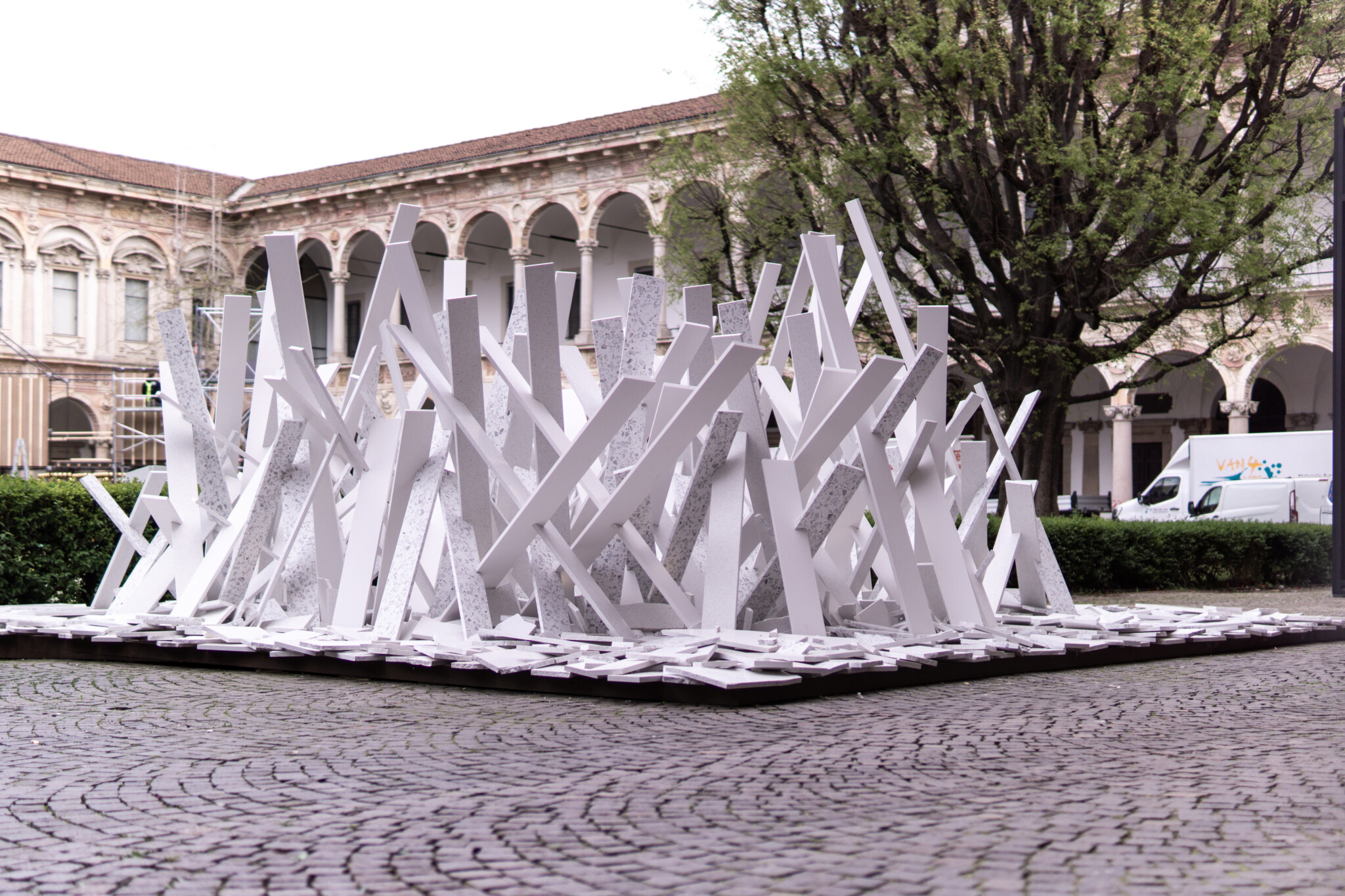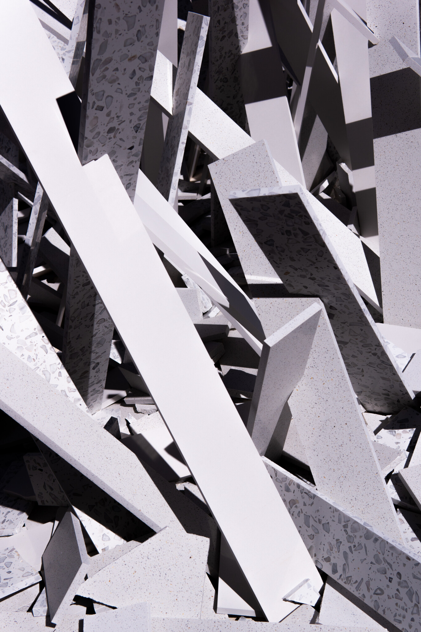 The stone product, manufactured by Quarella, is a composite material composed of various-sized granules that are blended with natural pigments and resins to create a material known for its durability. A range of colors and textures can be specified to show the uniqueness of the aggregate that is blended to form the panels. The material promotes sustainability as it is composed of stone waste products that would typically be discarded during the quarry of conventional stone products. By collecting the waste and binding it together, a beautiful, strong material is produced that minimizes waste and the energy that would normally be consumed to use conventional stone products. The piling of stone shards that comprise the ground of the installation, merging with the upright modules, expresses this process. The discarded debris is shown assembled to create a new type of environment.