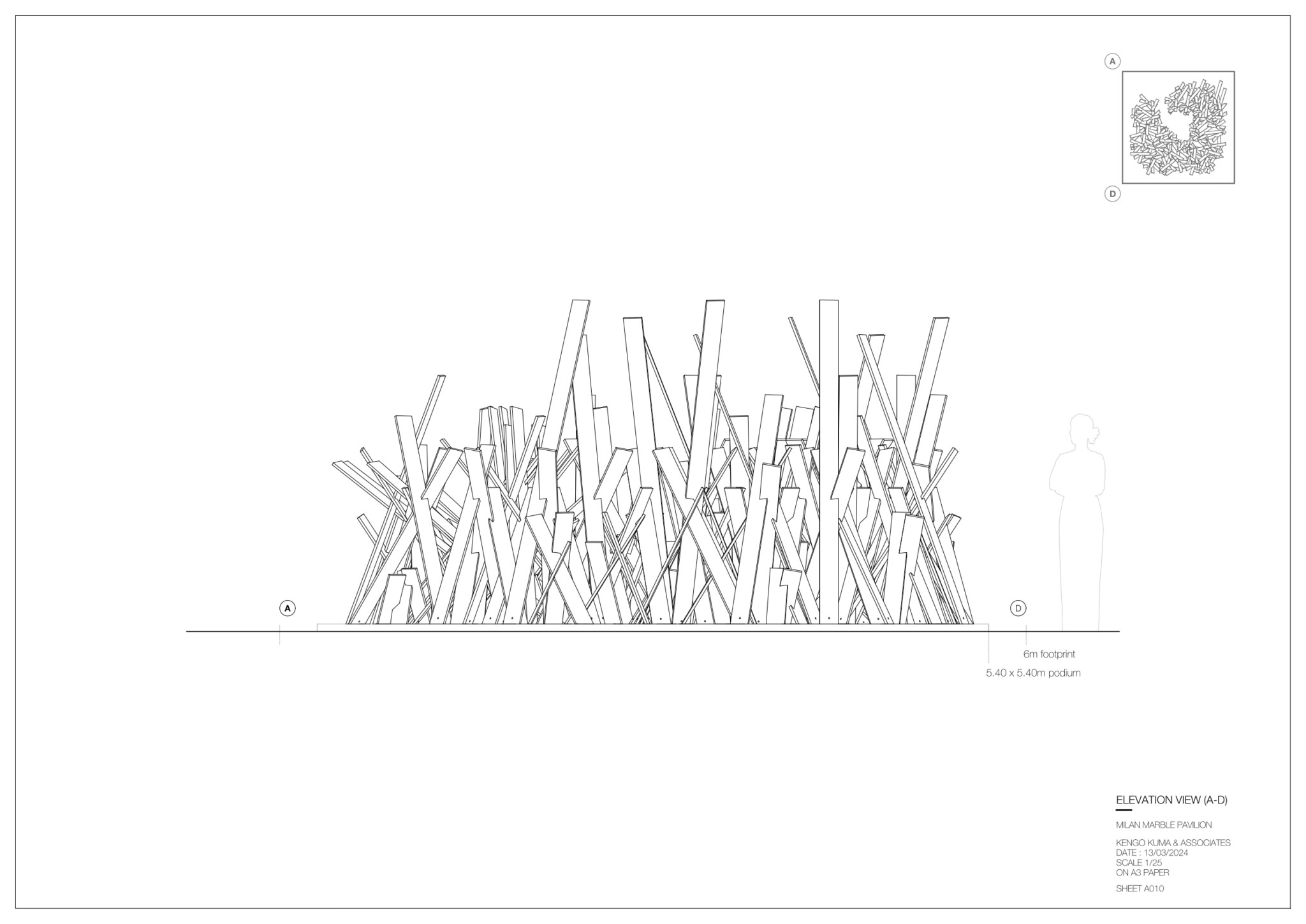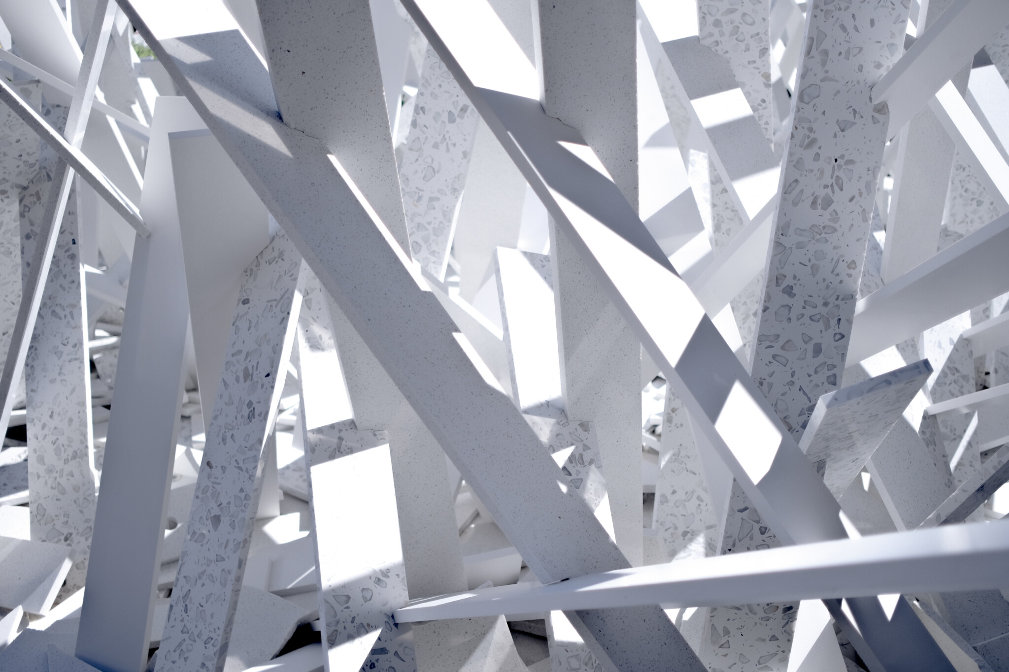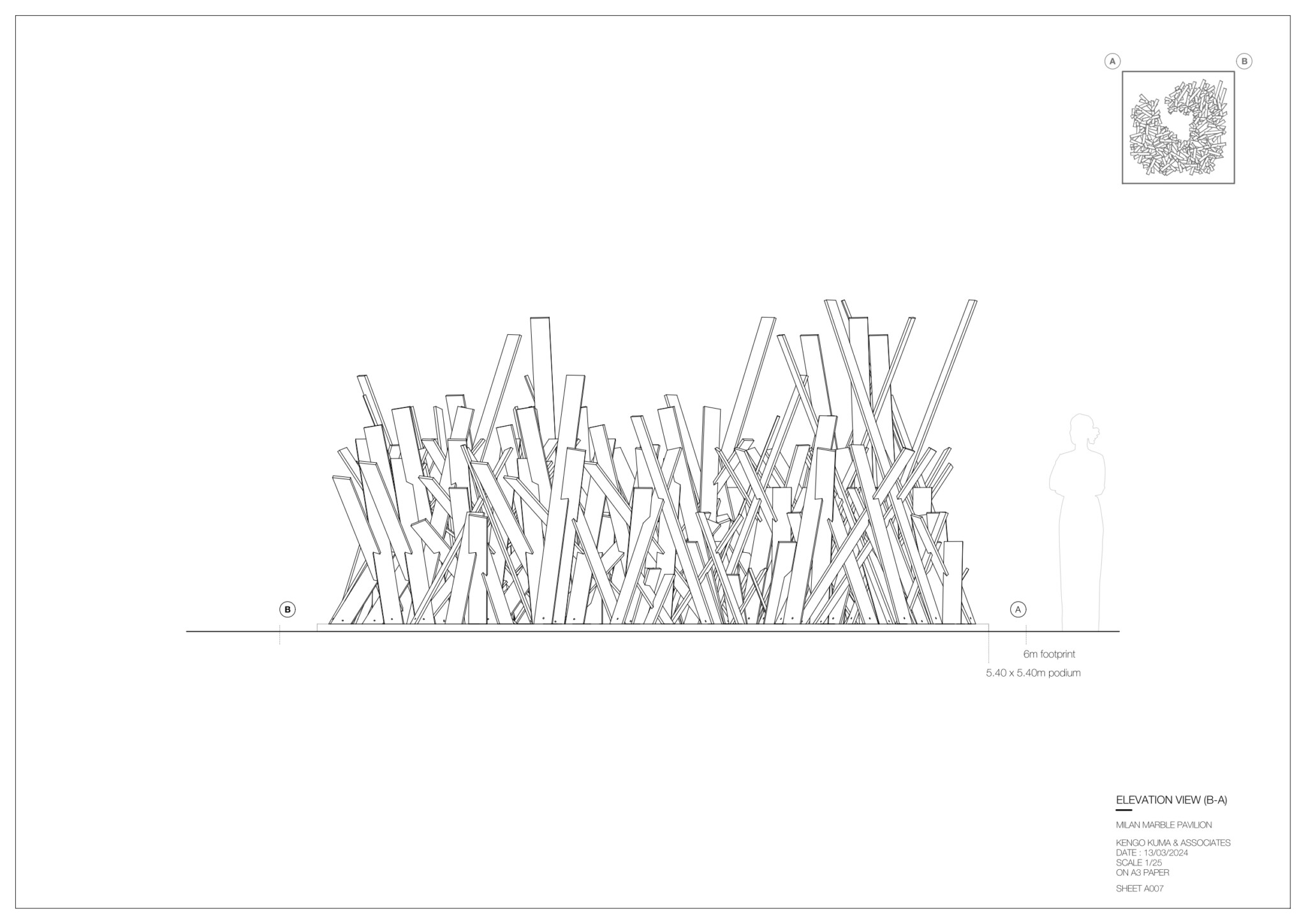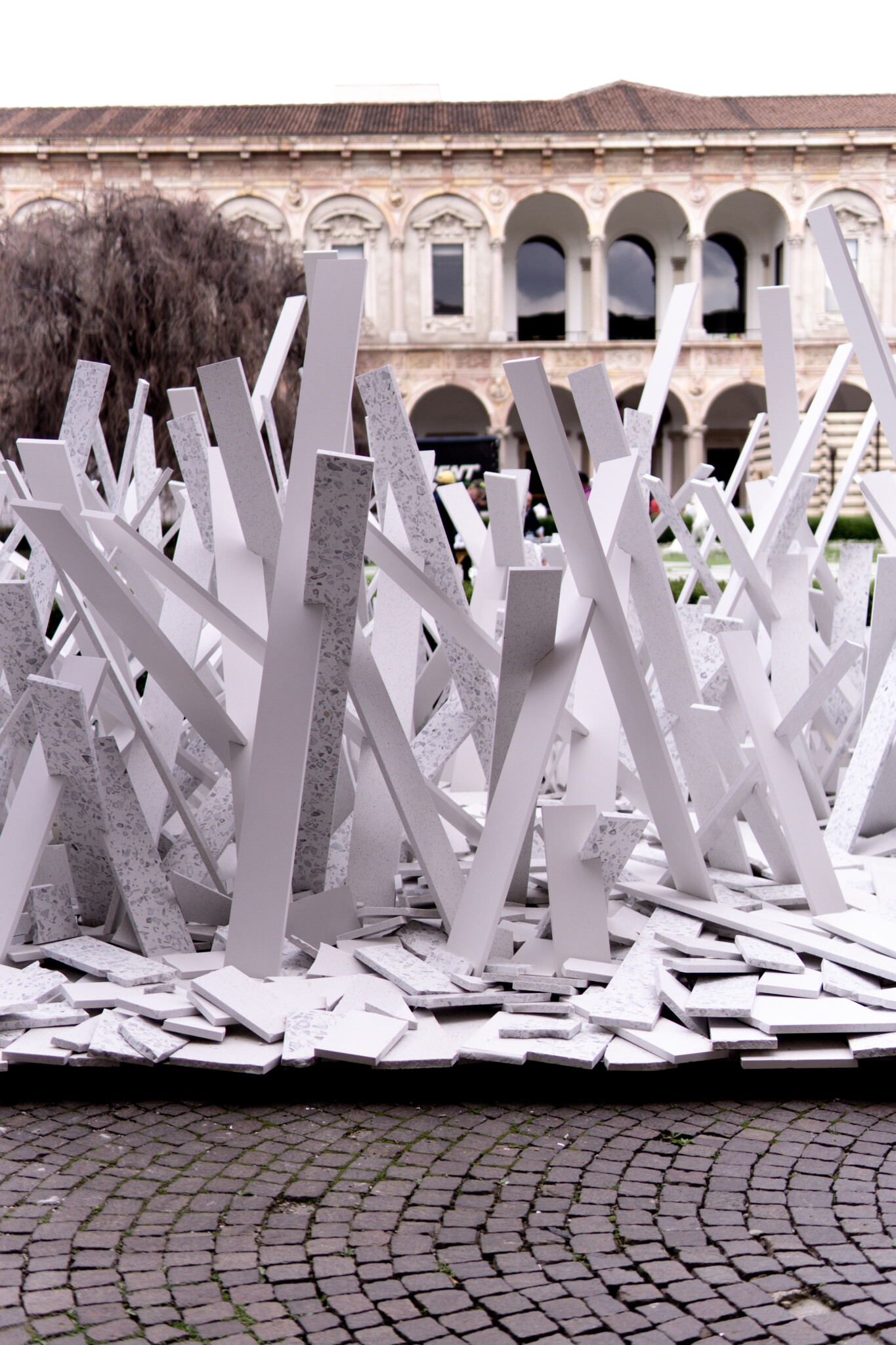 The installation consists of stone modules which are carefully joined to create individual, aesthetically and structurally balanced compositions. These are then arranged within a free field, wherein the maximum and minimum extensions possible with the material are expressed by the seemingly randomized lengths of each panel. As one moves around the project, the field oscillates between the gestural, the random, and the natural, constantly changing based on one’s perspective. From certain views, one can see all the way through the installation, while at other vantages the modules merge to create the feeling of a dense thicket.