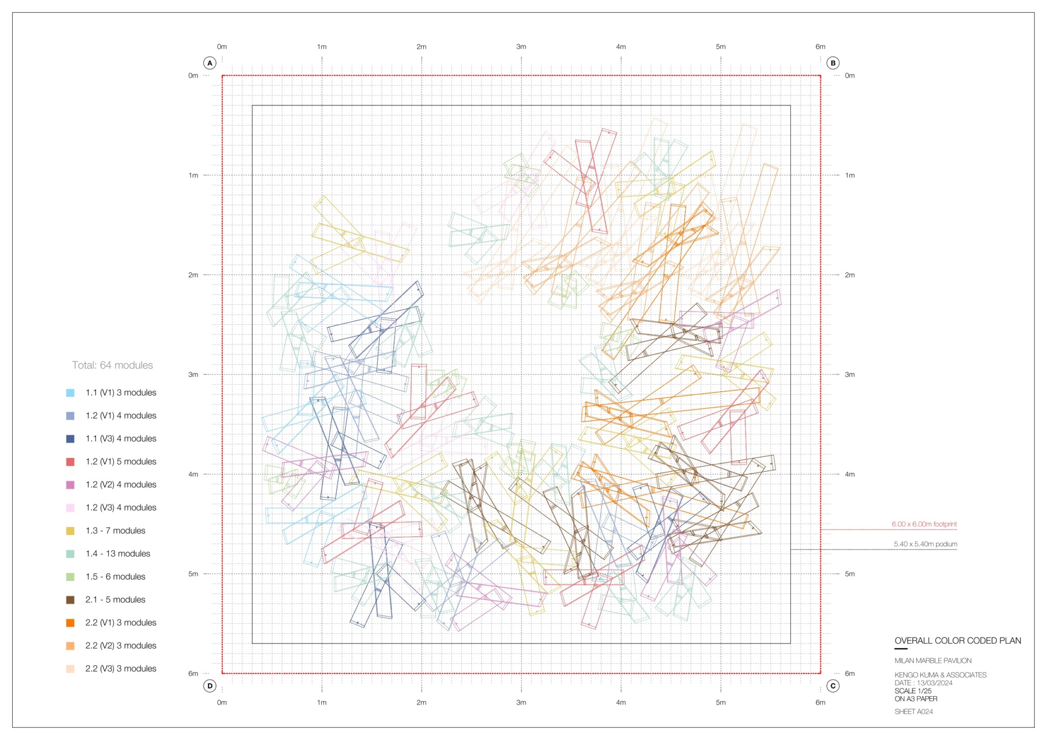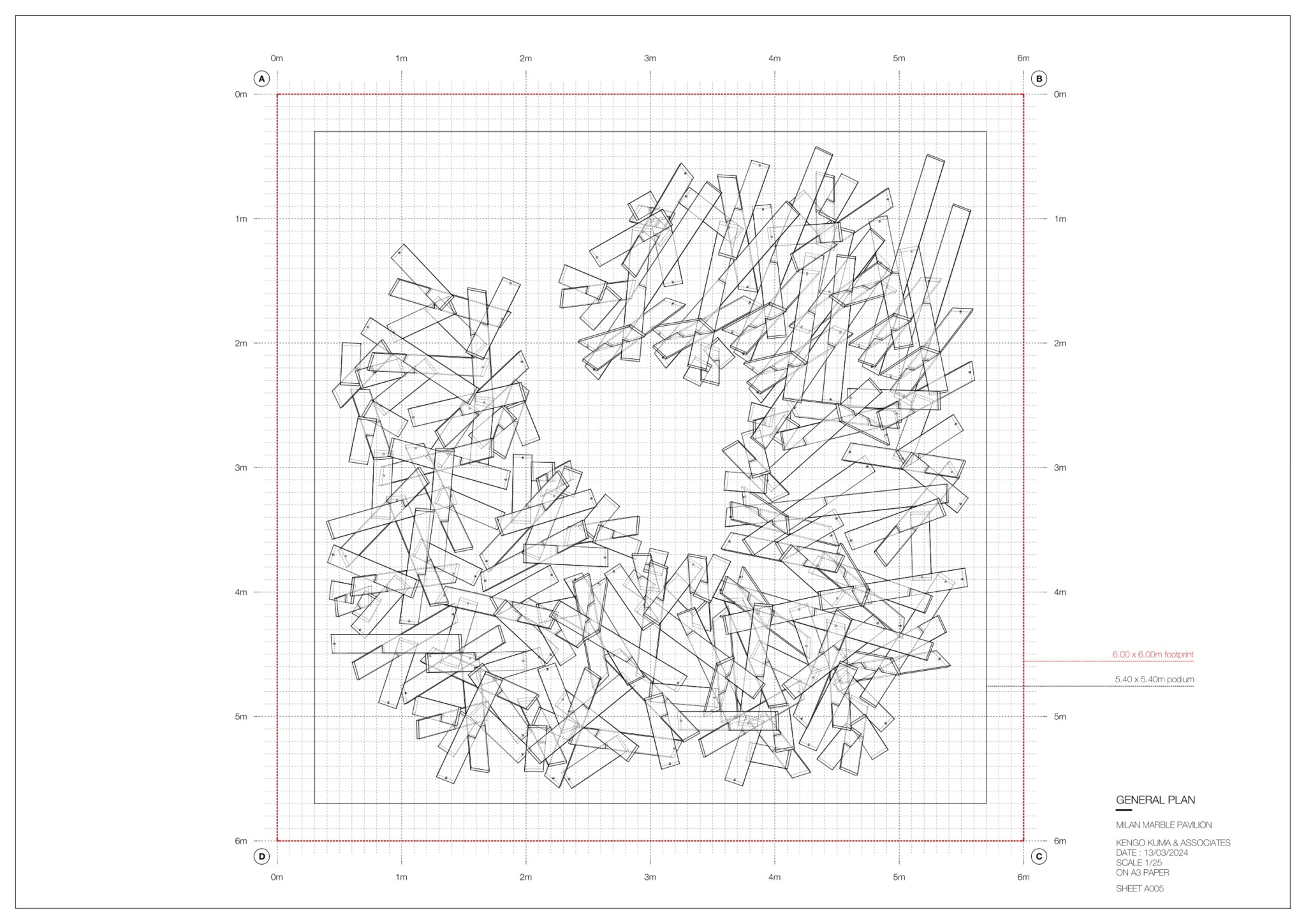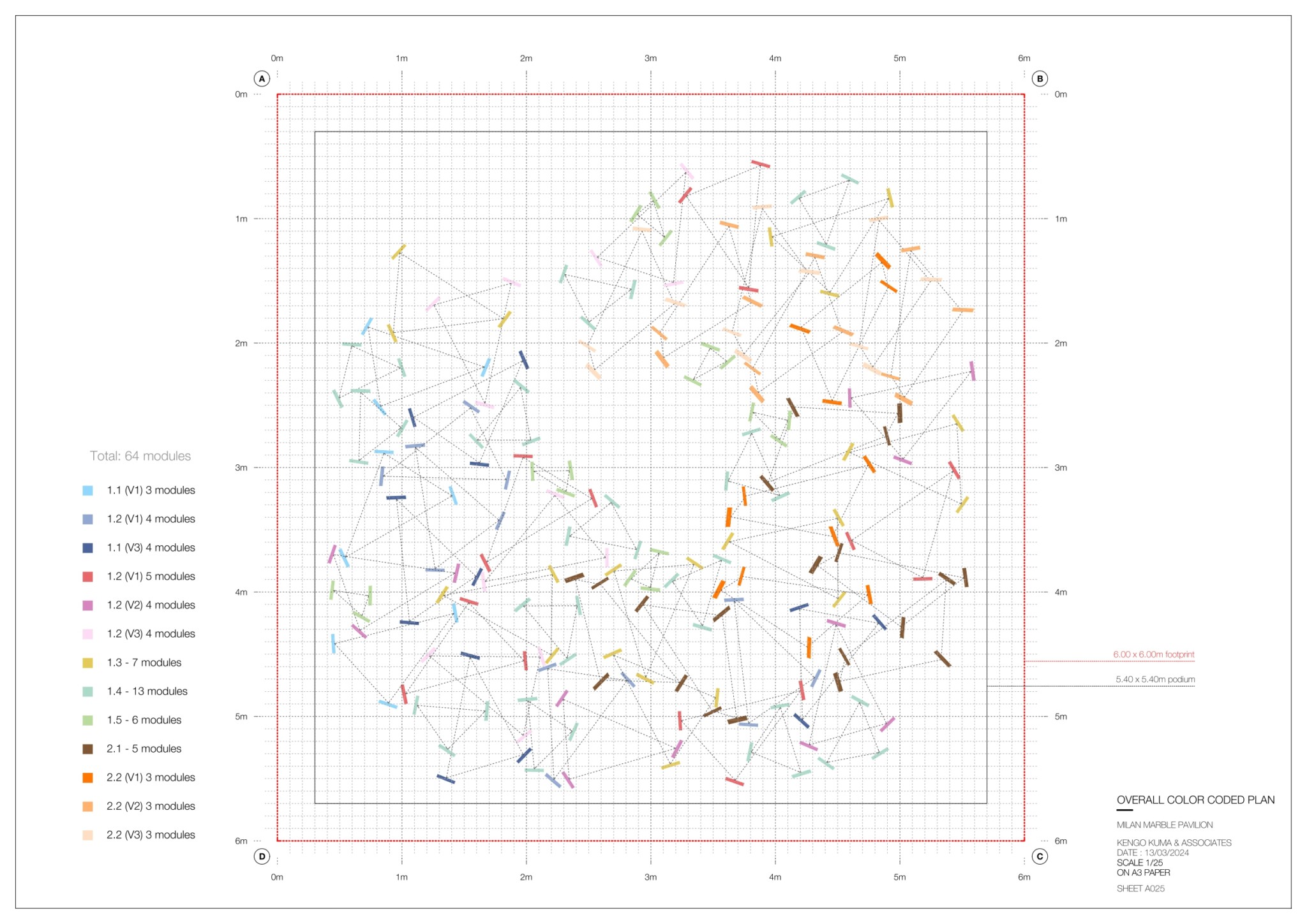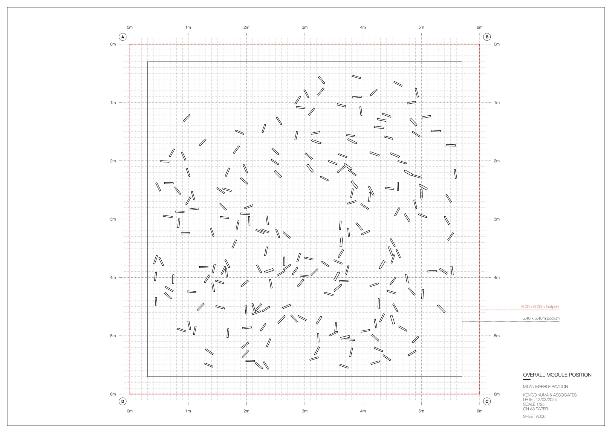 The installation consists of stone modules which are carefully joined to create individual, aesthetically and structurally balanced compositions. These are then arranged within a free field, wherein the maximum and minimum extensions possible with the material are expressed by the seemingly randomized lengths of each panel. As one moves around the project, the field oscillates between the gestural, the random, and the natural, constantly changing based on one’s perspective. From certain views, one can see all the way through the installation, while at other vantages the modules merge to create the feeling of a dense thicket.