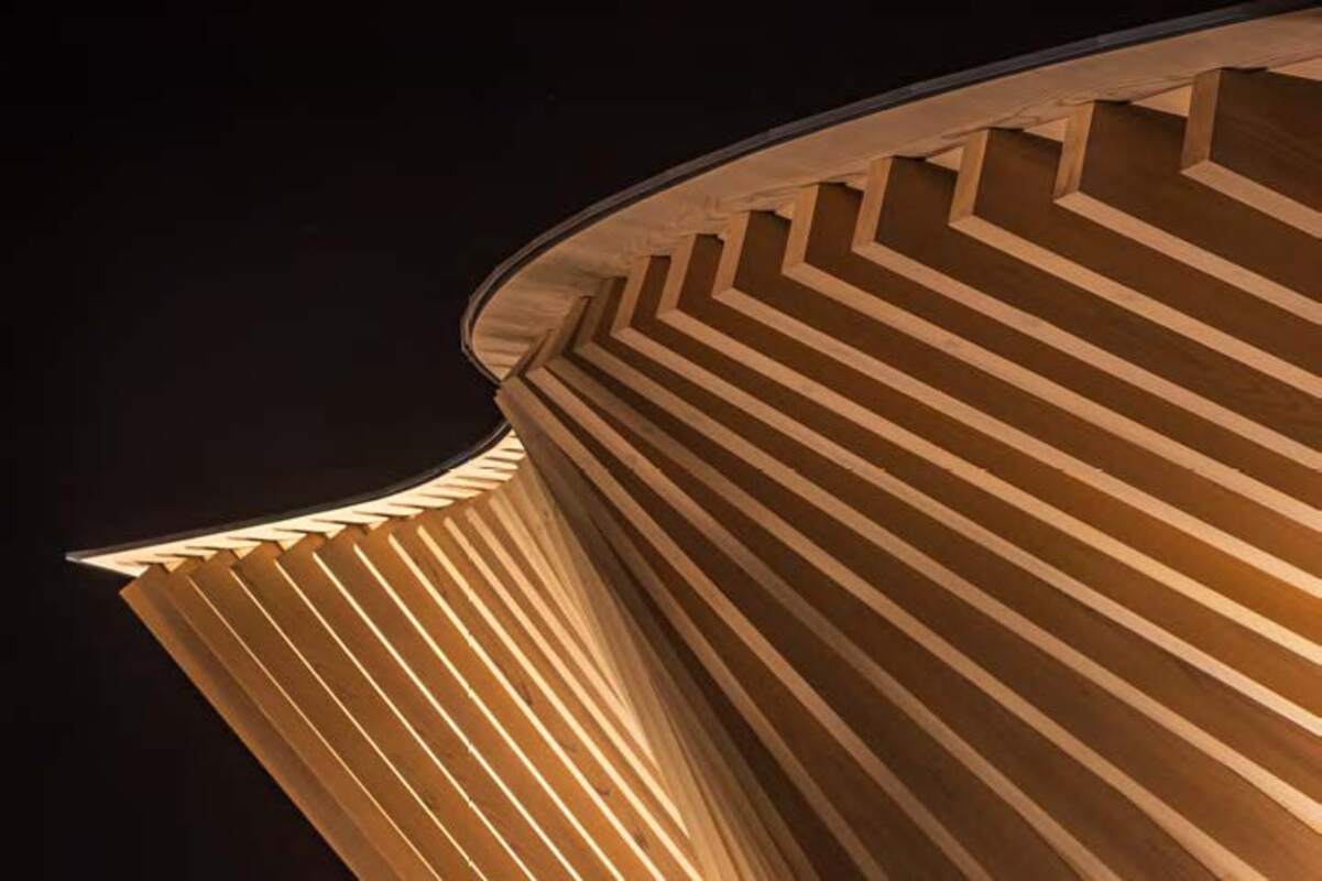 The eaves, which extend up to 4 meters, curve at the top to blend in with the surrounding mountain range and the rafters create a broad, curved surface. The eaves also serve as a message of cooperation and friendship to the local community.