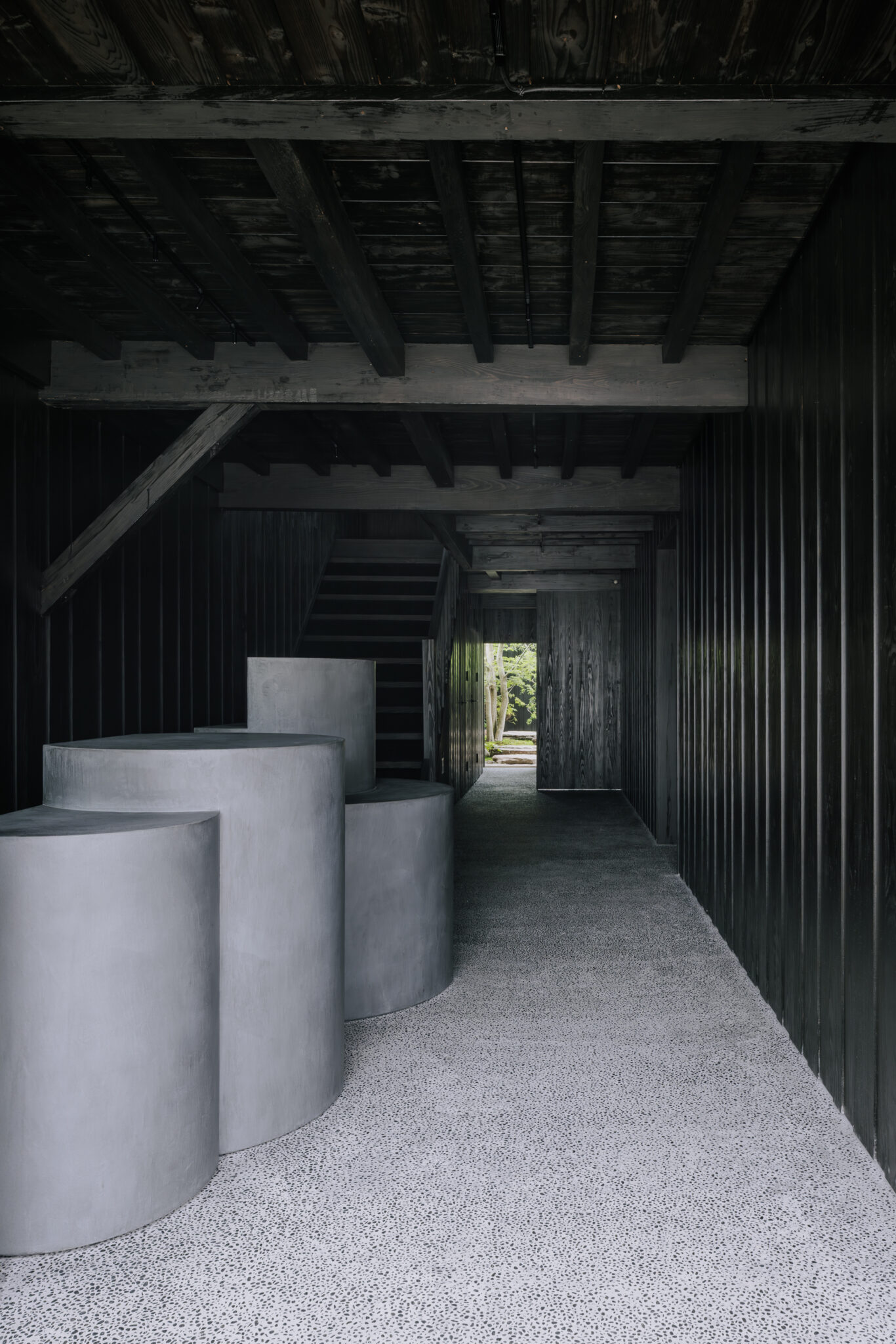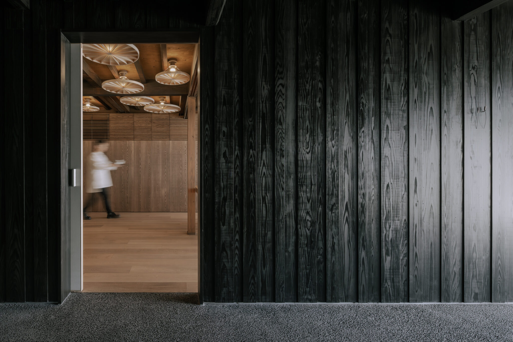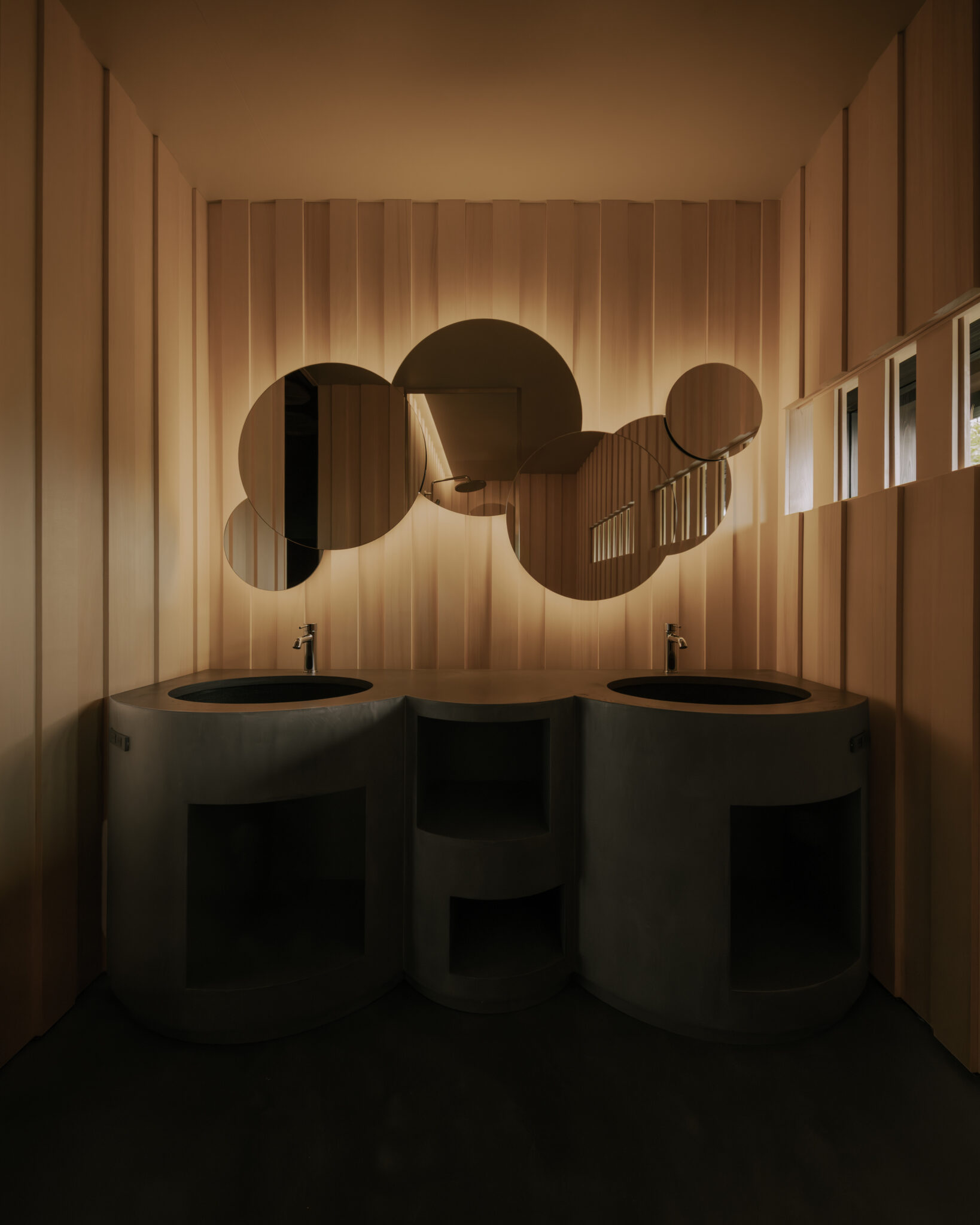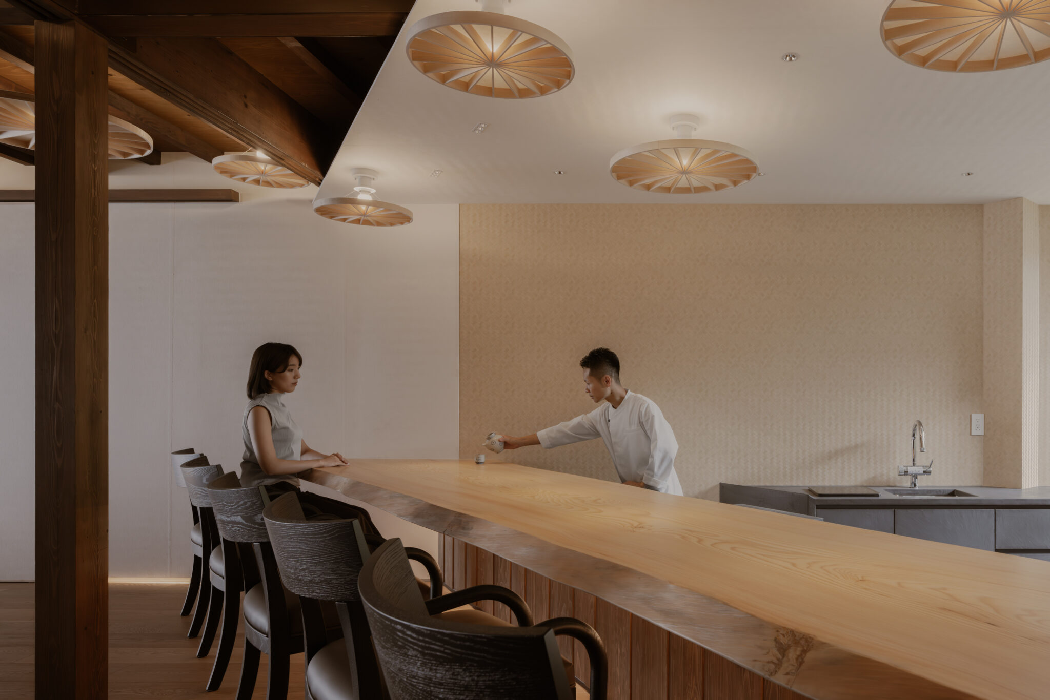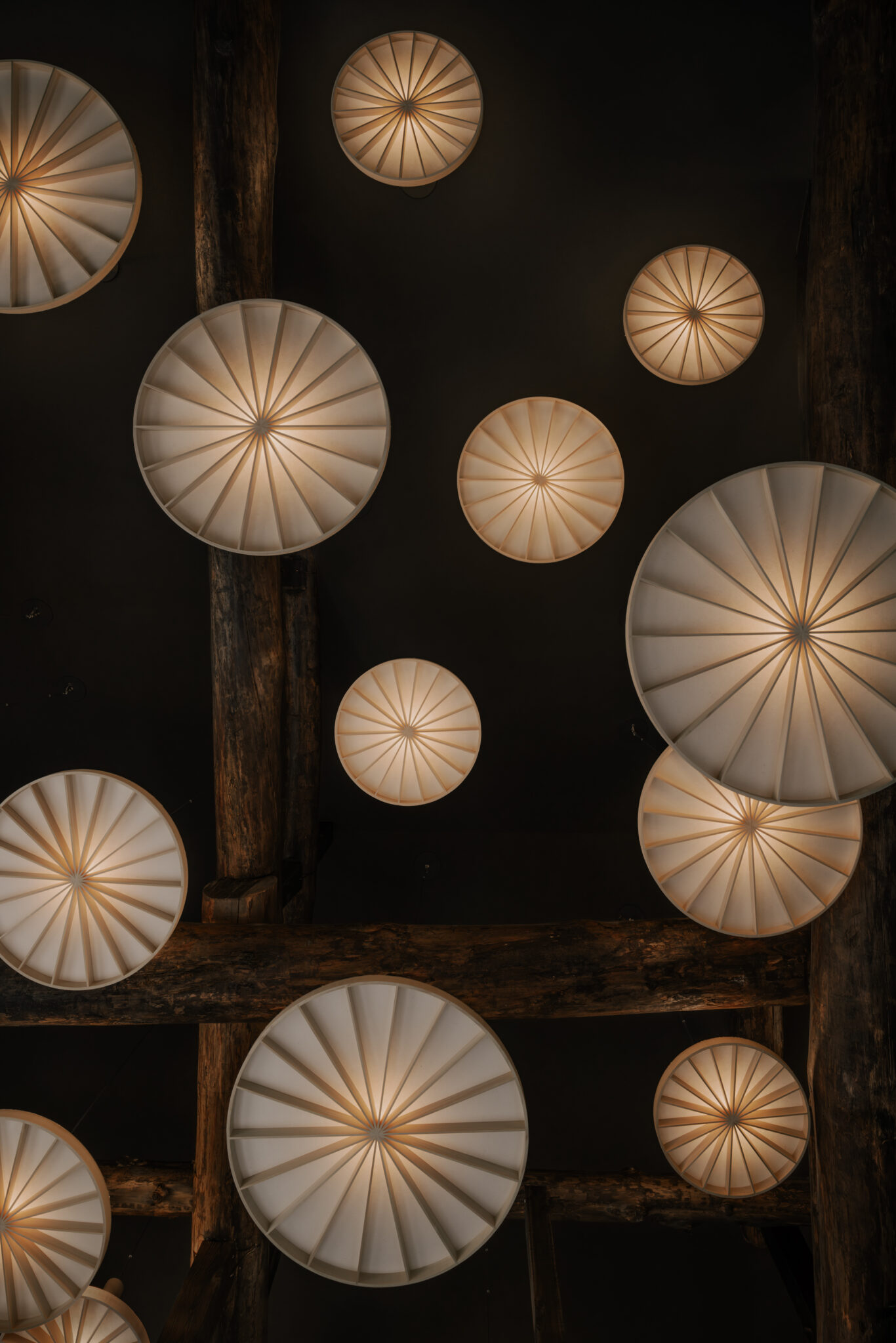 Circular lighting elements, inspired by the steam and aroma that rise during the sake brewing process, appear to float within the space, layering the refined beauty of old timber construction with a sense of contemporary transparency.