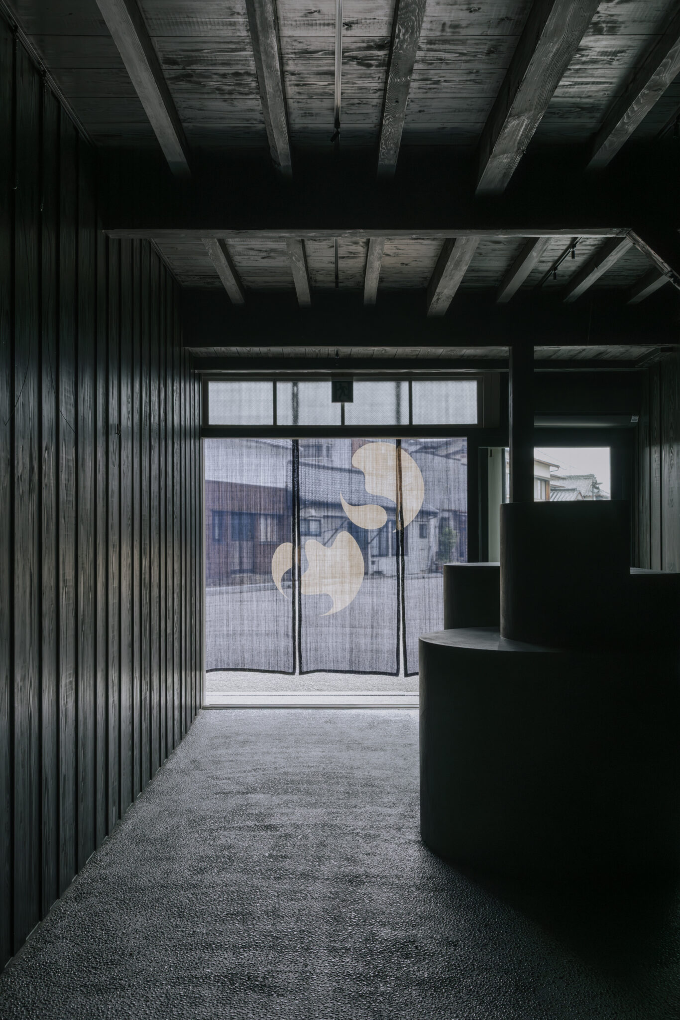Circles made of diverse materials hover within the traditional structure, offering an architectural expression of Nabeshima—a sake that continually contrasts and connects tradition with the present.