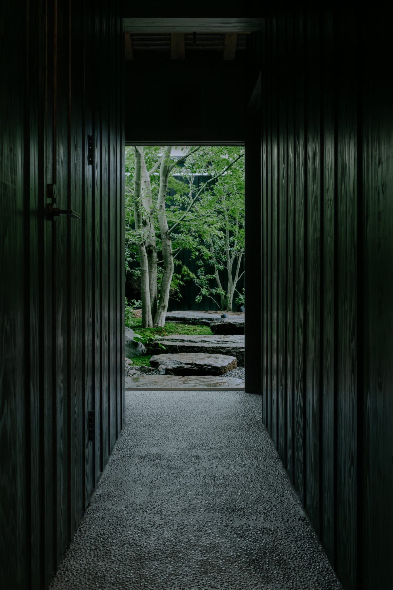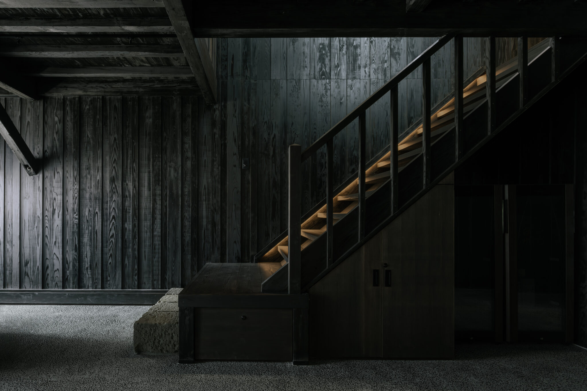 The first-floor restaurant is softly wrapped in white with washi paper and woven ajiro. The second-floor guest rooms preserve the original earthen walls, creating quiet and immersive darkness.