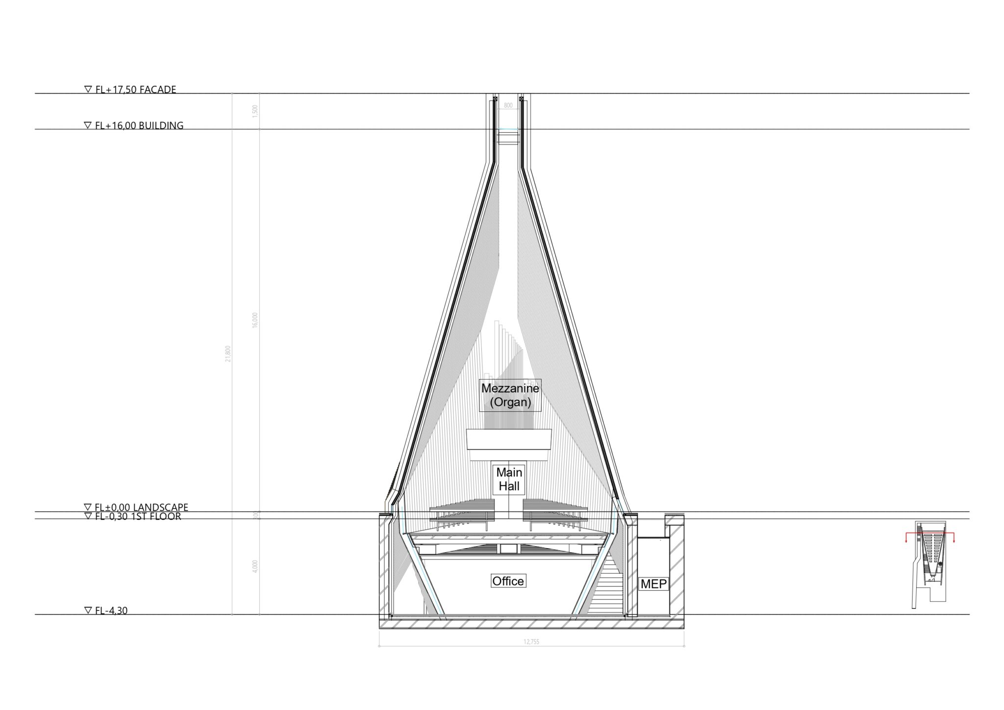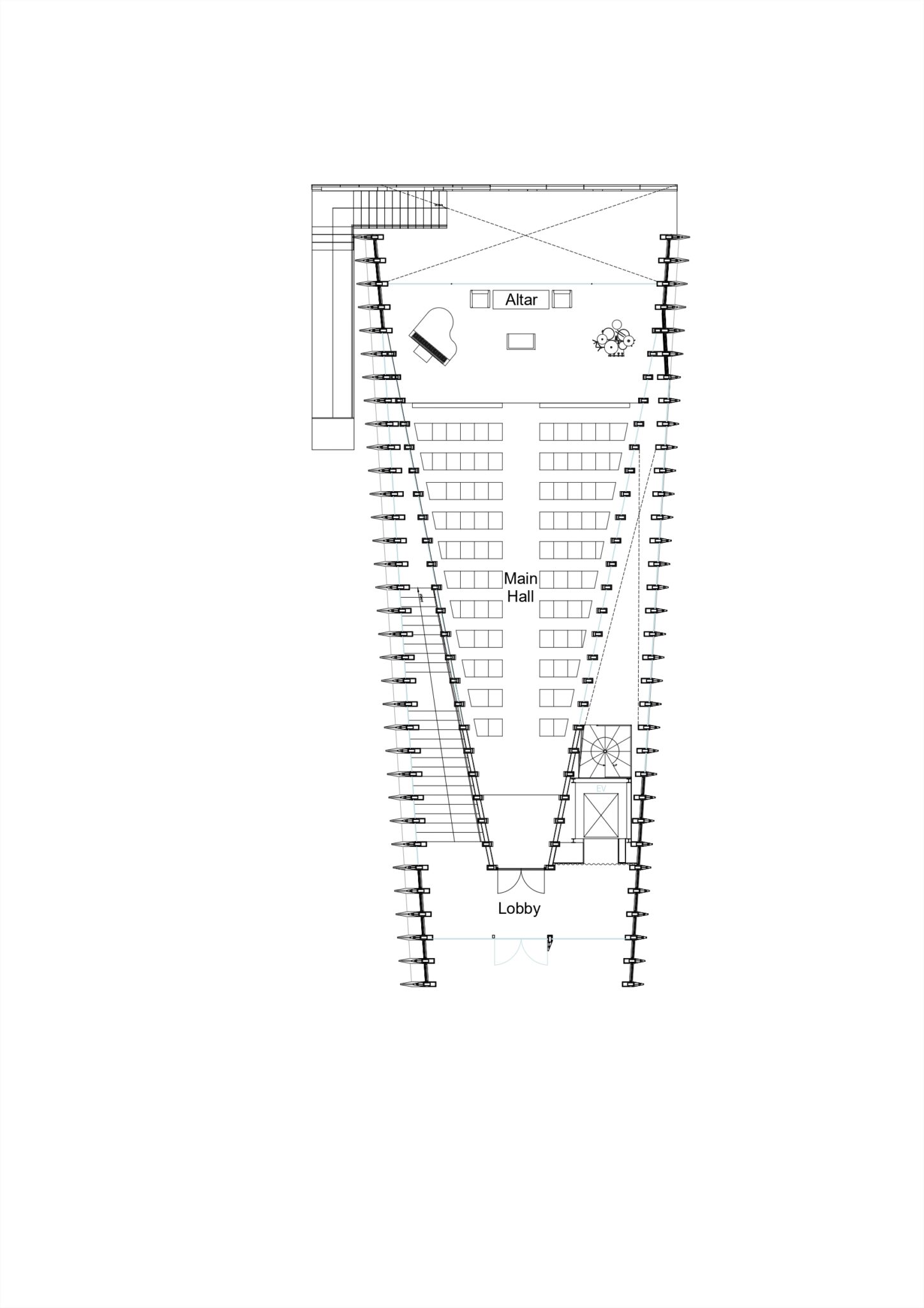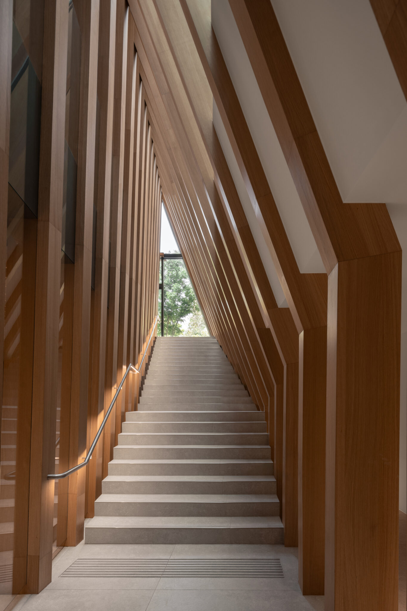 A skylight at the top draws natural light into the chapel’s interior, reaching even the basement level and enhancing the spiritual experience of both the main hall and the circulation areas.