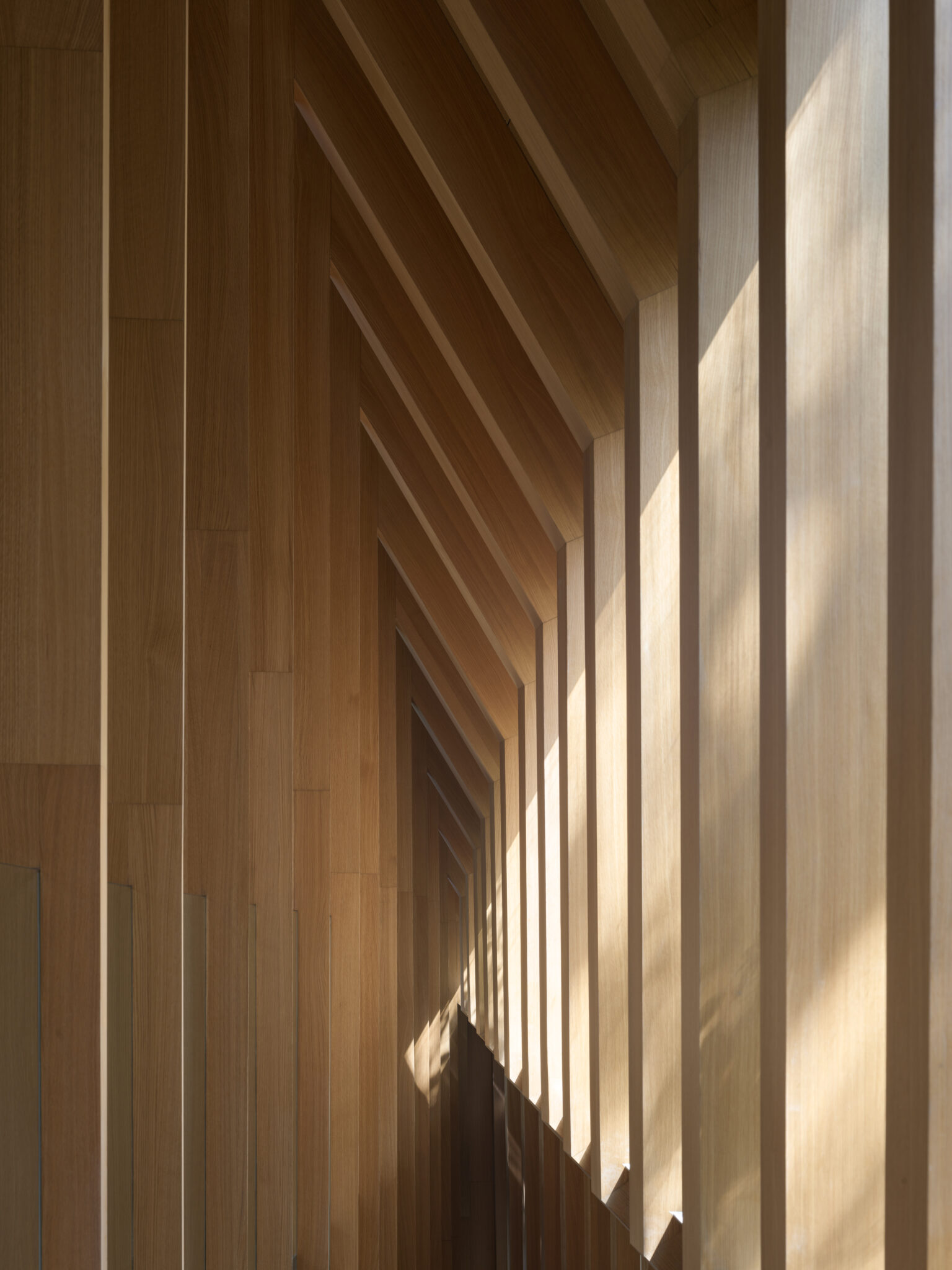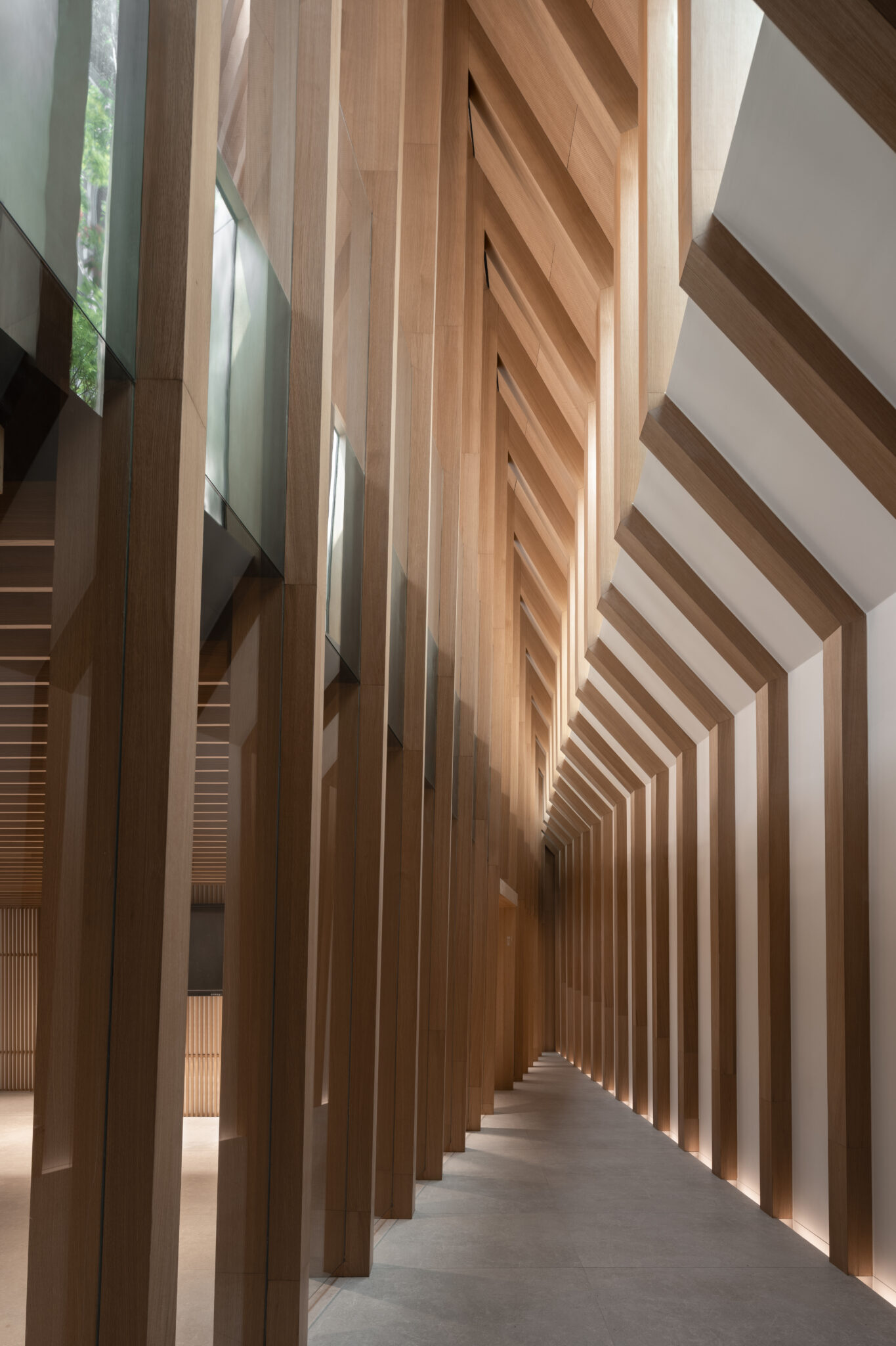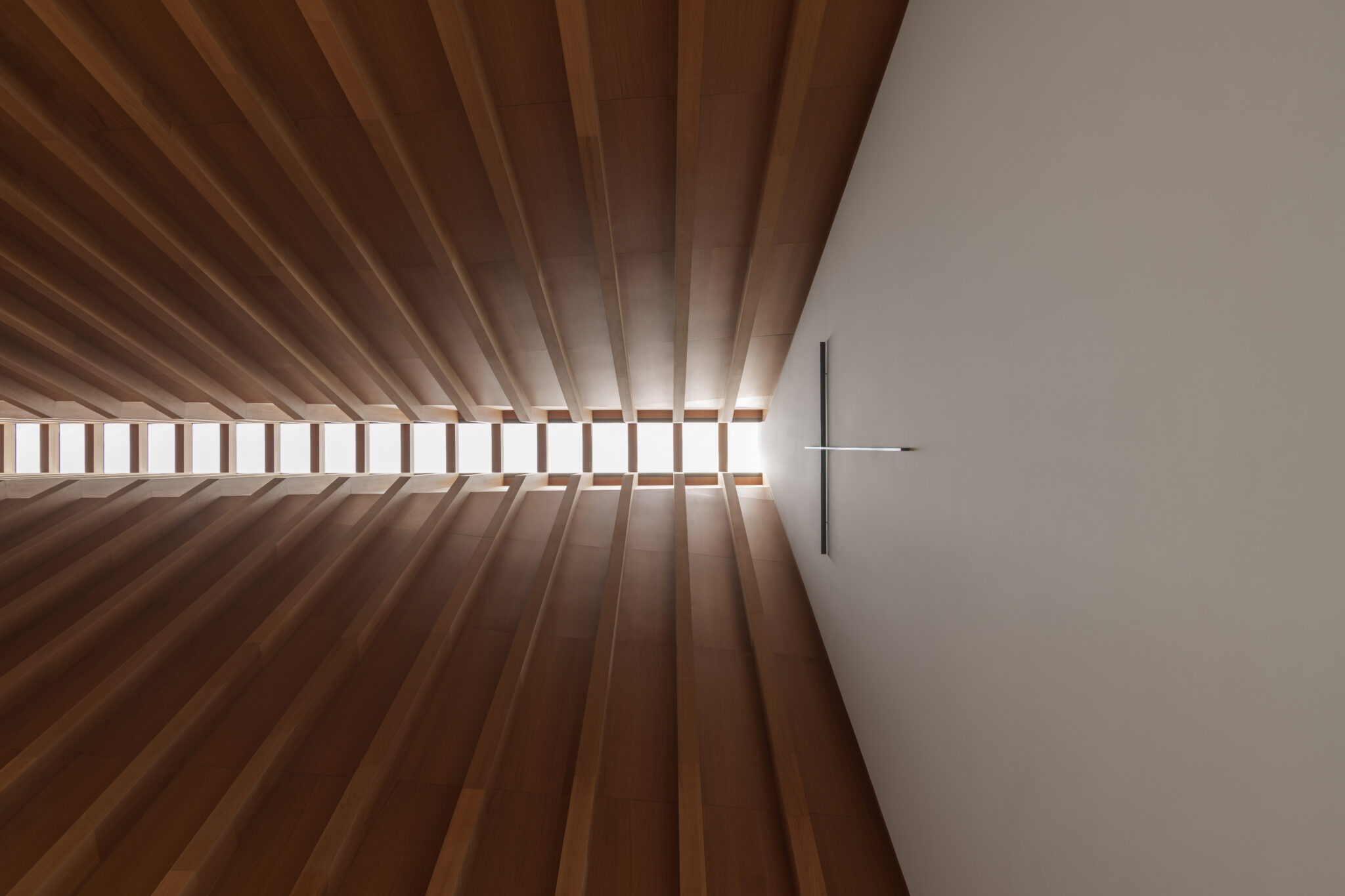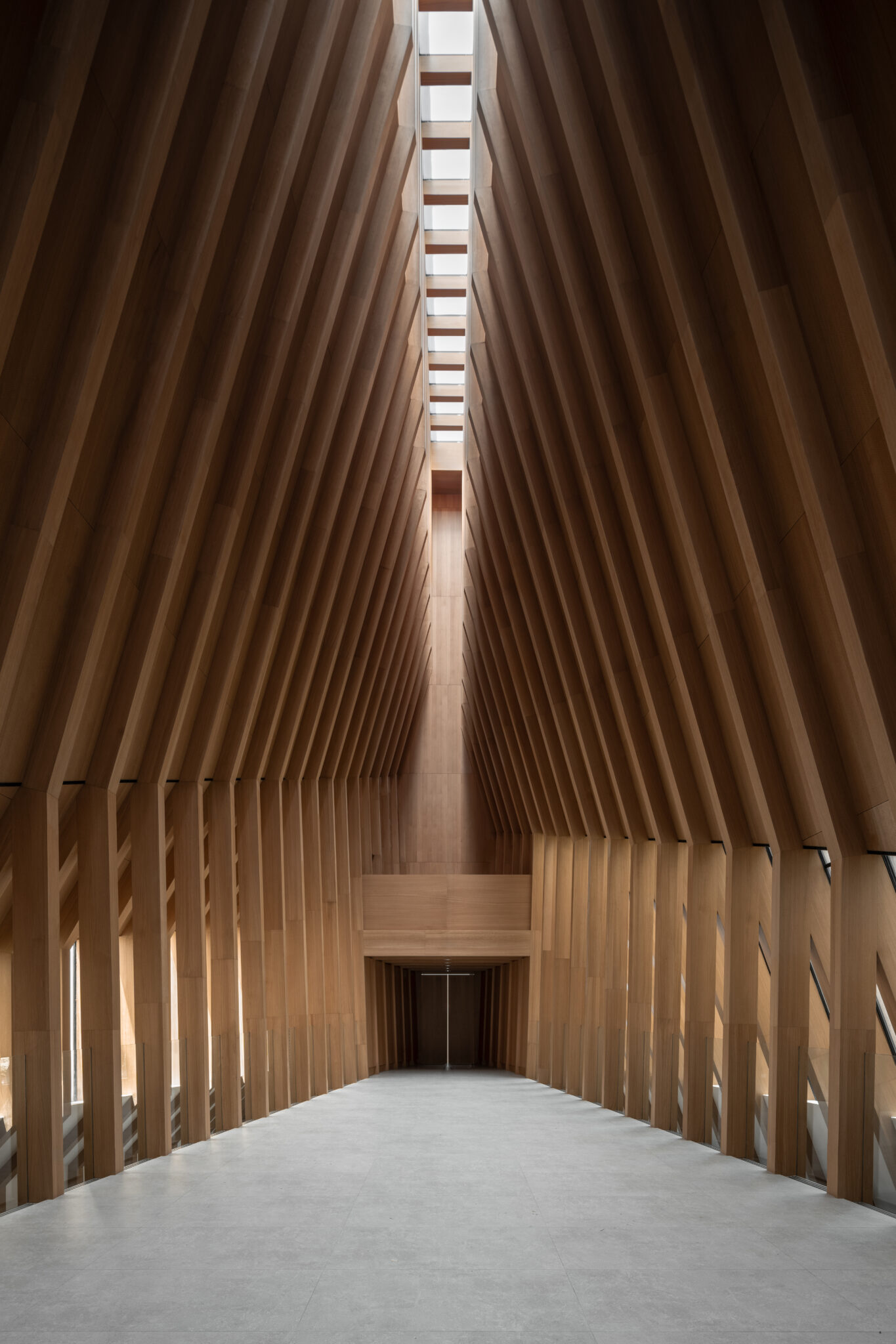 The chapel’s form is shaped by a delicate rhythm of slender wooden columns—each uniquely angled in a subtle gradient. While seemingly repetitive, these vertical elements create a quiet sense of movement and dignity. They not only define the architectural form, but also organize the spaces within—from the main hall to the underground level—conveying a sense of purity and calm that stands apart from the surrounding urban chaos.