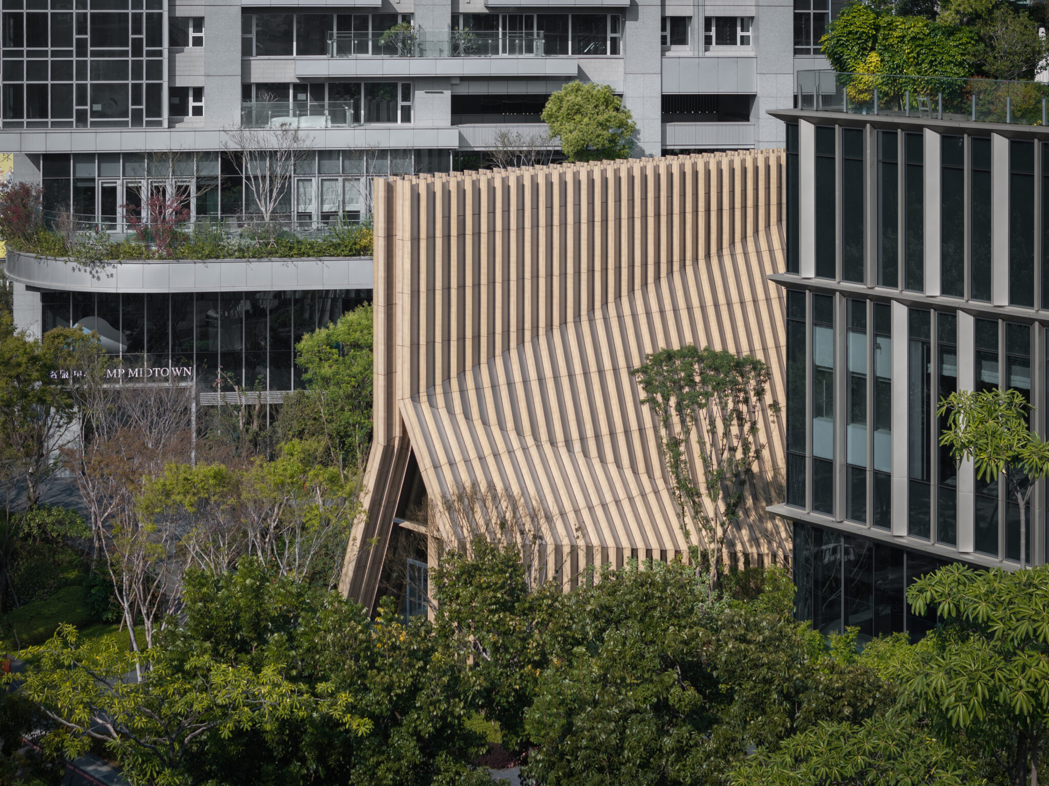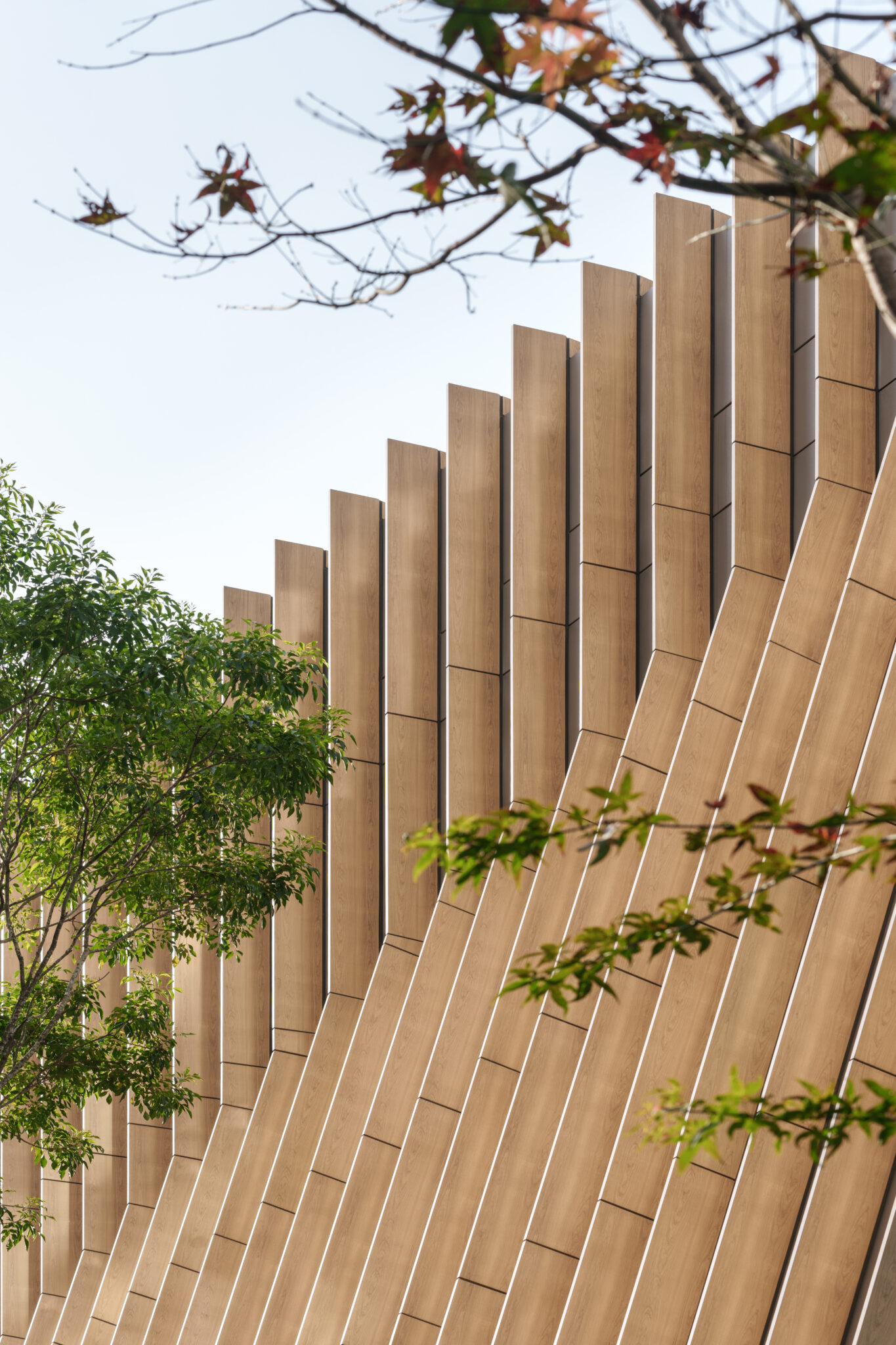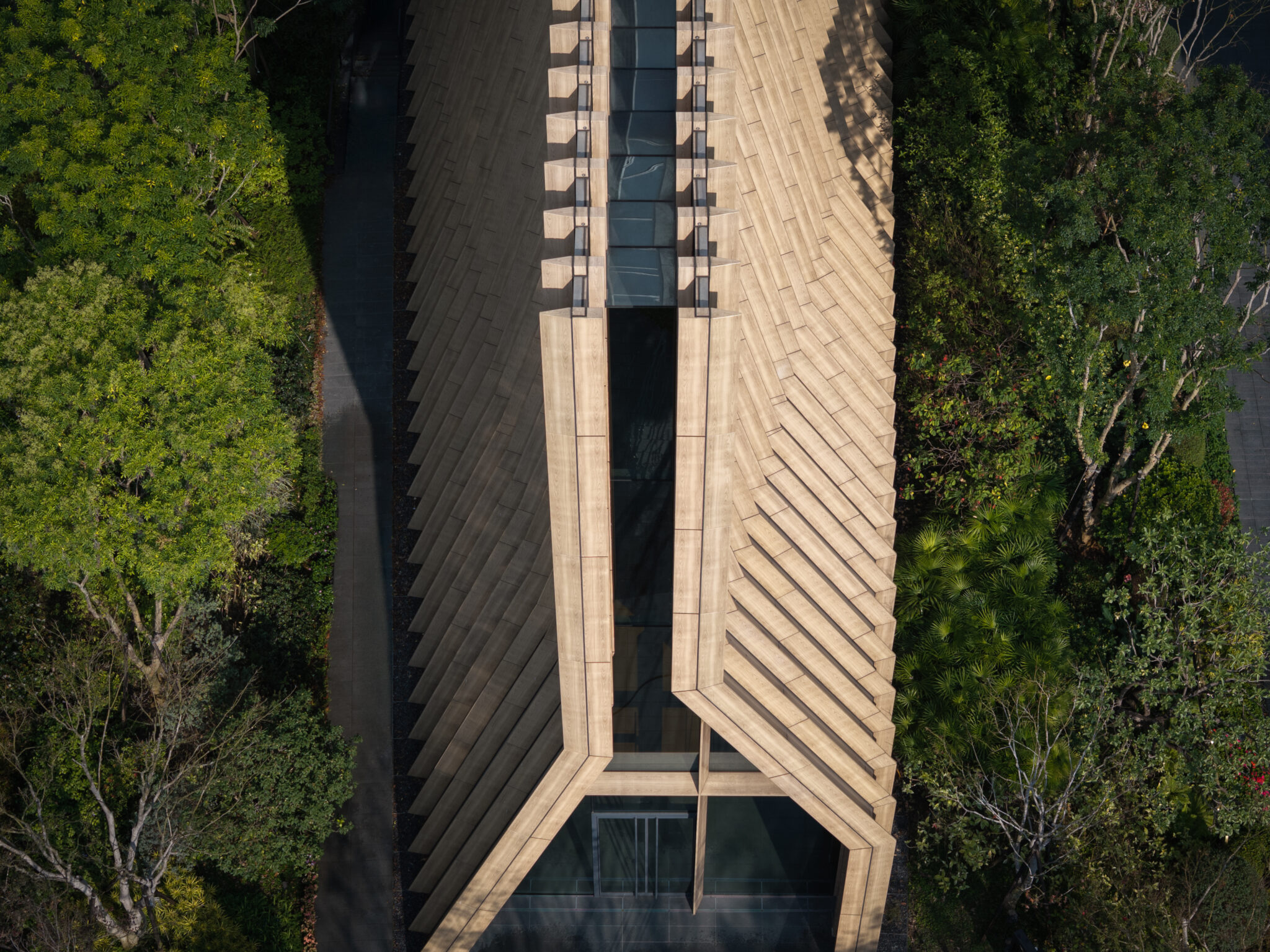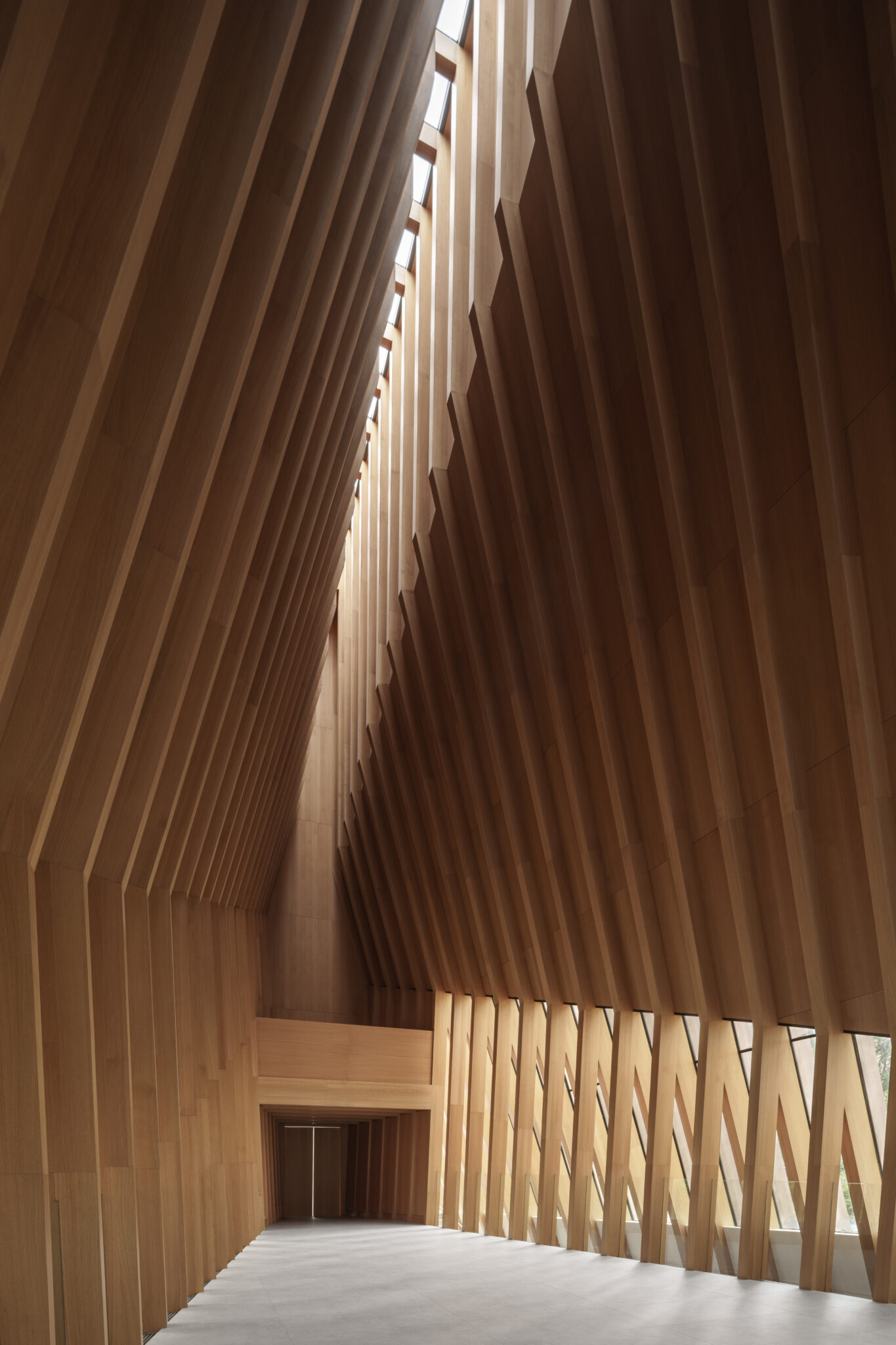 The chapel’s form is shaped by a delicate rhythm of slender wooden columns—each uniquely angled in a subtle gradient. While seemingly repetitive, these vertical elements create a quiet sense of movement and dignity. They not only define the architectural form, but also organize the spaces within—from the main hall to the underground level—conveying a sense of purity and calm that stands apart from the surrounding urban chaos.