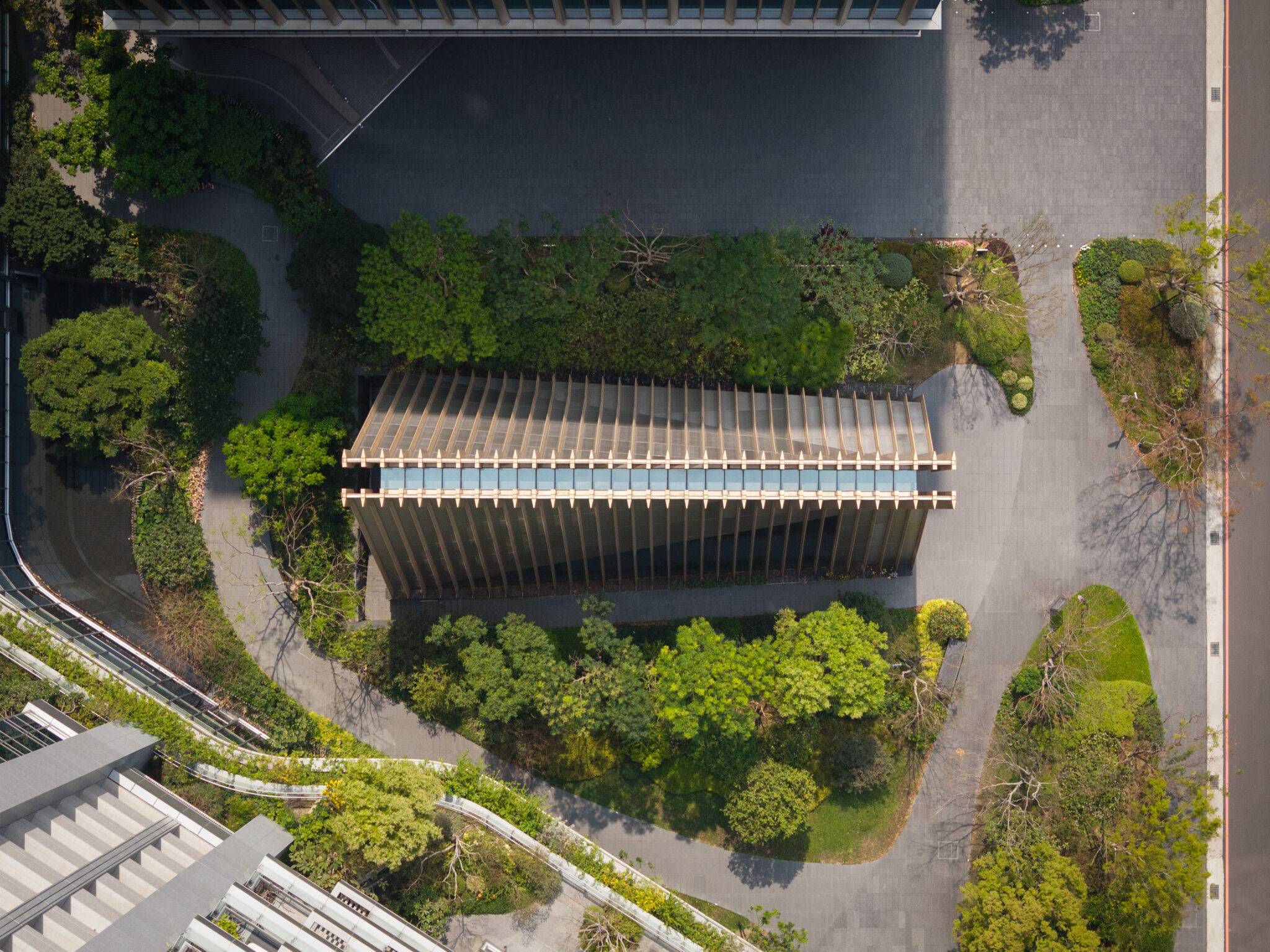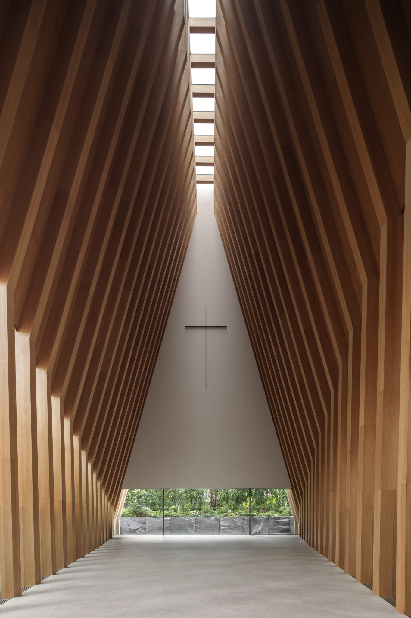 Natural wood textures on the exterior help the chapel harmonize with the surrounding greenery. Large windows positioned at eye level frame views of the landscape while preserving privacy within the dense cityscape.
