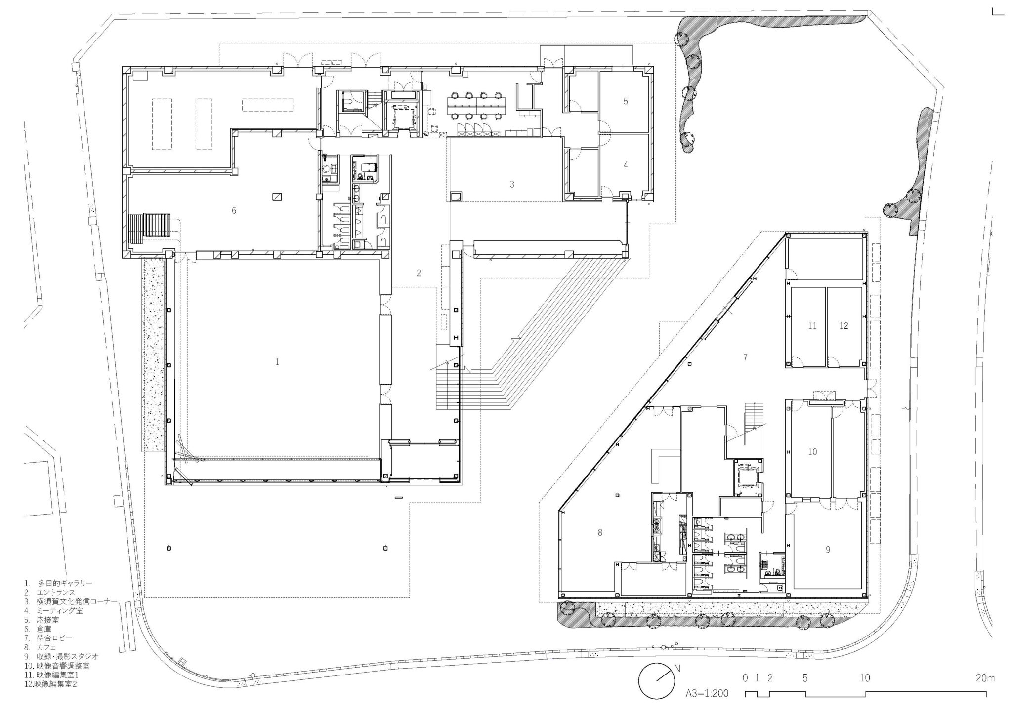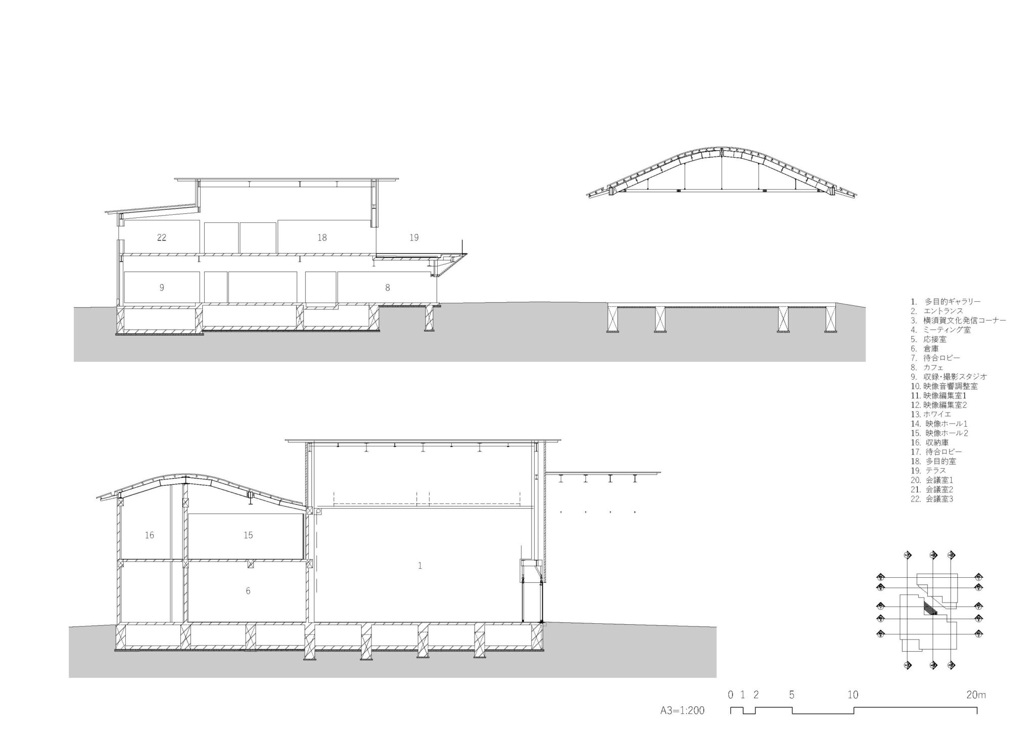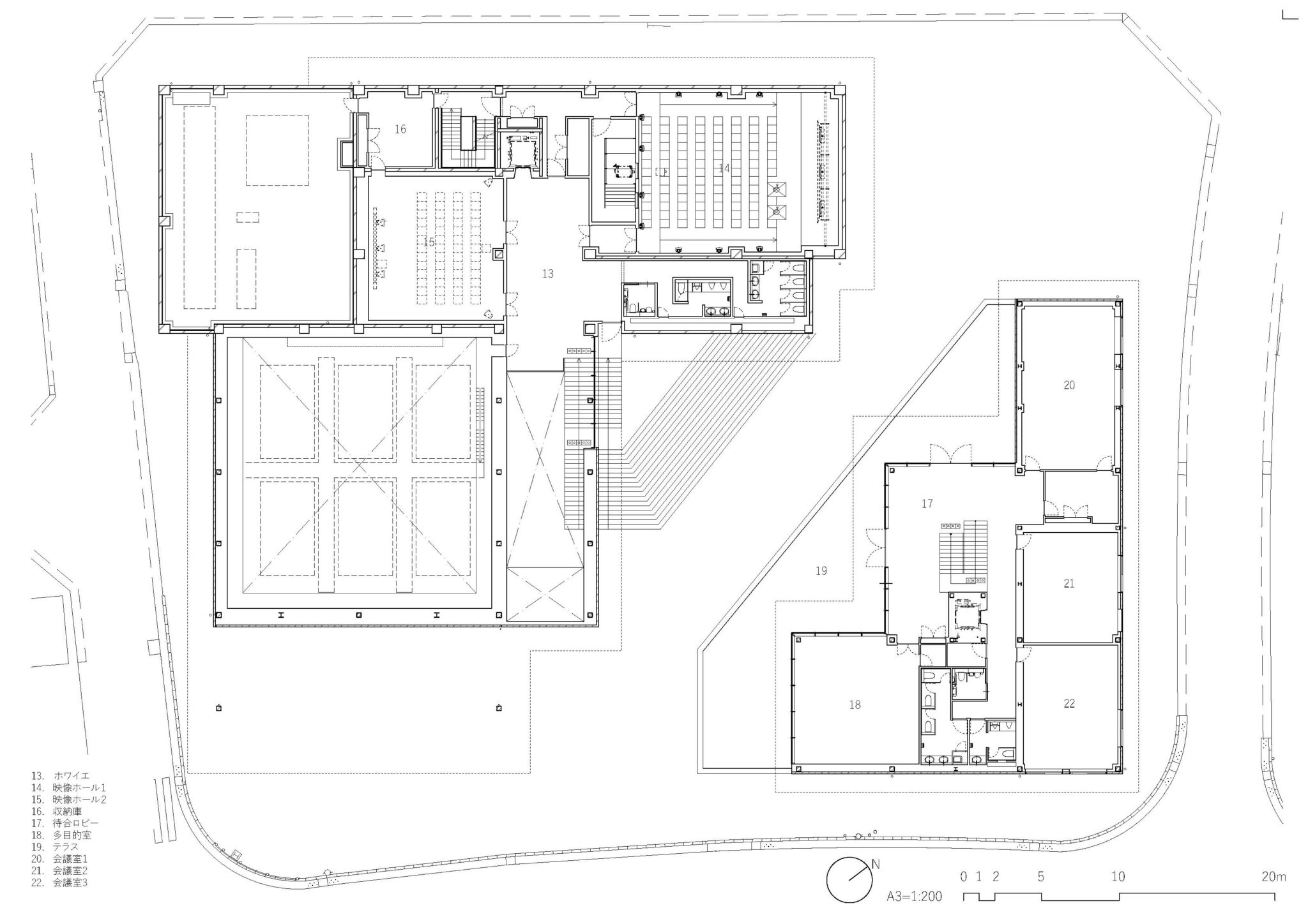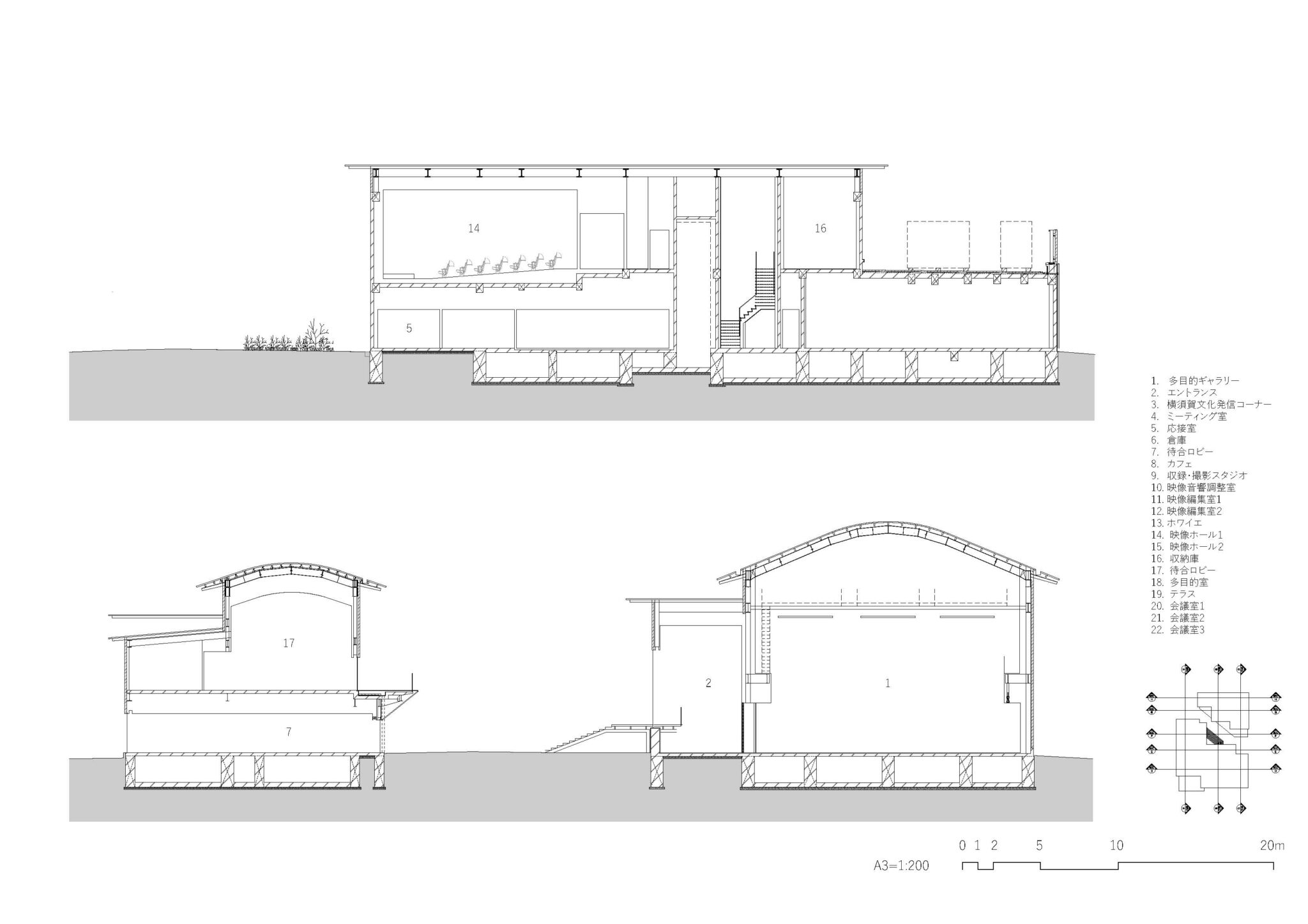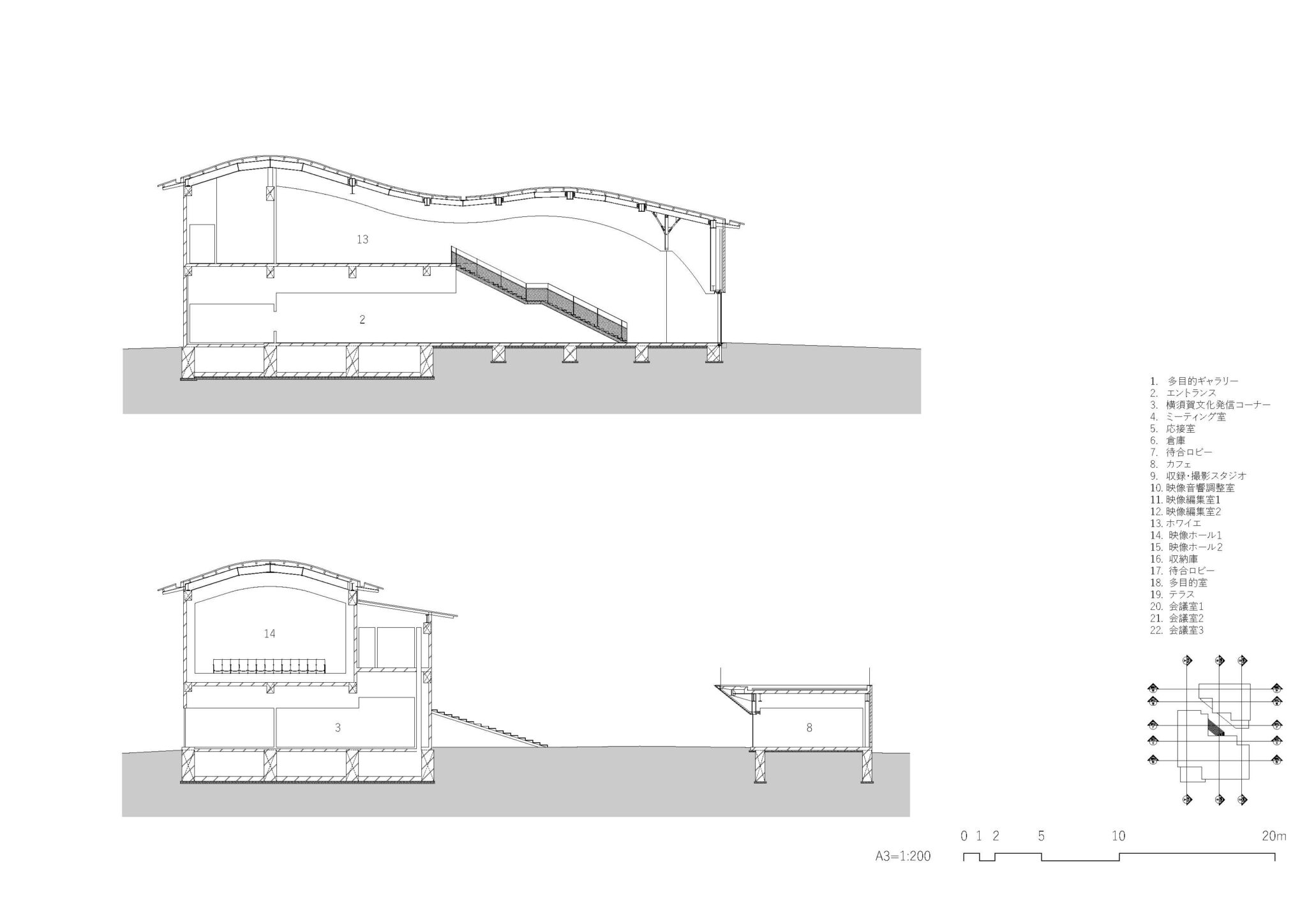 A pedestrian street, along which festival floats can pass on celebratory days, runs through the center of the site. Around this street, we arranged small volumes such as a theater hall, a recording and filming studio, a multipurpose gallery, and a café—creating a media and cultural exchange facility that is open to the community and resonates with its dynamism.