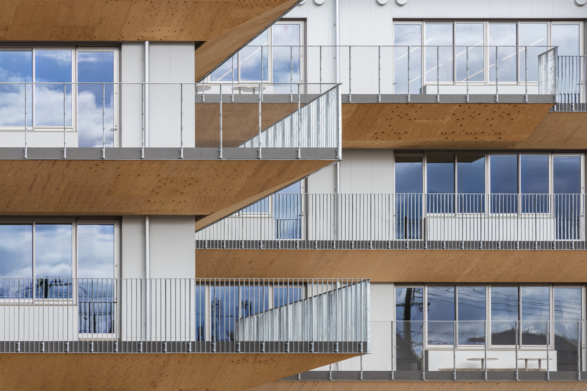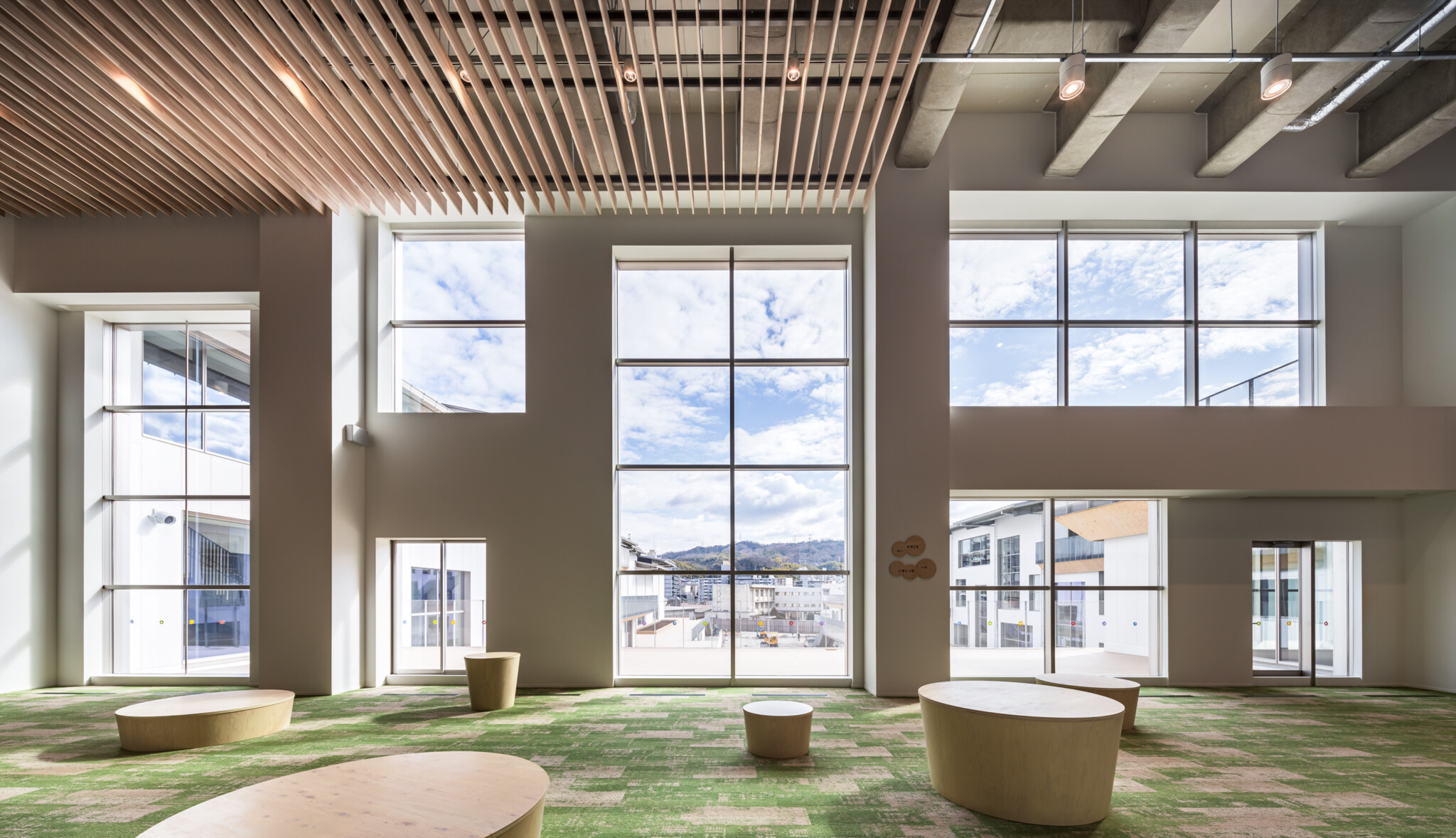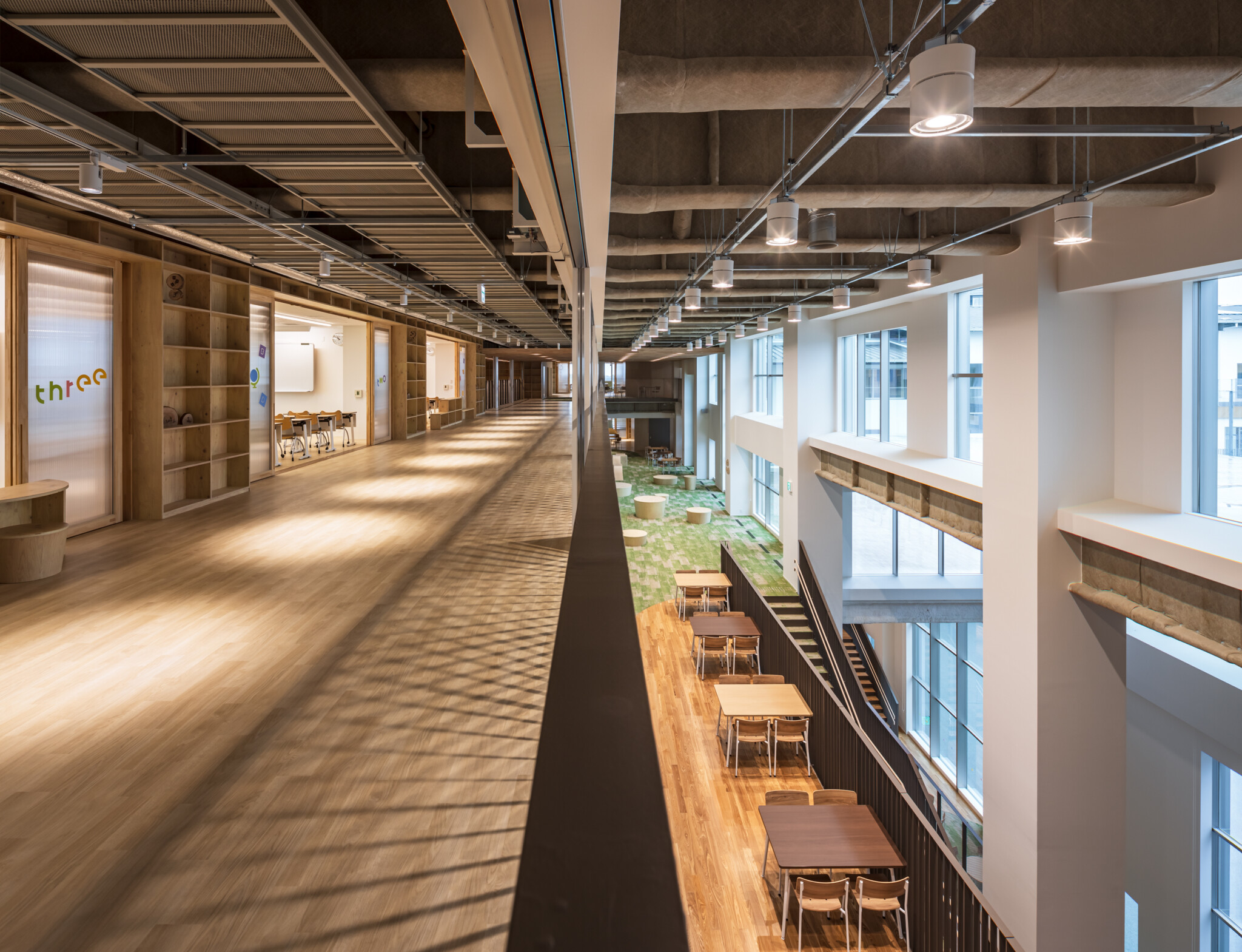 We designed a school in Neyagawa City, Osaka Prefecture, where people are connected in a warm environment. By dividing the roof of a large building into sections that match the surrounding streetscape, and including balconies of varying depths, we created a large continuous space that presents at the scale of a collection of small houses.