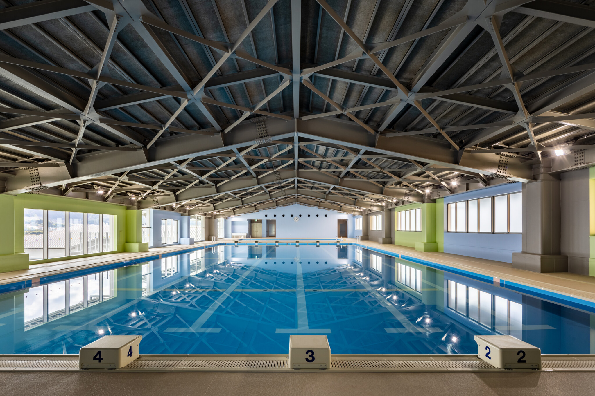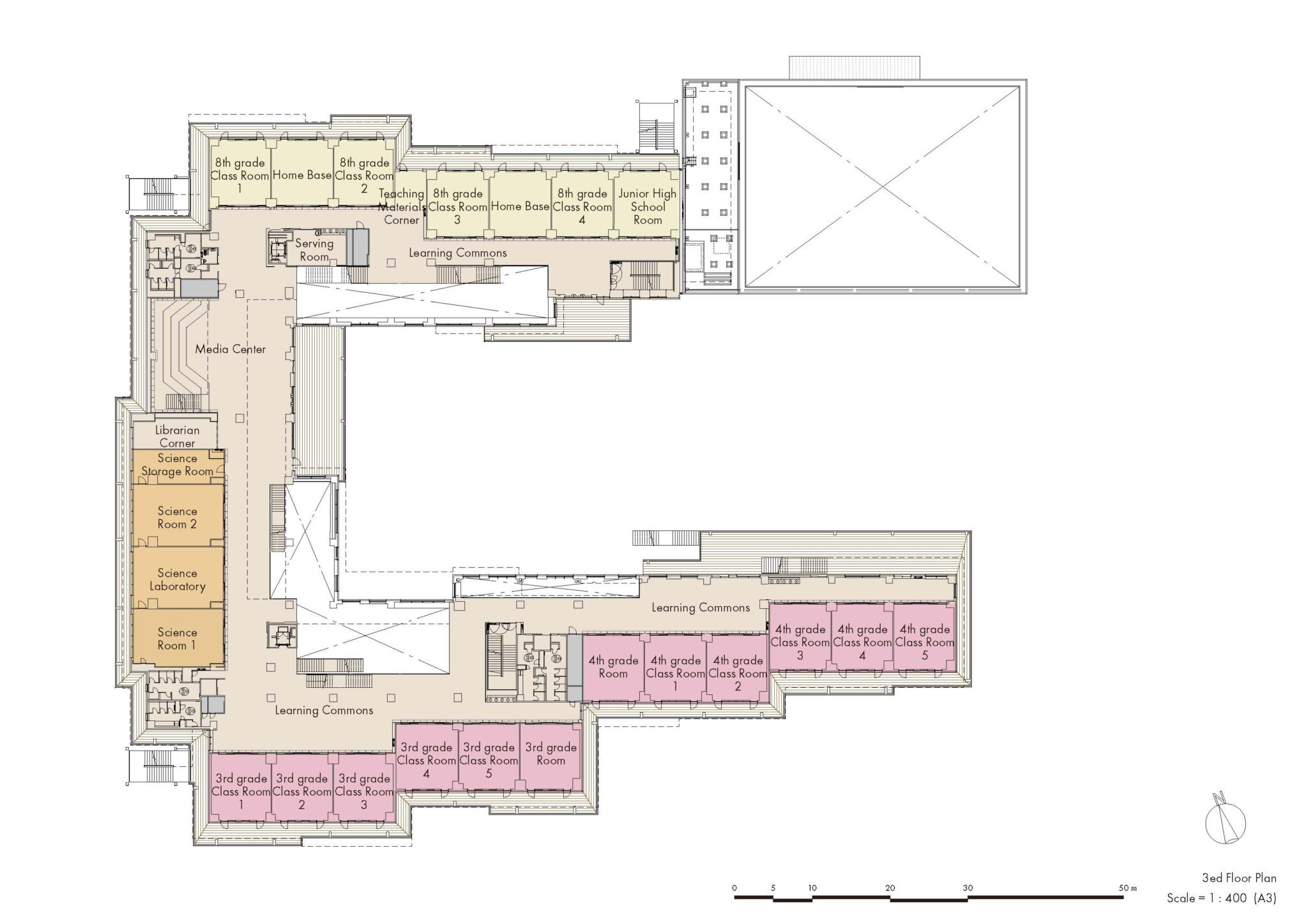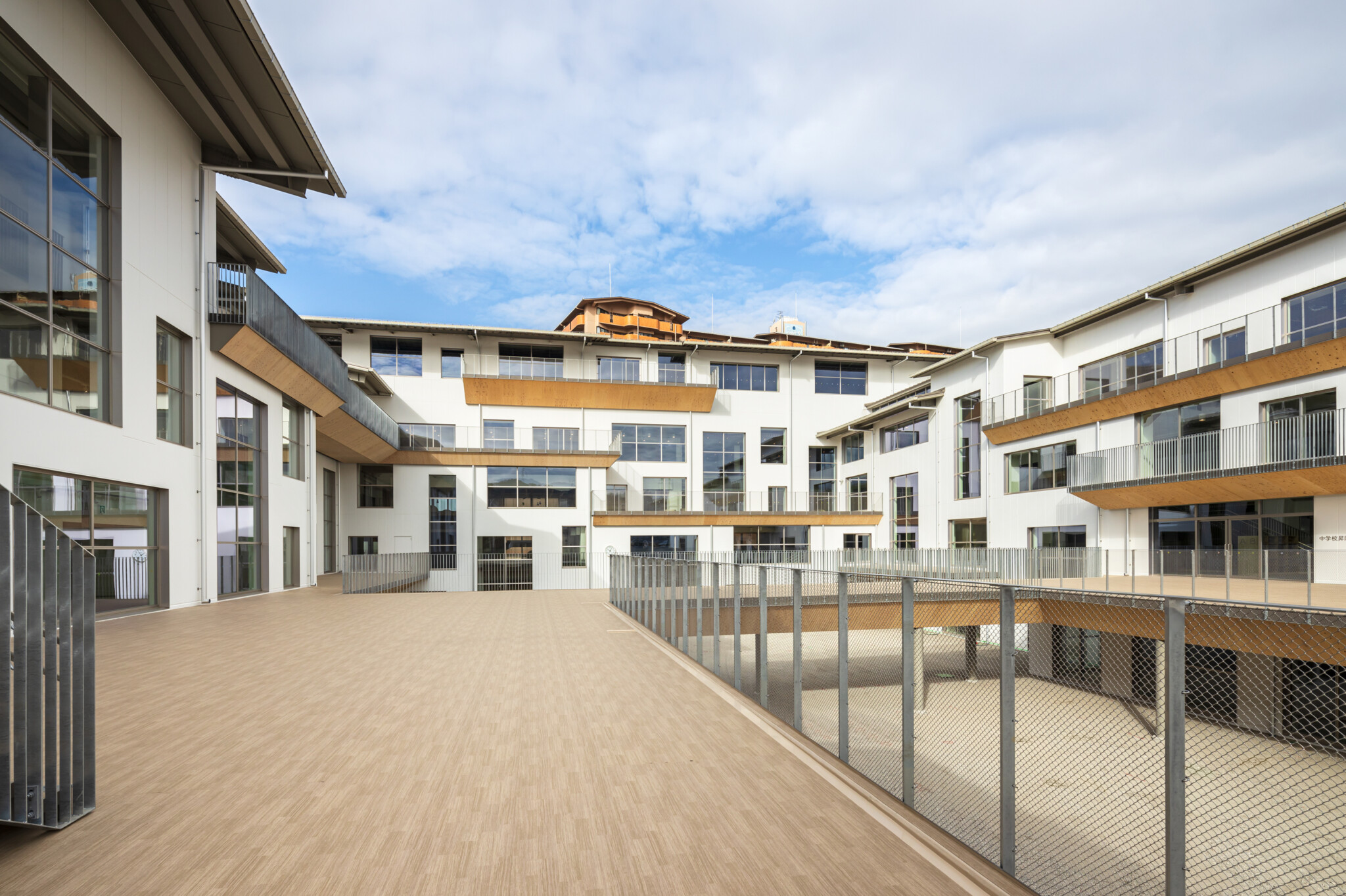 The school is a new symbol of the community. It houses two elementary schools and a junior high school. The elementary school and junior high school buildings face each other along the north-south axis. The west wing, which connects them, is a U-shaped layout for special classrooms. The building’s form creates an intimate courtyard which is open for the community to use.
