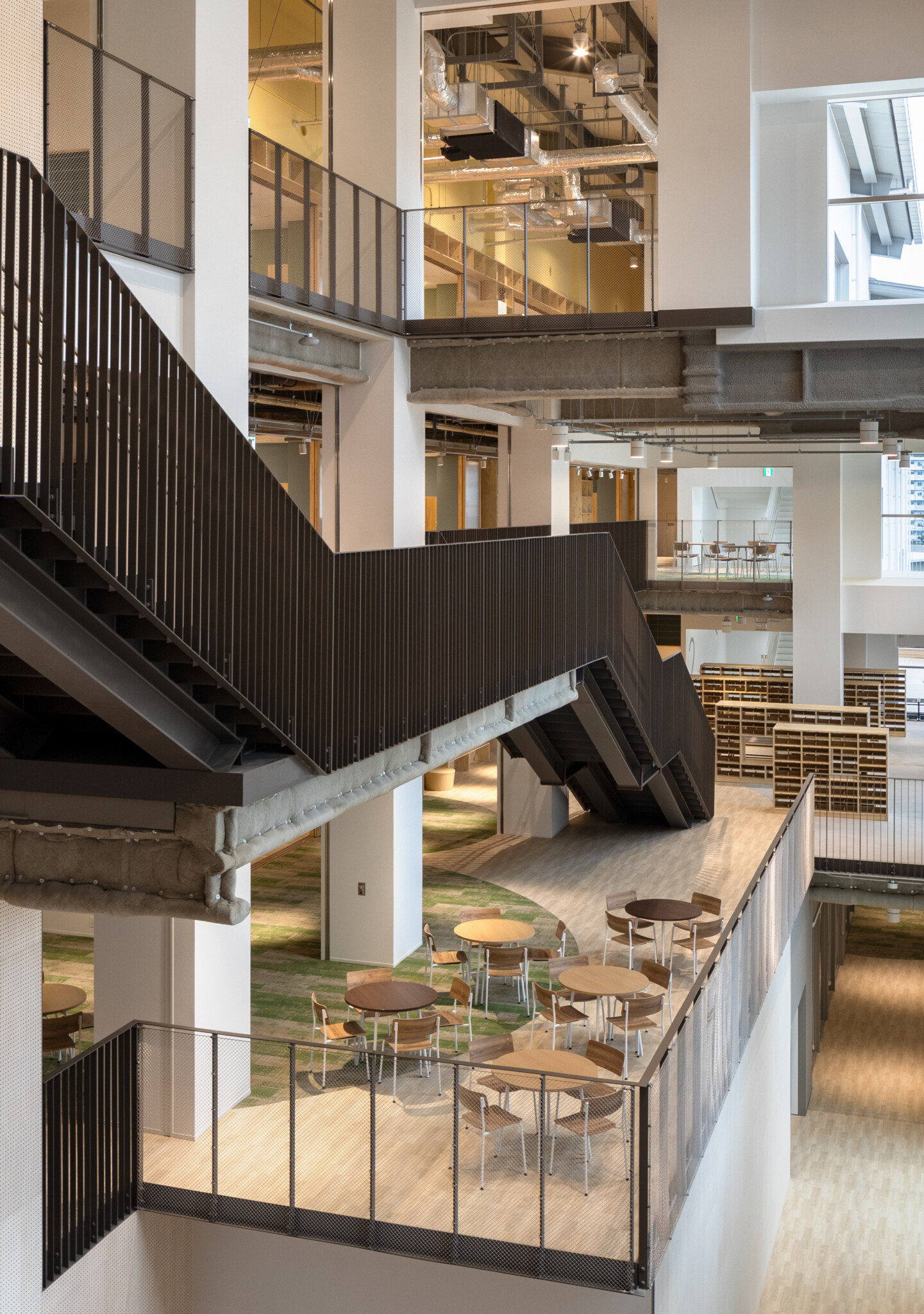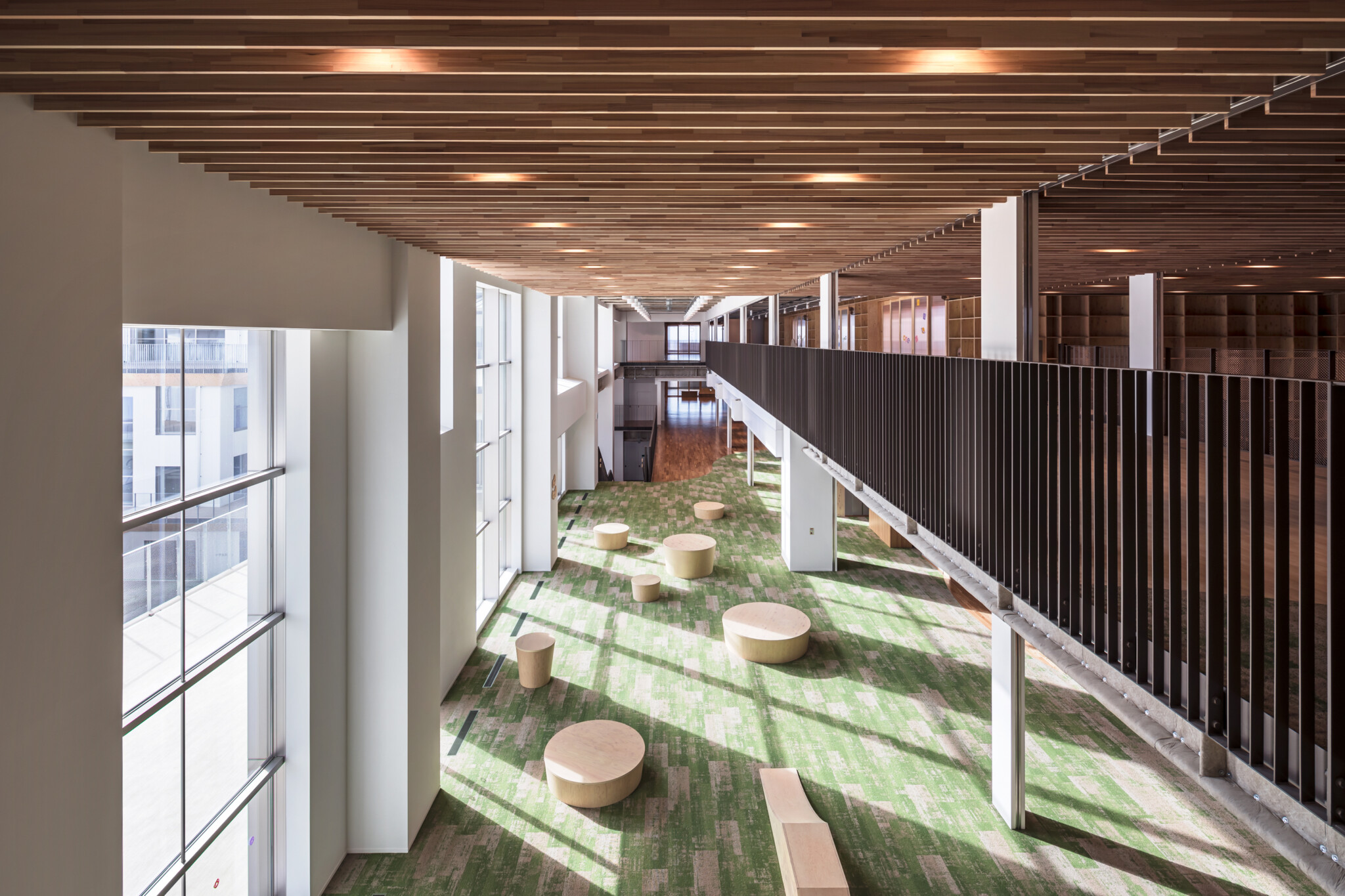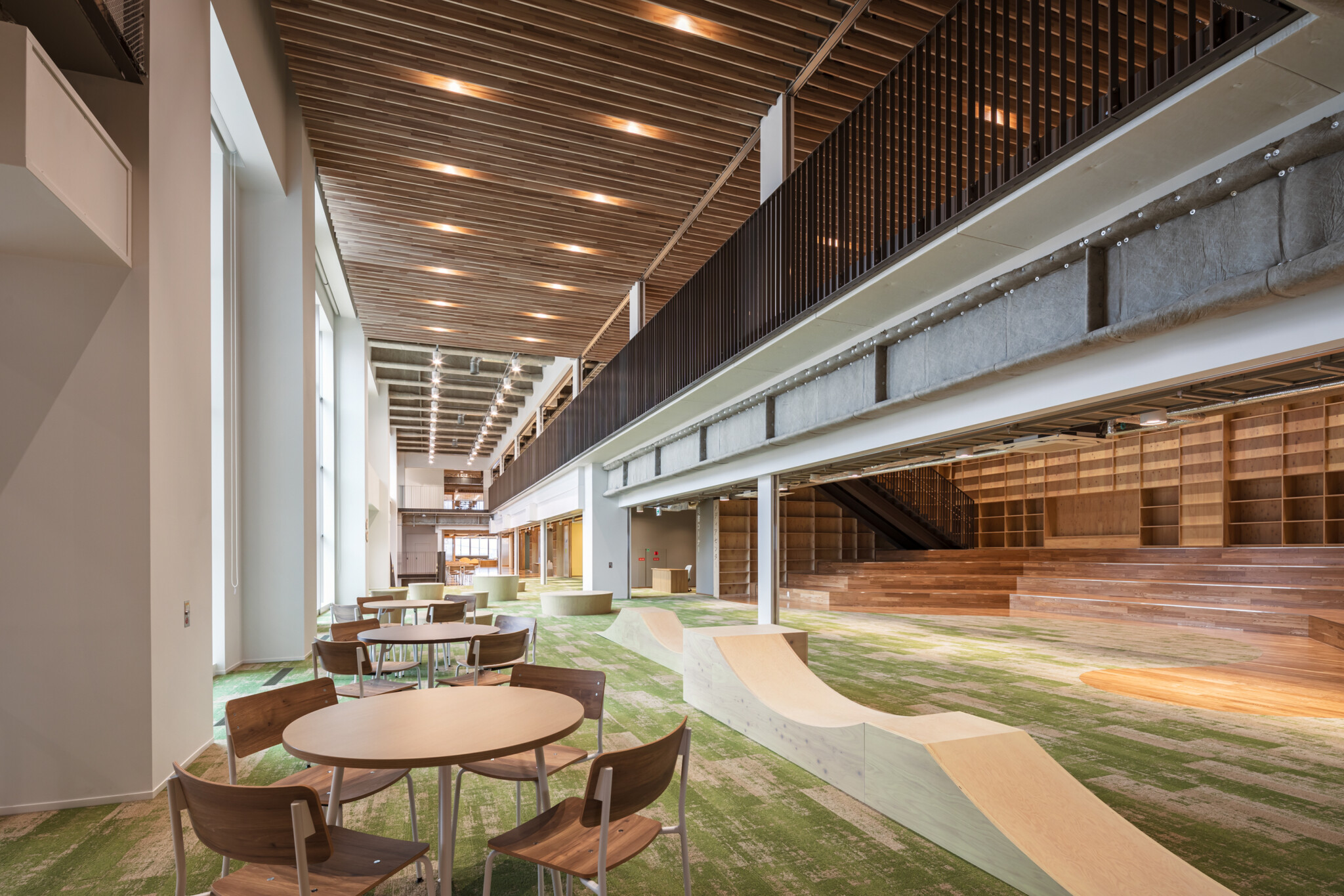 Randomly placed openings in the exterior wall surrounding the courtyard create a light-filled common space for children to gather. The use of curves in the transition between furniture and flooring materials creates a cozy place to stay. The learning commons facing the atrium is made up of overlapping slabs inspired by the surrounding hilly terrain. This stepping feature creates visual connections and soft divisions that intersect to enhance the cohesion of each grade level while fostering a sense of unity that transcends grade levels.