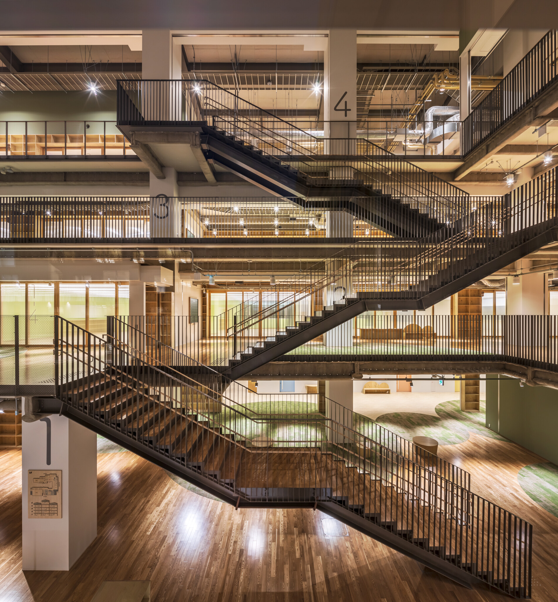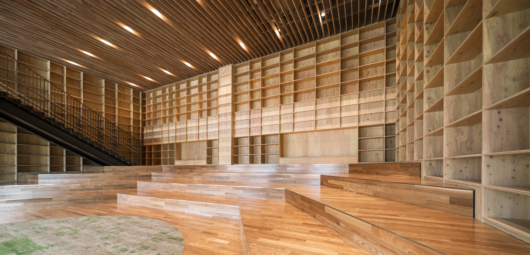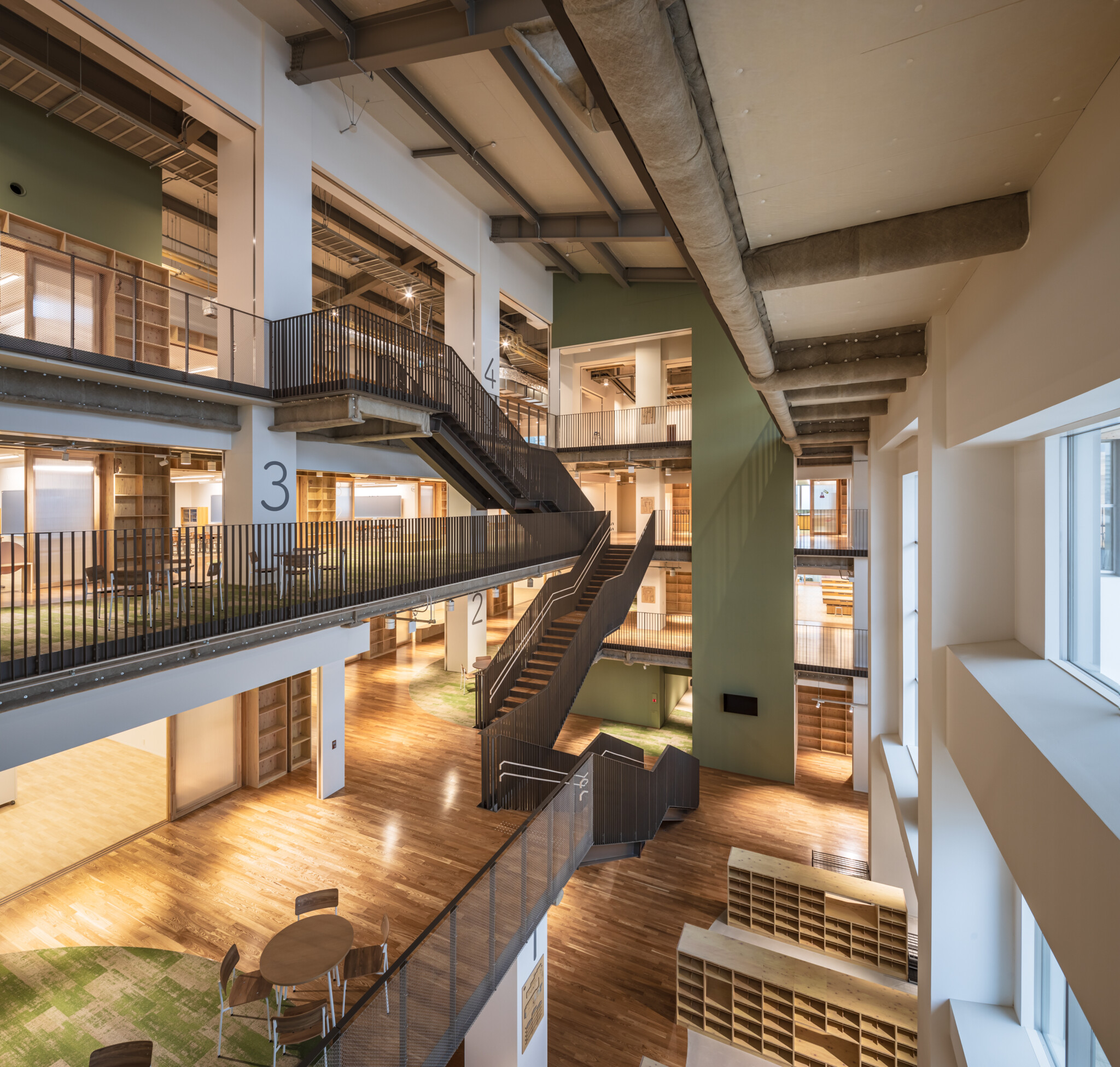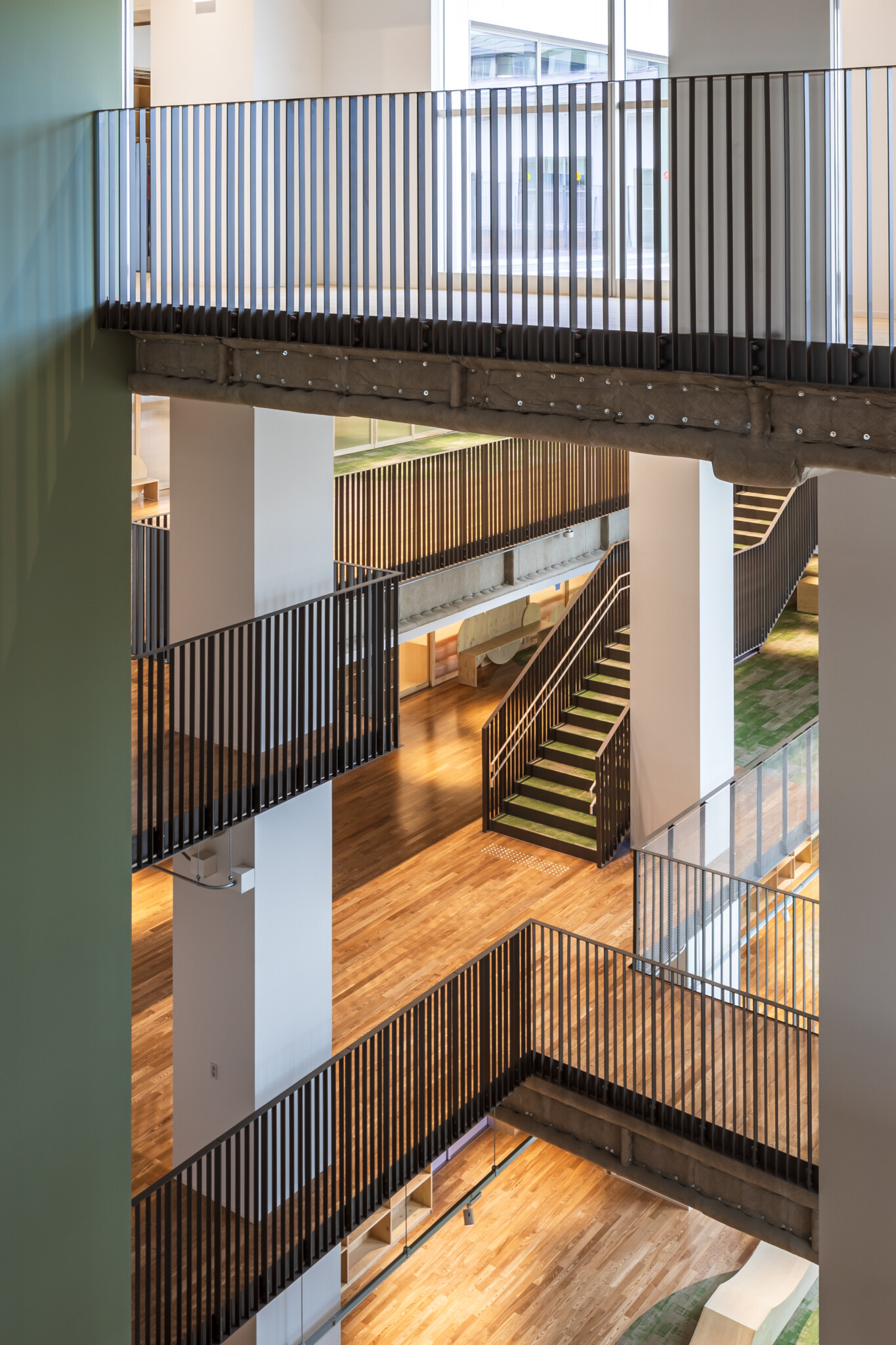 Randomly placed openings in the exterior wall surrounding the courtyard create a light-filled common space for children to gather. The use of curves in the transition between furniture and flooring materials creates a cozy place to stay. The learning commons facing the atrium is made up of overlapping slabs inspired by the surrounding hilly terrain. This stepping feature creates visual connections and soft divisions that intersect to enhance the cohesion of each grade level while fostering a sense of unity that transcends grade levels.
