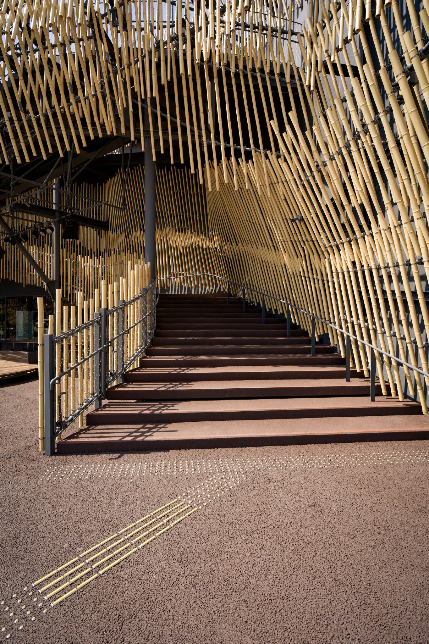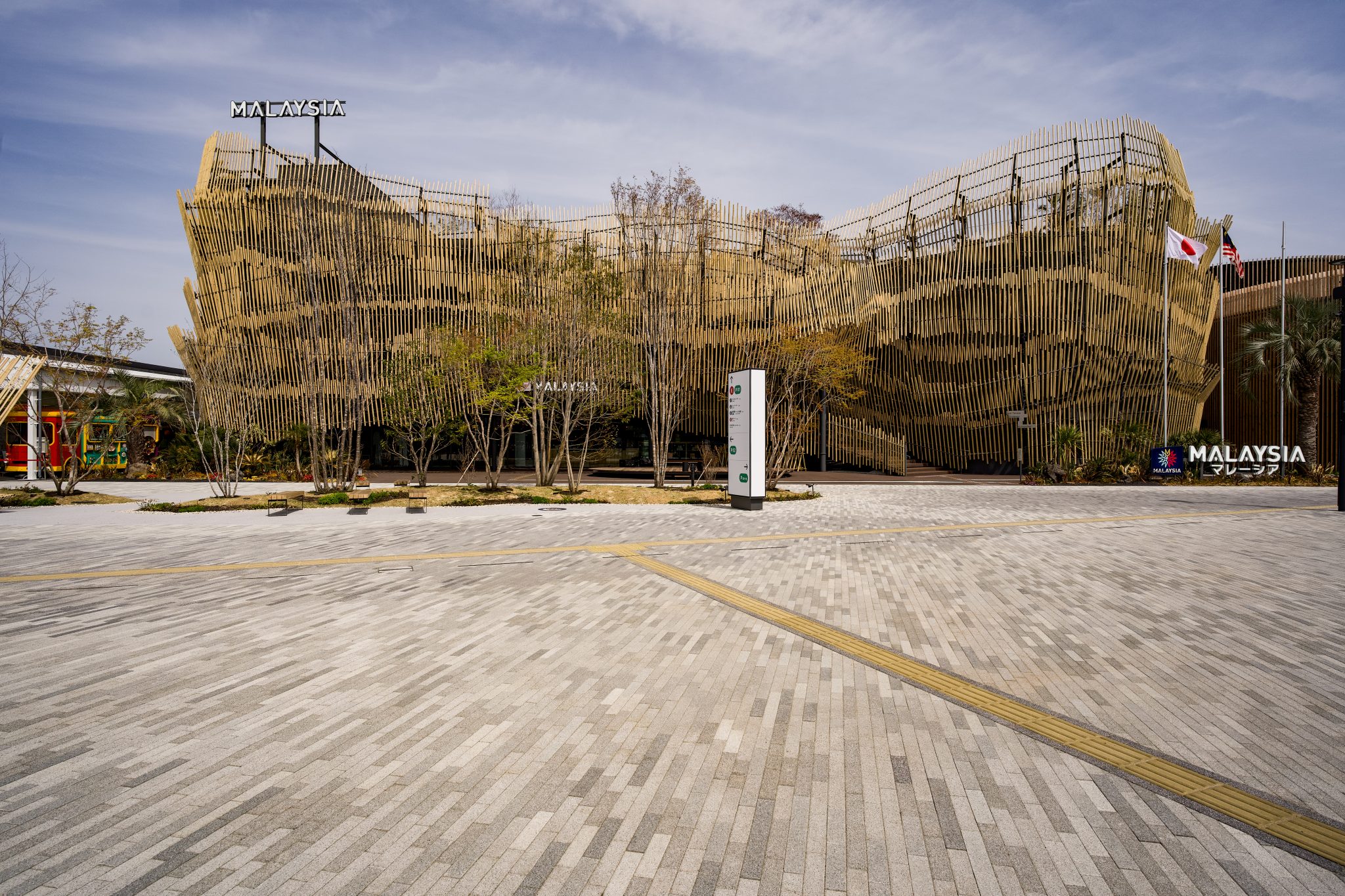 Inspired by the traditional Malaysian textile “songket”, we’ve woven nearly 5,000 bamboo sticks together using computer-aided design. The bamboo facade of the songket creates a soft, fabric-like appearance that lets in natural light, representing the open, bright and powerful light of Malaysia. We wanted to bring this special light of Malaysia to the hills of Osaka. In the interior, we used the Selangan Batu wood from Malaysia for the floor and chose the color “tanamera” for the wall, which evokes the red soil to reproduce the image of Malaysia.