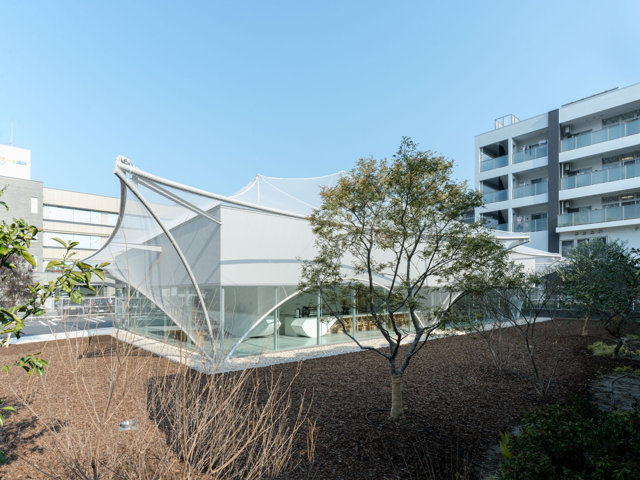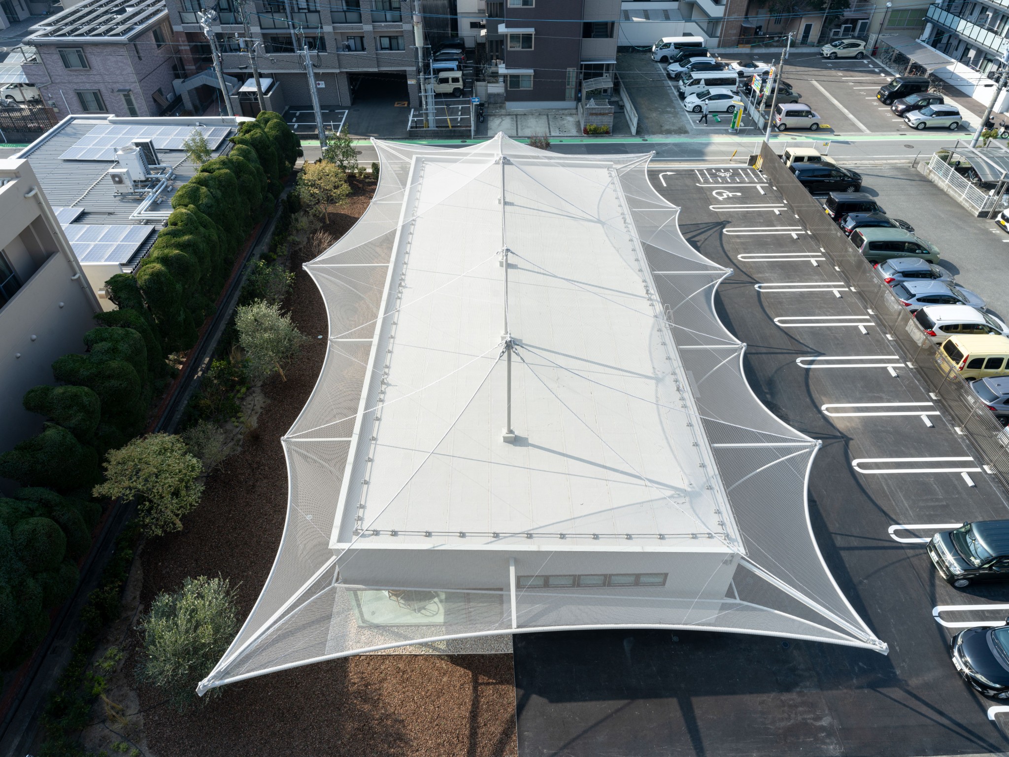 The interlocking of the arched steel frame supporting the mesh and the grid-like steel frame supporting the inner rectangular boxes ensures sufficient earthquake resistance in spite of the thin members. In this sense it can be called a modern version of a flying buttress with interlocking outer and inner frames. The mesh wrapping also saves energy by cutting the sun’s rays.