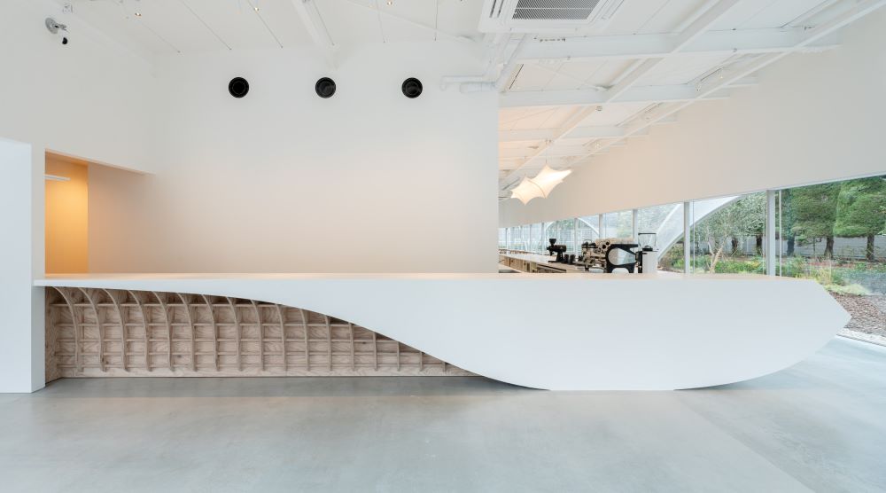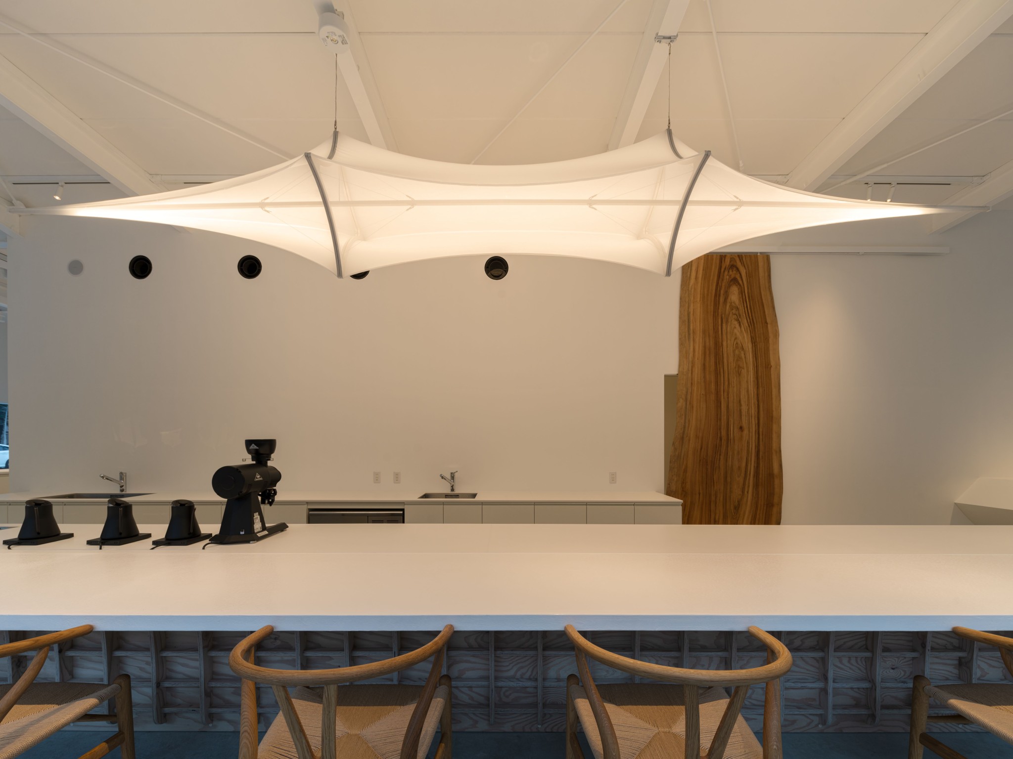 Inside, savoir-faire floats in a white cube, including a counter polished by plastering and translucent light fixtures made of telescopic fabric.