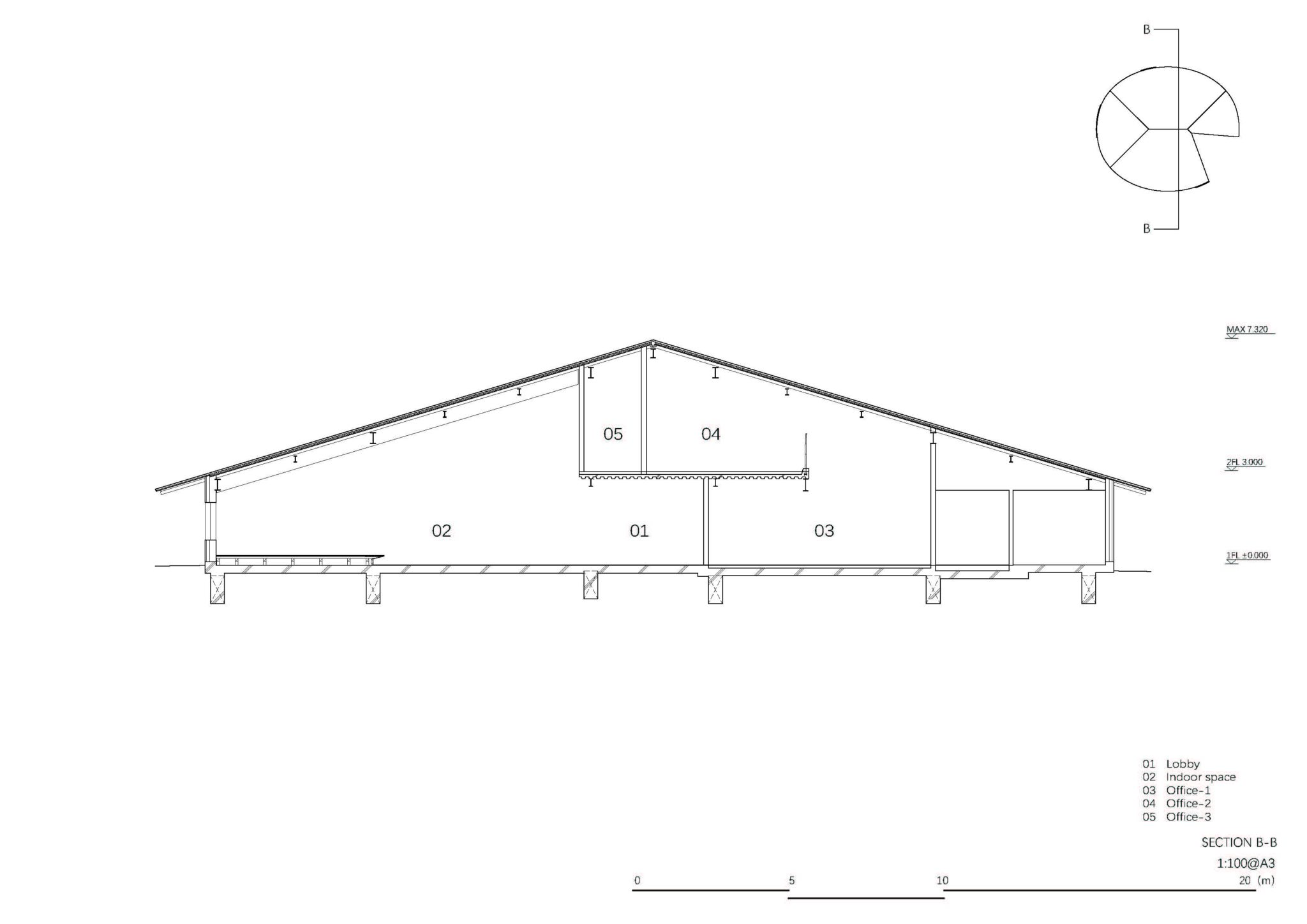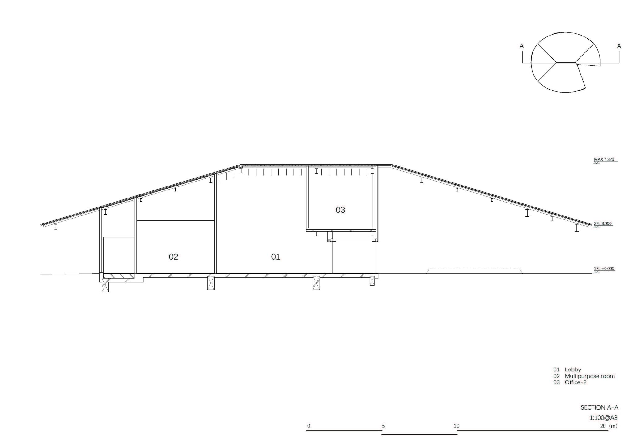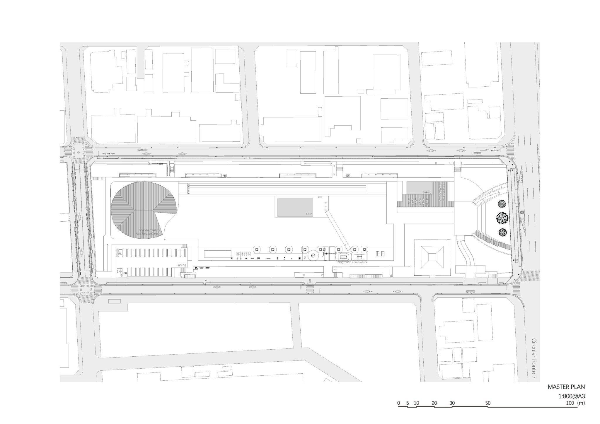 By making the outer perimeter of the simple hipped roof circular, a change in height was created at the edge of the roof, creating an architectural expression appropriate for an active place.