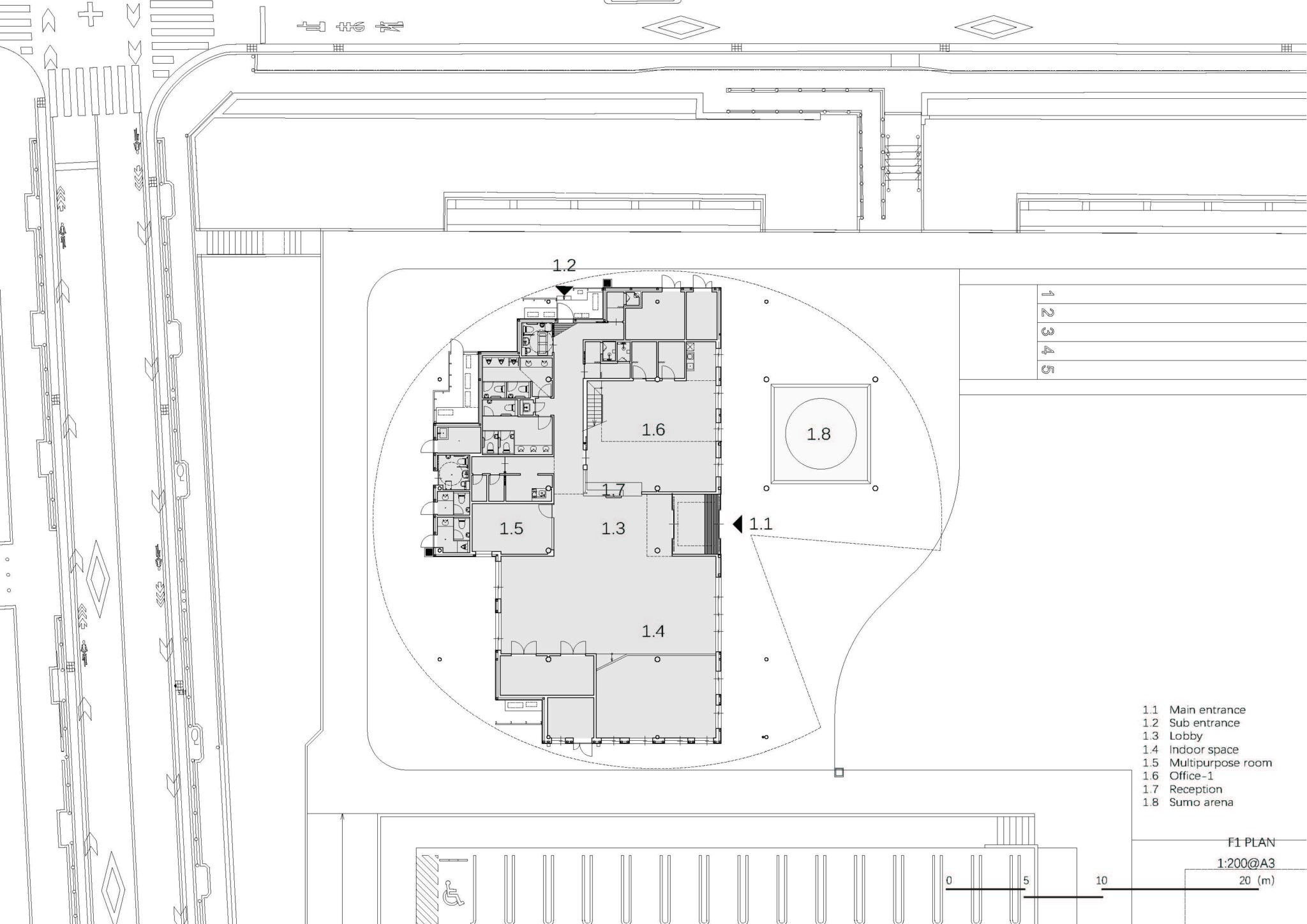 A large cutout in the circular hipped roof opens the architecture to the park environment, creating continuity between the interior and exterior. Half of the roof was made semi-outdoor with deep eaves, and a sumo wrestling arena was developed on part of it.