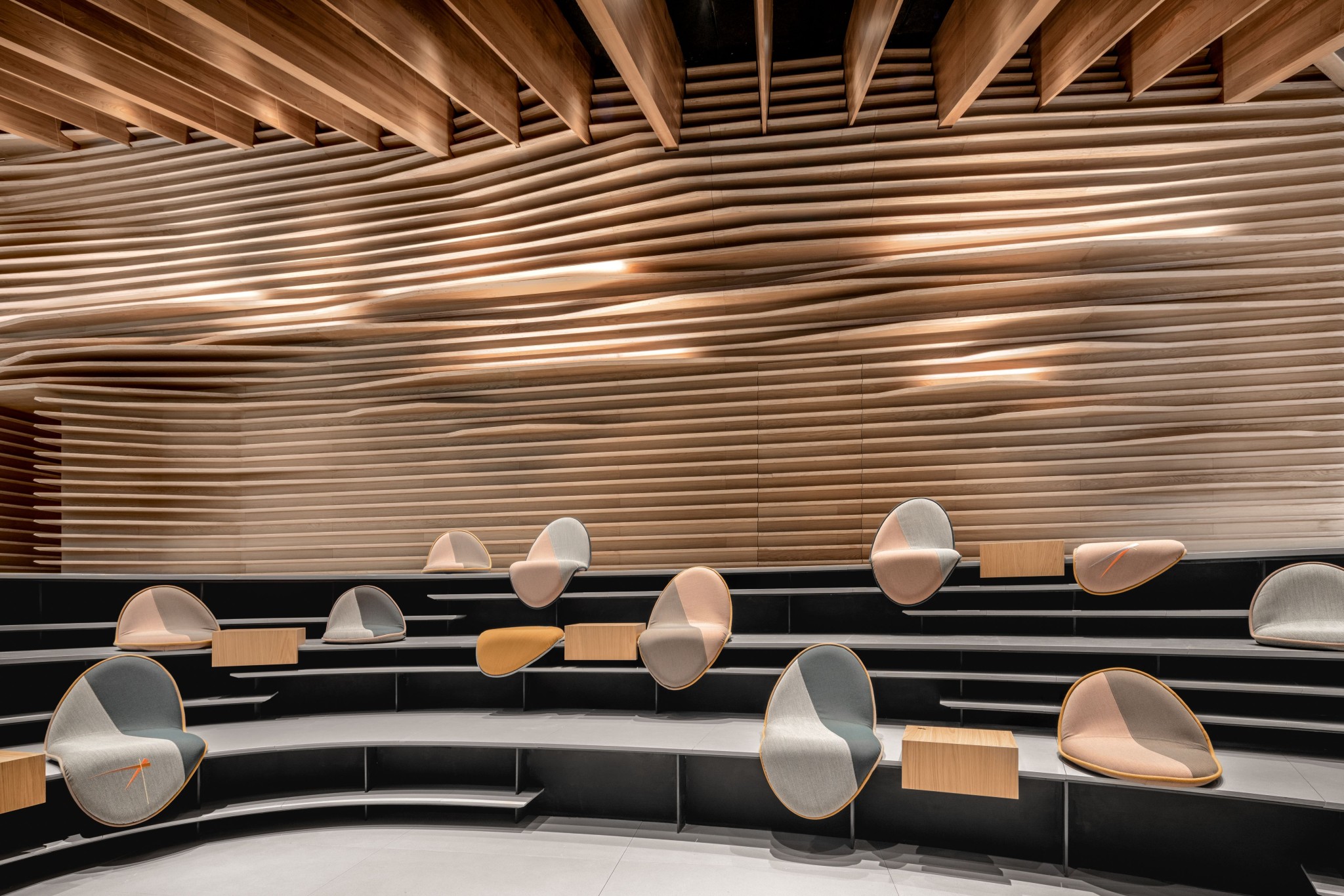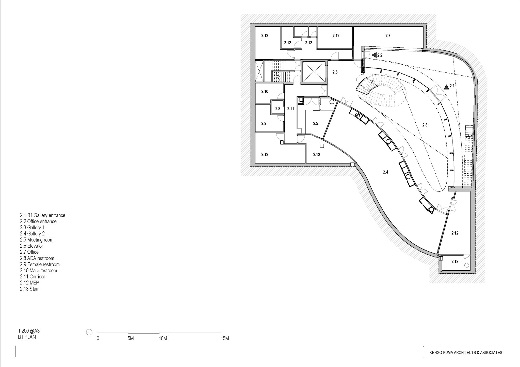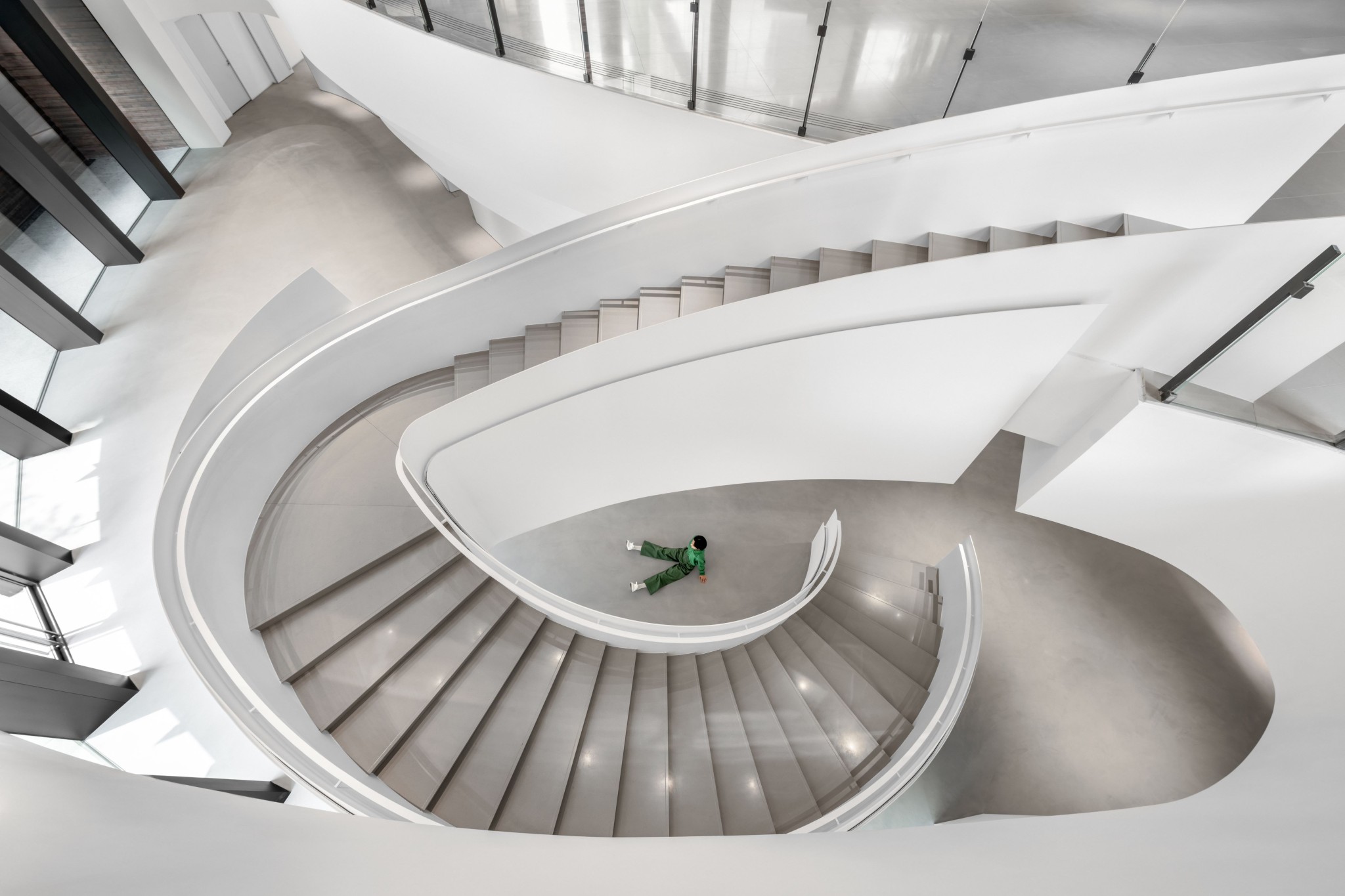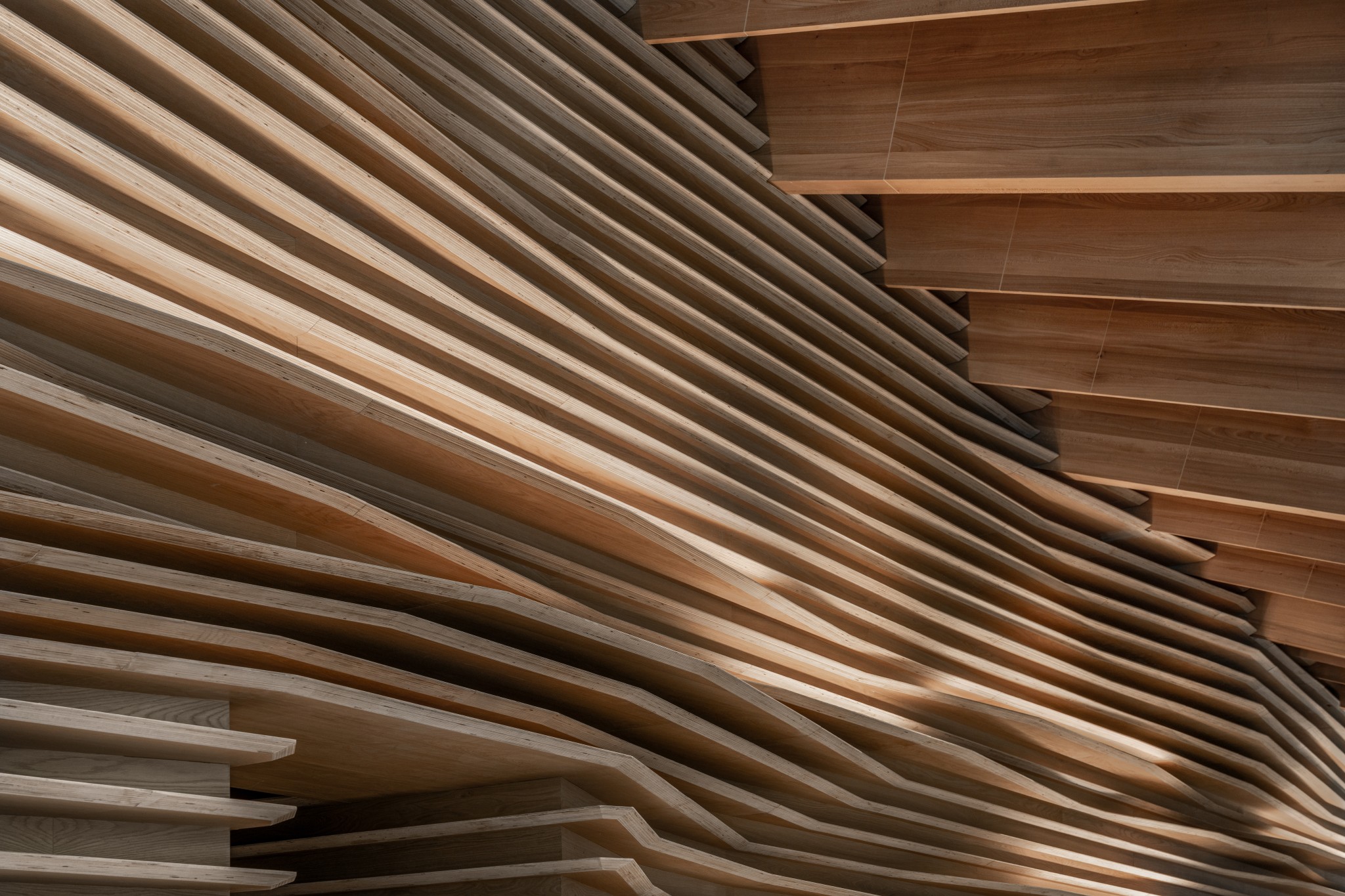 Connecting the underground exhibition space with the ground level, we created a shadowy cave-like space with a louvered ceiling that reflects the twisted shape of the roof, pleated walls, and a spiral staircase. By creating an organic exhibition space that differs from an abstract white cube, we attempted to immerse nature into the city, both in terms of scenery and experience.