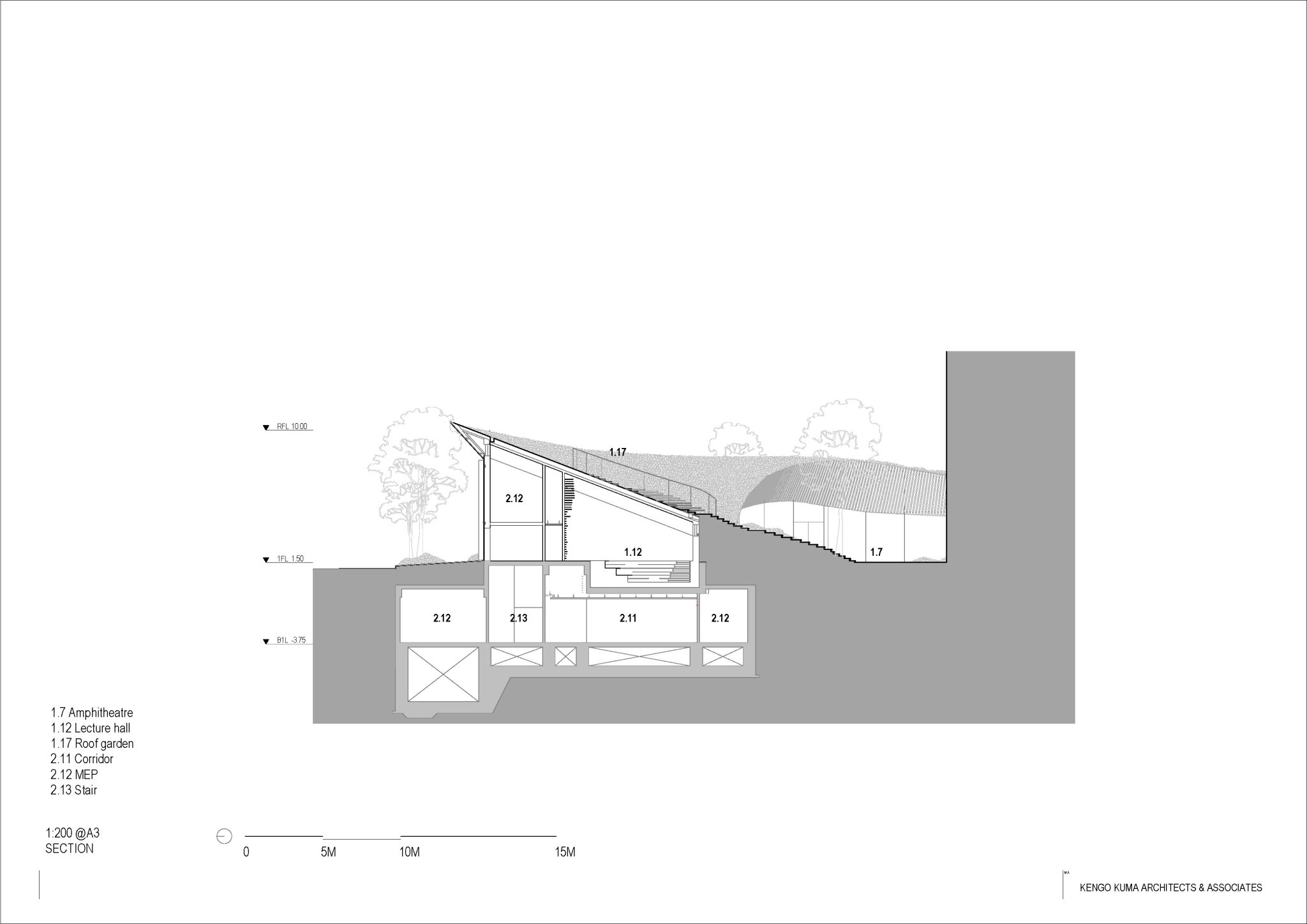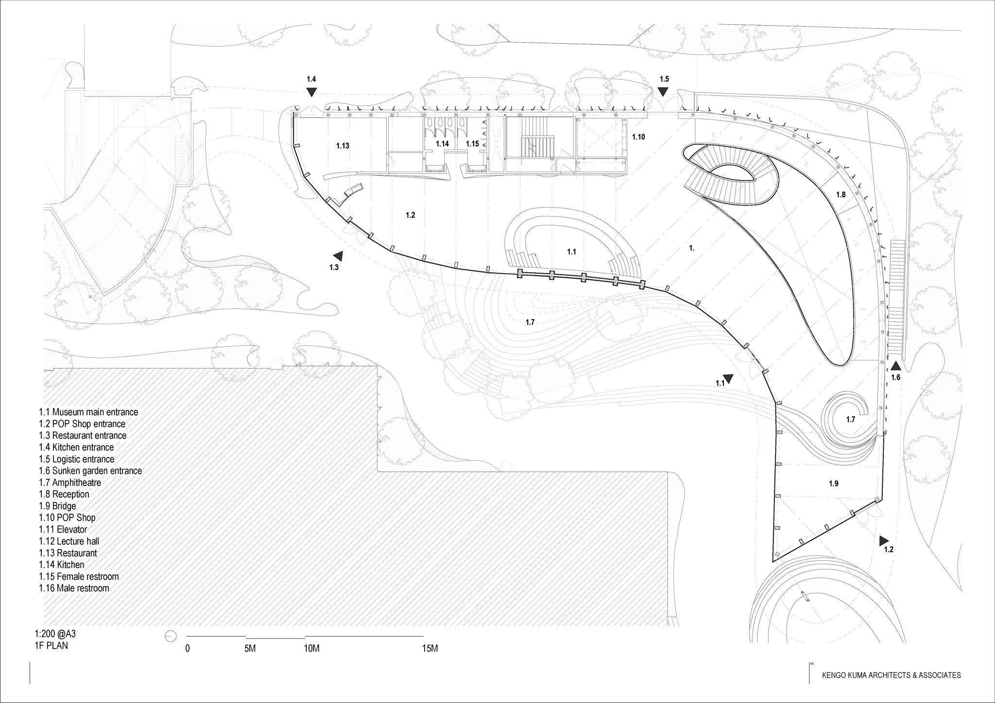 Most of the museum was buried underground to keep the eaves low and reduce the oppressive feeling of the building. Furthermore, by integrating the roof with the ground, the roof space was opened to the city as a public space for various events and concerts.