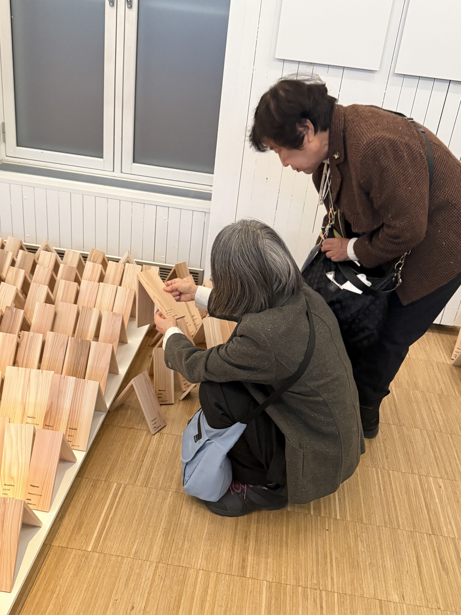 Each KIGUMI is assigned a unique ID, and when it is placed on a bench by the wall, testimonials based on each ID can be accessed.