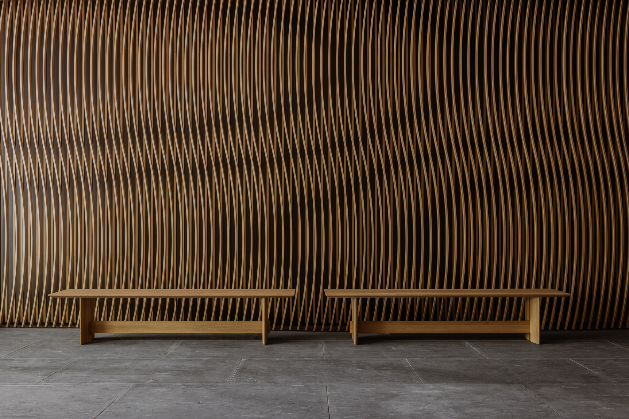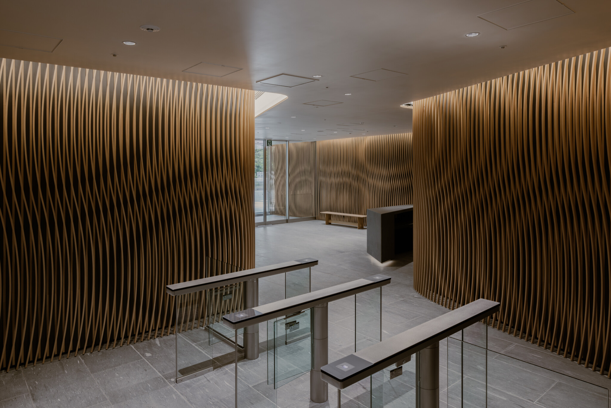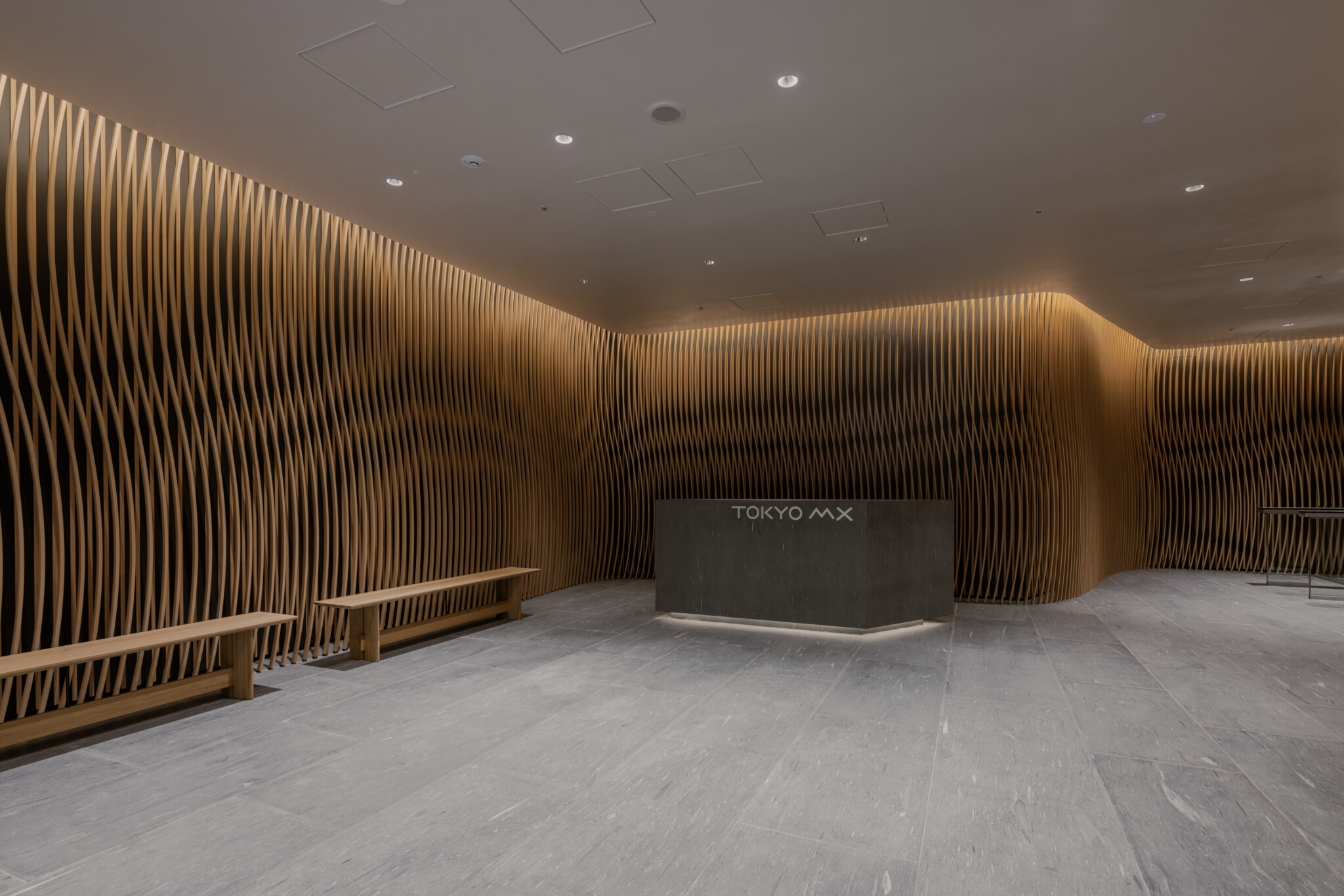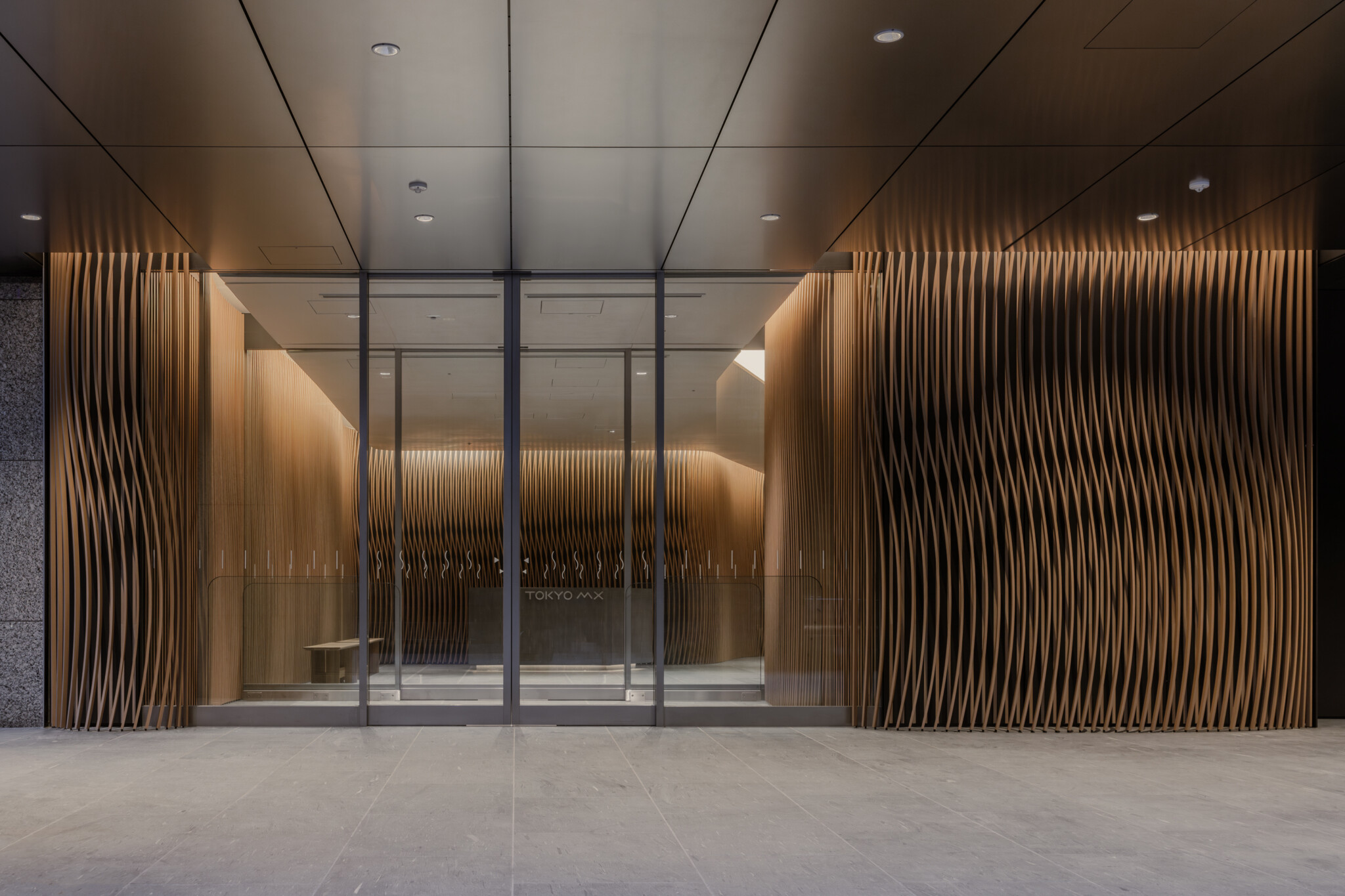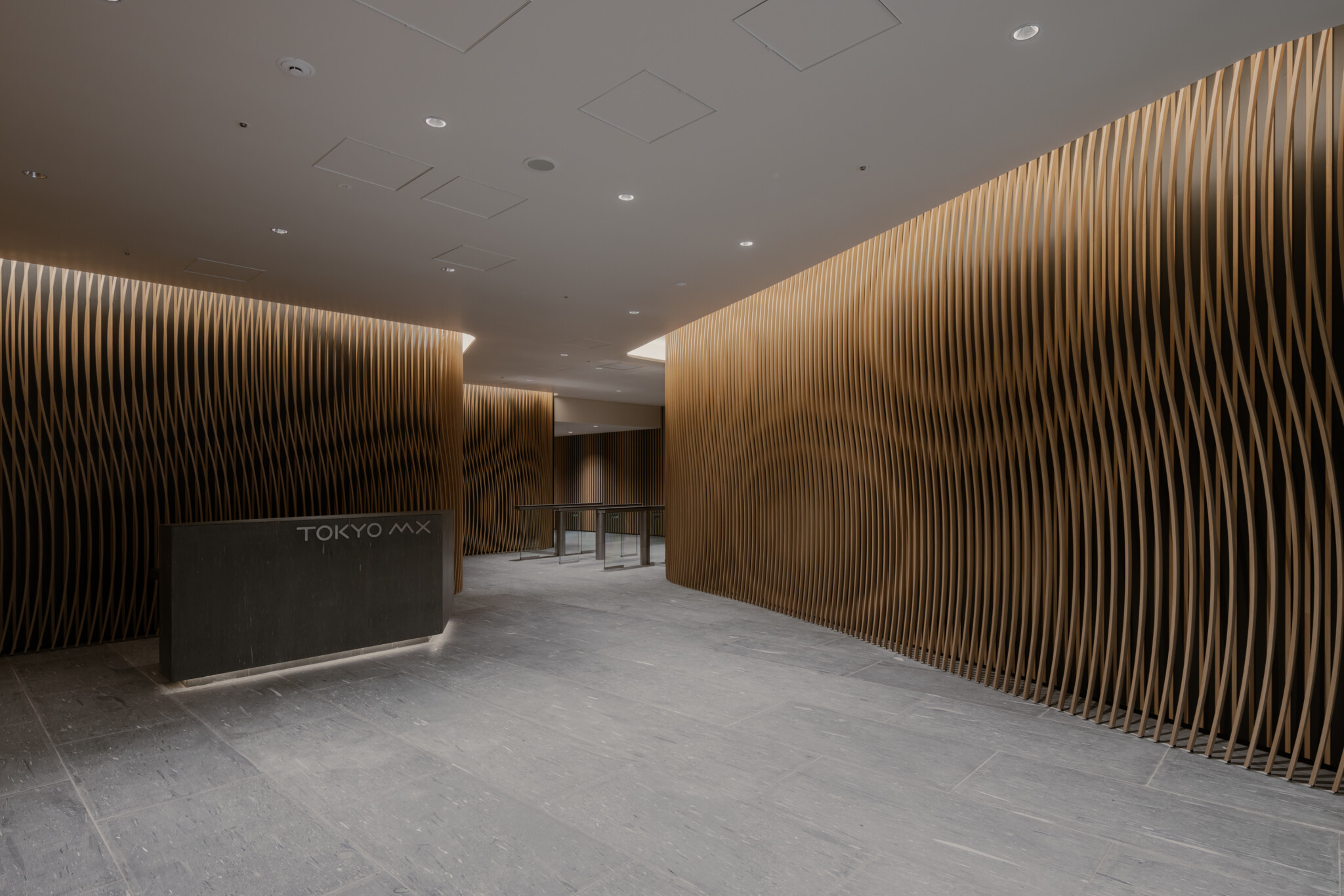 The headquarters of Tokyo MX Television, standing in front of the greenery of the Imperial Palace, was redesigned as a tunnel space of “green moiré.” I envisioned the broadcasting station as a tunnel that connects the ordinary world with another, alternate realm. The inner surface of the tunnel is composed of a two-layer system: floating S-shaped louvers and vertical louvers behind them. As one progresses deeper into the tunnel, these two layers interfere with each other to generate moiré patterns, evoking the sensation of moving through a forest cave or traveling through the inner core of tree trunks. Using the vocabulary of louvers, I aimed to create a dynamic, organic, and ecological experience.