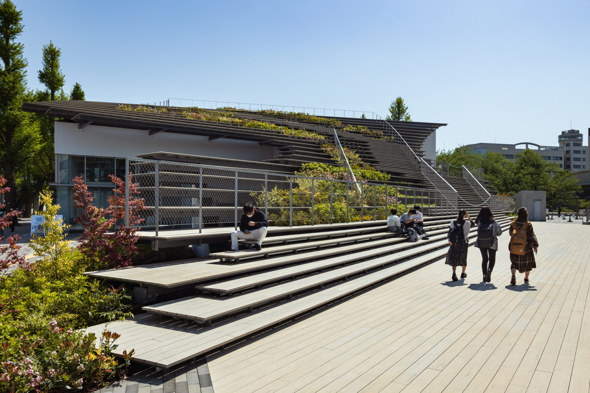 Located at the entrance of the Tokyo Institute of Technology (current Institute of Science Tokyo) Ookayama Campus, we designed a “platform” to house student activity. To maintain a clear vista of the clocktower, a prominent landmark for the campus, most of the building sits underground. Above ground, the building takes on a lush mound-like form, seamlessly integrating with the surrounding landscape. The “roof” which is composed of stepped greenery and bleachers, resonates with the green slanted wall of the adjacent library, collectively creating a green valley. The green valley serves as a new green space to invite life and activity for the students.