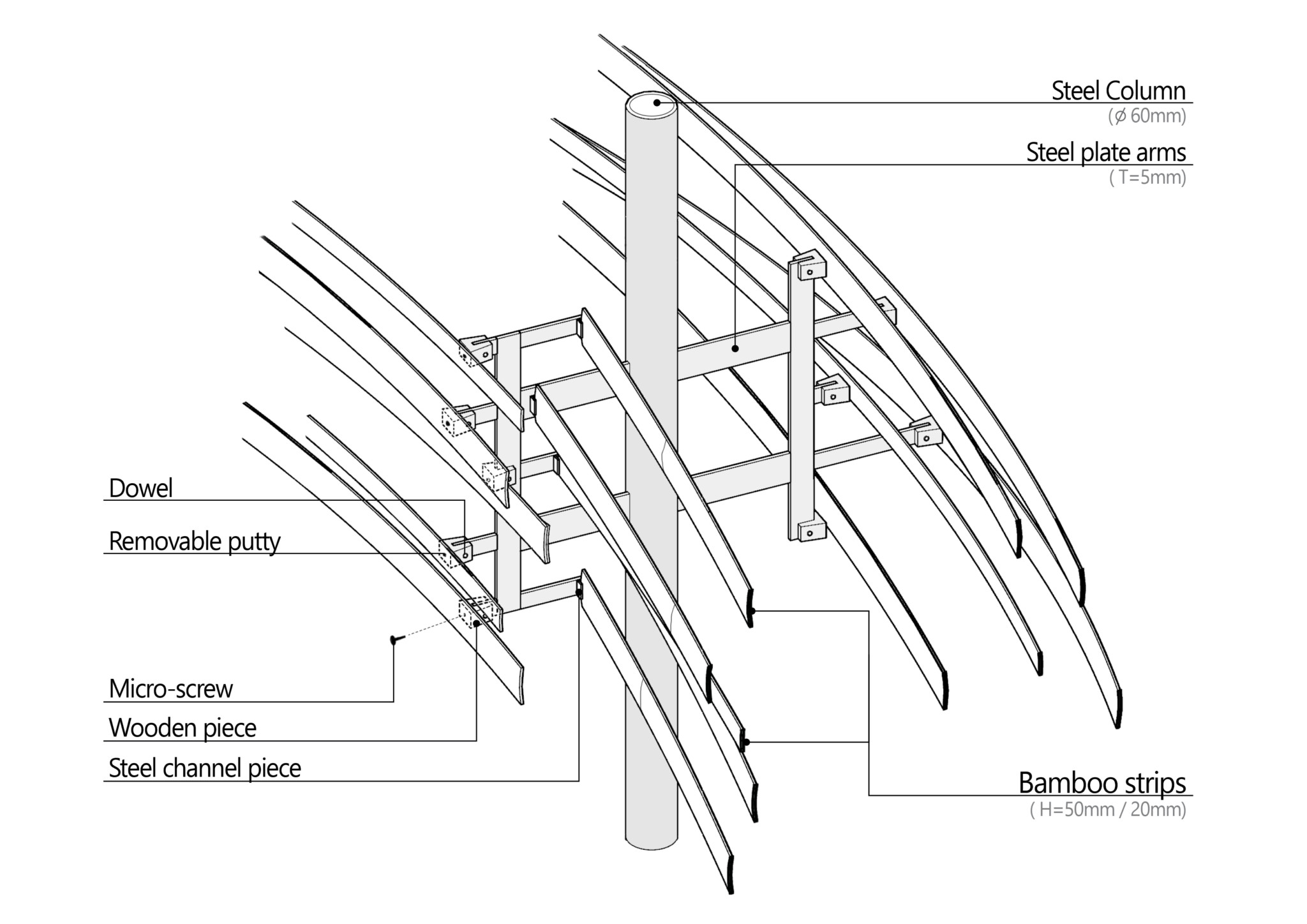 The tea room comprises three-dimensional screens made of 5 cm and 2 cm wide bamboo strips with different curvatures, set along a spiral form. The bamboo strips are fixed to small wooden pieces which are attached to the end of fork-shaped steel plates consisting of arms with different lengths. With all the bamboo curvatures installed along the structure, a teahouse with organic randomness of bamboo silhouette was installed in the quiet space.