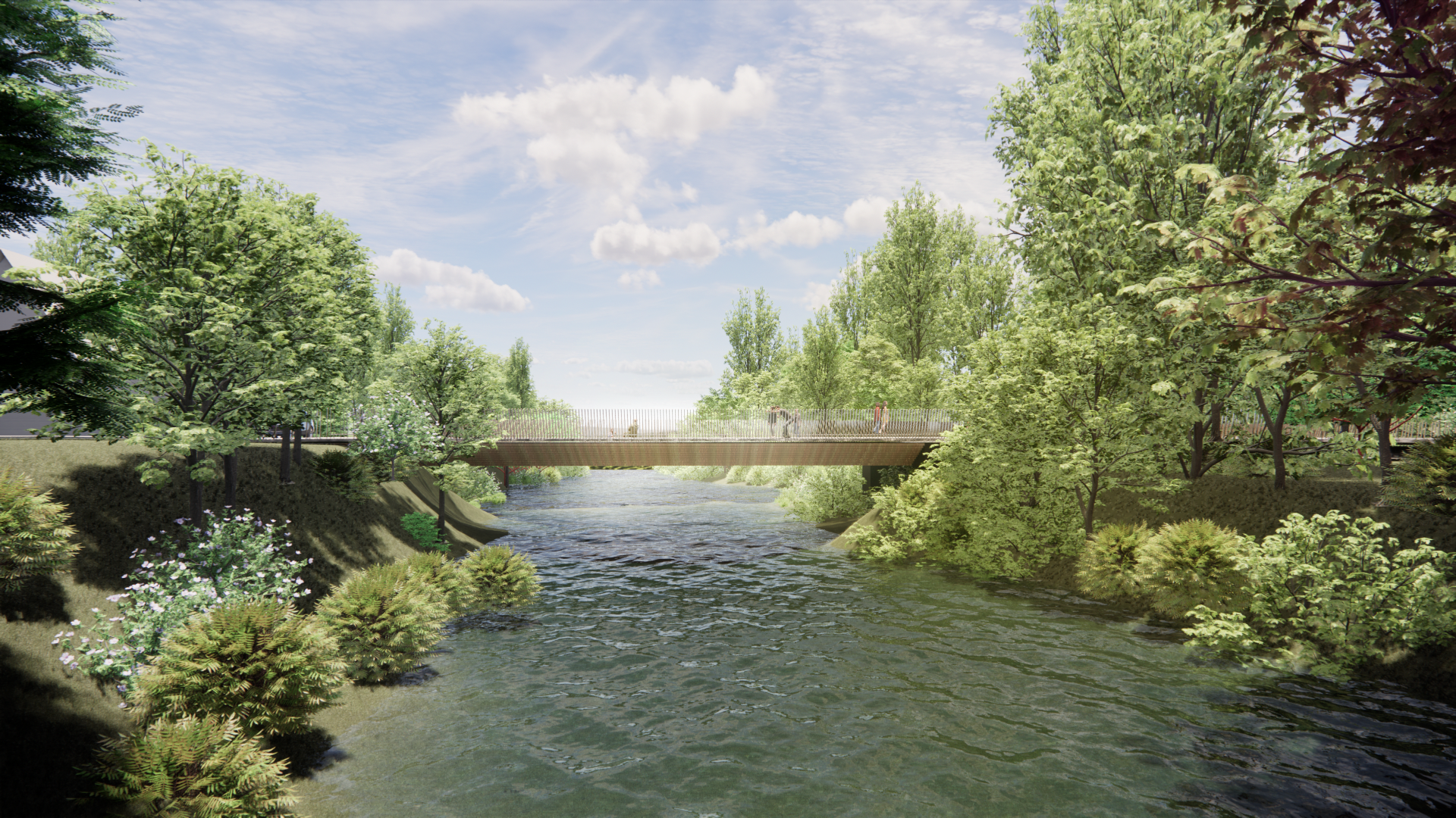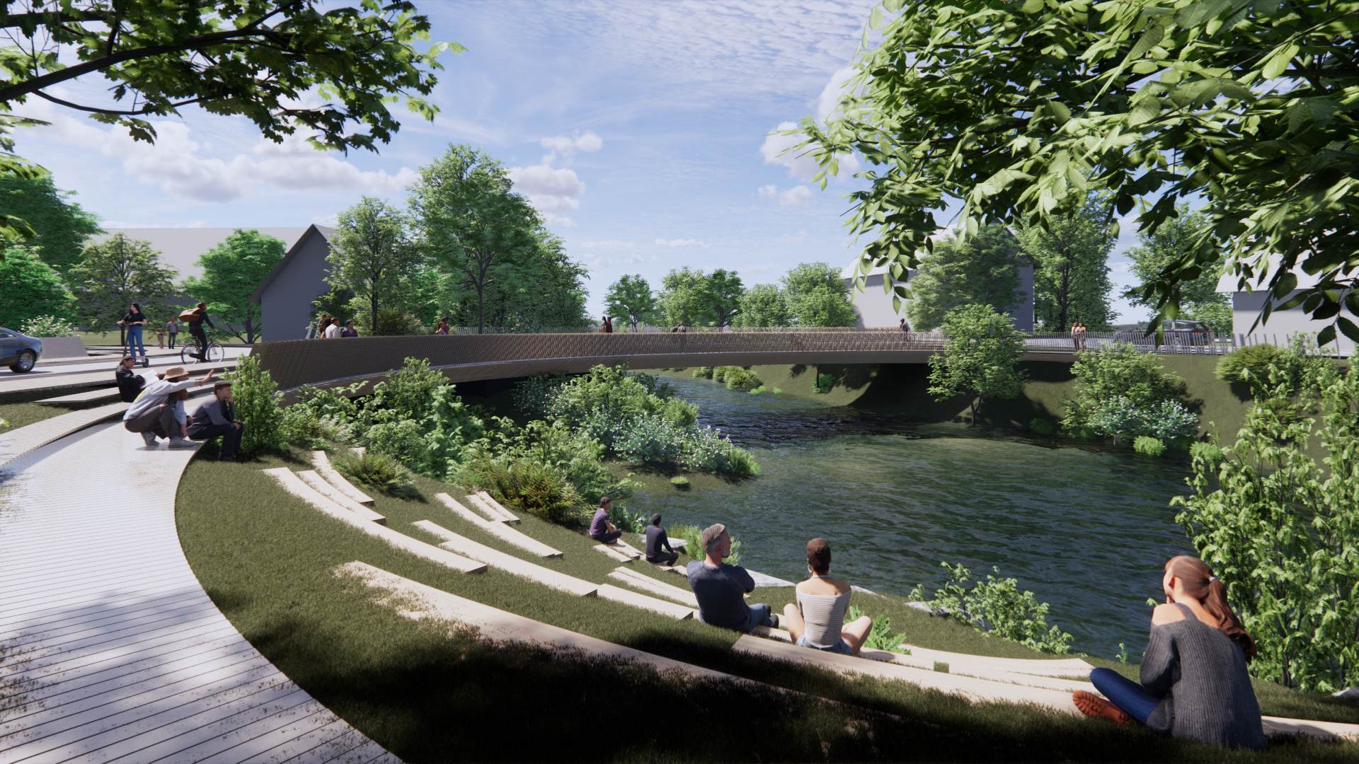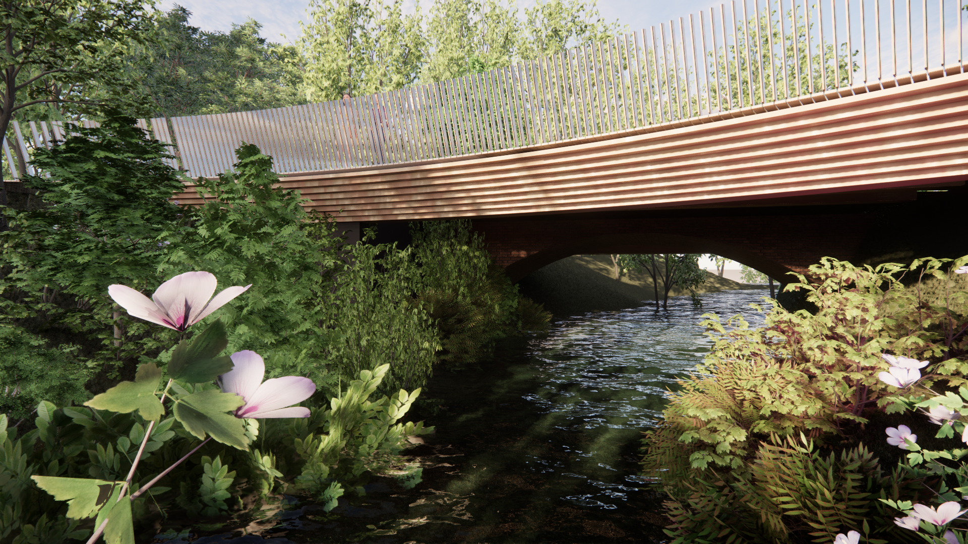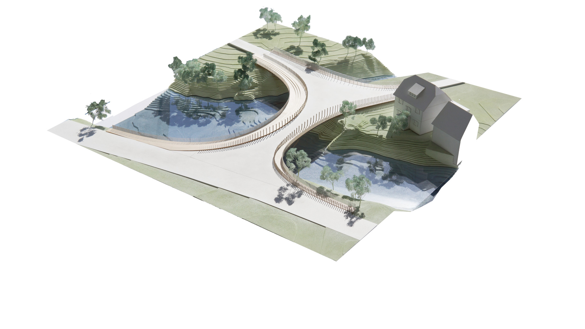 Located in the forests of Southern Germany, at the confluence of two historically important rivers, the circular design of this bridge heightens the connection to its surroundings, providing a sensorial experience of the forest, the water, and the public. The structure, composed of locally sourced timber planks that are laminated together, is integrated into a gesture that adapts to pedestrian, bicycle, and vehicular flows. The layers of this assembly extend to become an amphitheater-like set of steps that merge with the landscape, terracing down to the water’s edge. The landscape includes a small park that blends Japanese and German gardening traditions, while the railing, composed of mirrored steel and roughly hewn wood planks, reflects the regions’ historical timber culture.