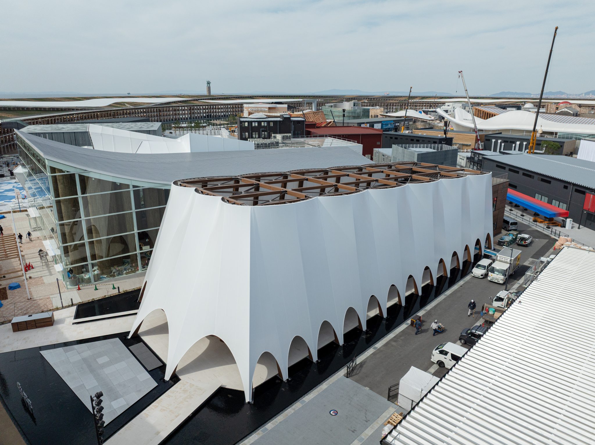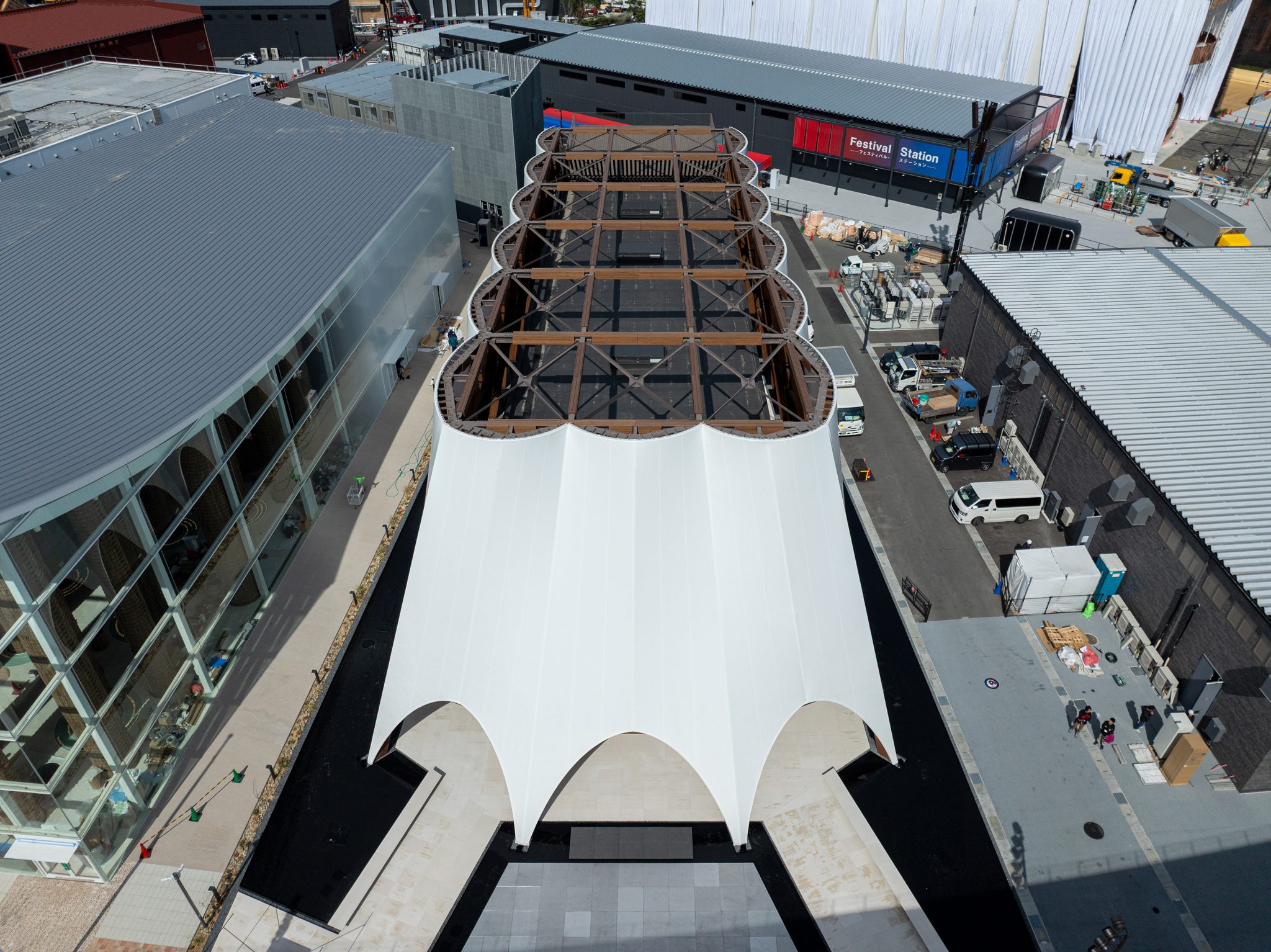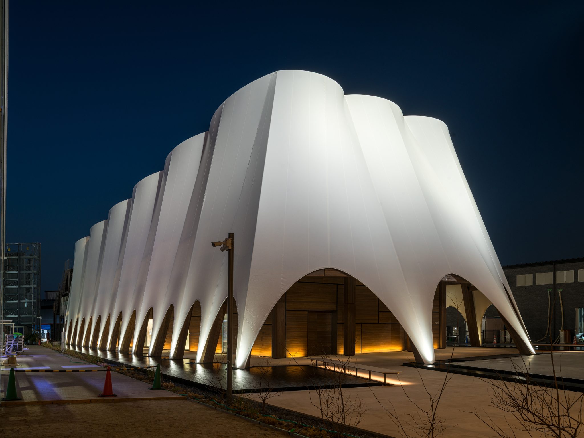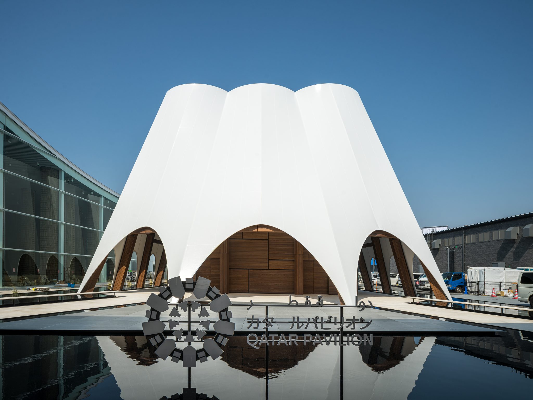 Using a traditional Qatari wooden dhow boat, the pavilion was designed to express the connection between Qatar and Japan, two countries that share the same seafaring heritage. A white membrane, reminiscent of a ship’s sail, covers the wooden exhibition space, and a ship floating on the sea is created by the surrounding water table.
