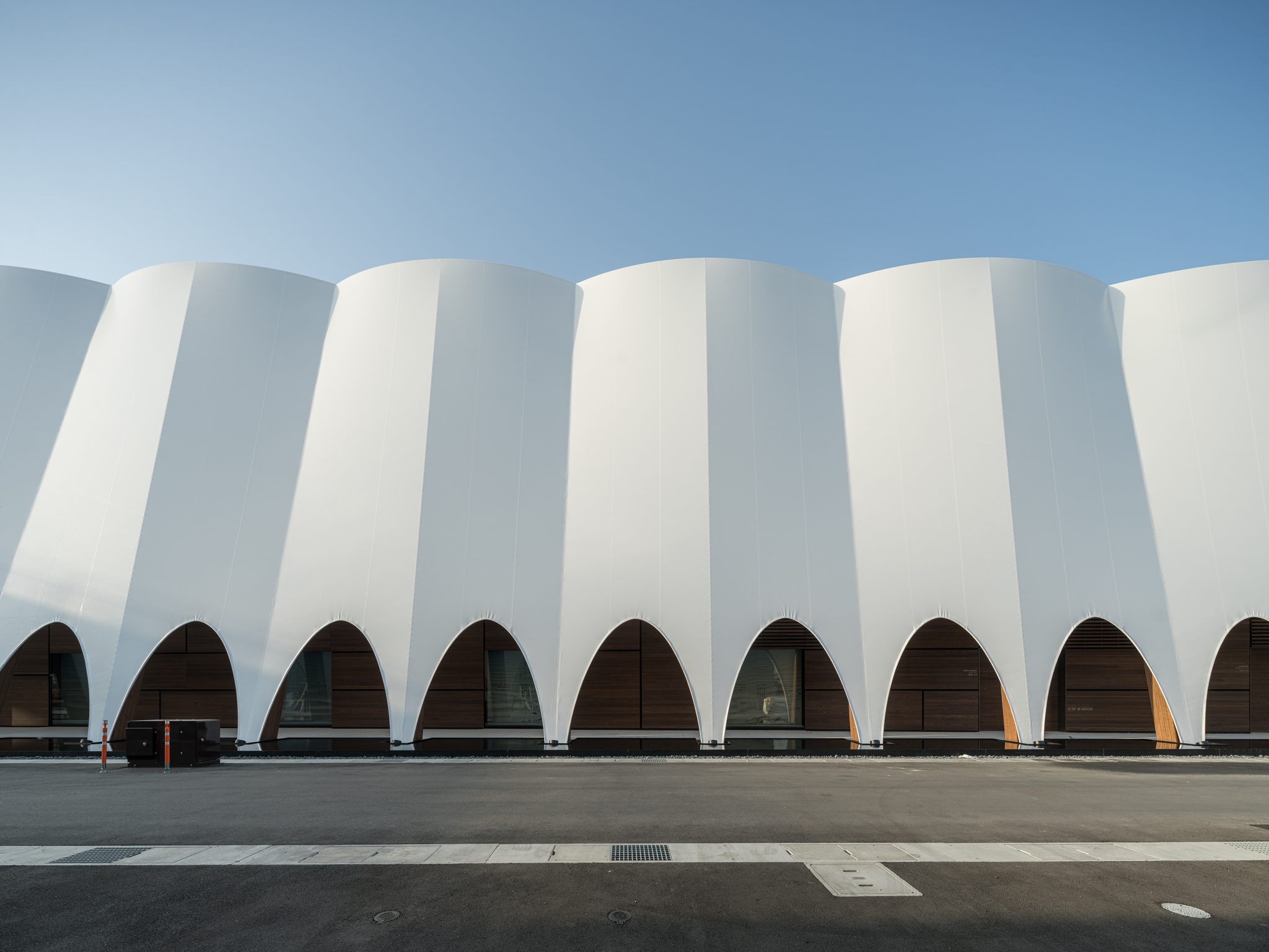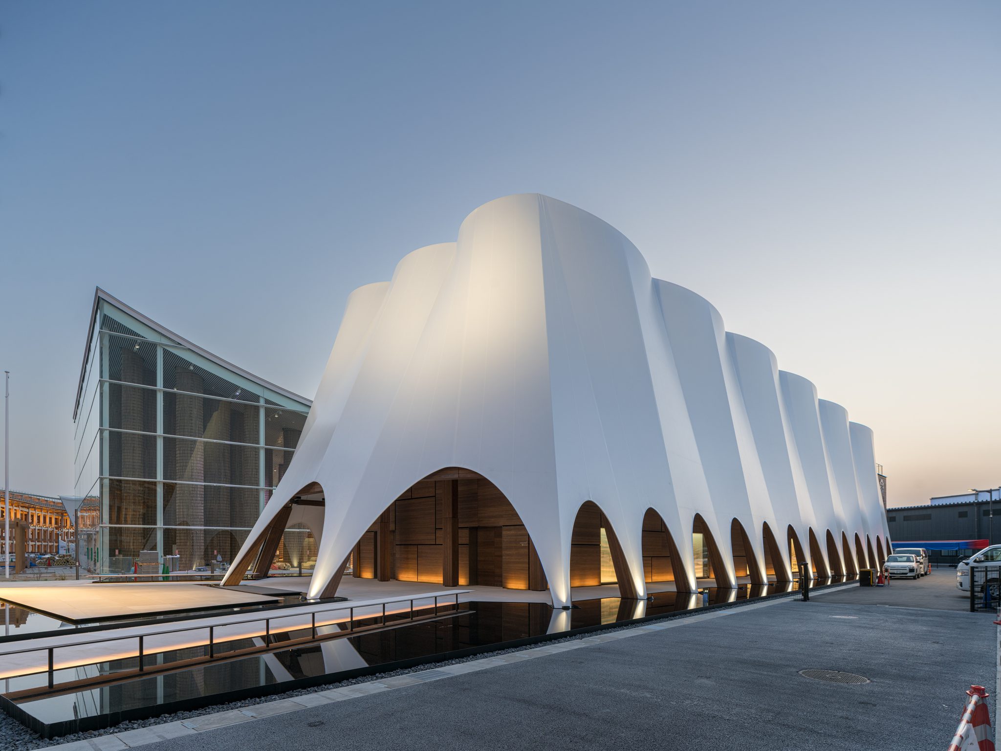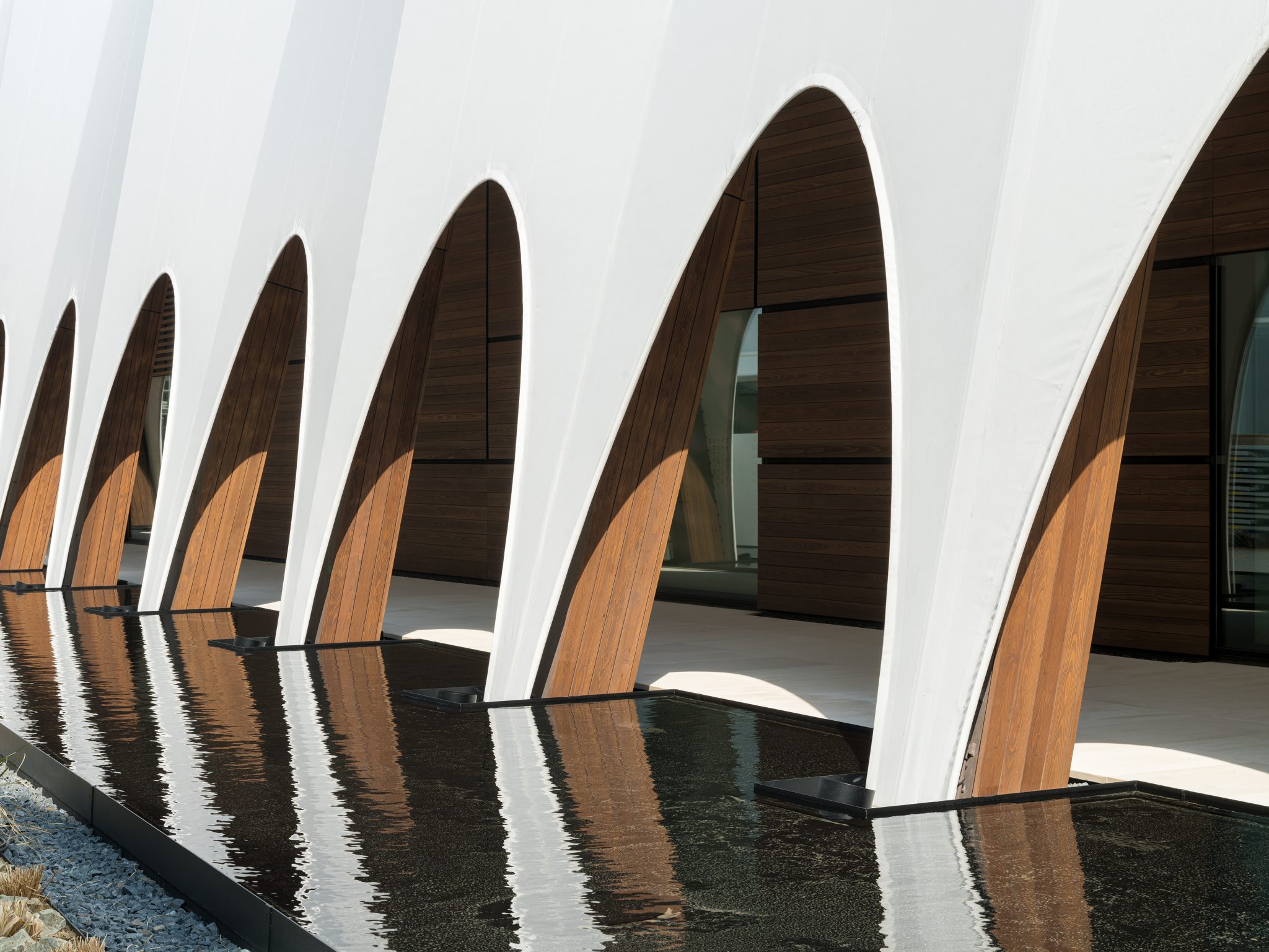 The membrane is curved like a sail in the wind and connected to a series of symbolic arches at the foot of the building, creating a seaside promenade that evokes Islamic geometry.