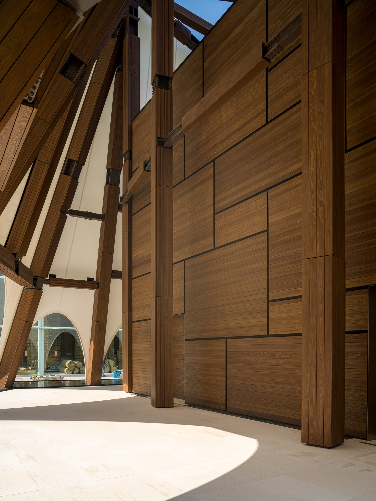The wooden box built inside the membrane is finished with cedar paneling and coated with three different colors of paint to replicate the color of the century-old dhow boats.